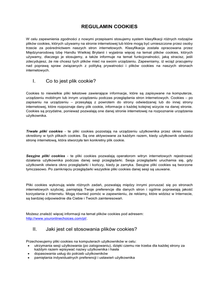 REGULAMIN COOKIES I. Co to jest plik cookie? II. Jaki jest cel