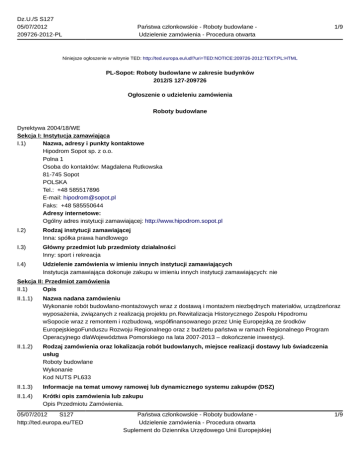 Dz.U./S S127 05/07/2012 209726-2012-PL Państwa członkowskie - Roboty budowlane Udzielenie zamówienia - Procedura otwarta 1/9 Niniejsze ogłoszenie w witrynie TED: http://ted.europa.eu/udl?uri=TED:NOTICE:209726-2012:TEXT:PL:HTML PL-Sopot: Roboty budowlane w zakresie budynków 2012/S 127-209726 Ogłoszenie o udzieleniu zamówienia Roboty budowlane Dyrektywa 2004/18/WE Sekcja I: Instytucja zamawiająca I.1) Nazwa, adresy i punkty kontaktowe Hipodrom Sopot sp. z o.o. Polna 1 Osoba do kontaktów: Magdalena Rutkowska 81-745 Sopot POLSKA Tel.: +48 585517896 E-mail: [email protected] Faks: +48 585550644 Adresy internetowe: Ogólny adres instytucji zamawiającej: http://www.hipodrom.sopot.pl I.2) Rodzaj instytucji zamawiającej Inna: spółka prawa handlowego I.3) Główny przedmiot lub przedmioty działalności Inny: sport i rekreacja I.4) Udzielenie zamówienia w imieniu innych instytucji zamawiających Instytucja zamawiająca dokonuje zakupu w imieniu innych instytucji zamawiających: nie Sekcja II: Przedmiot zamówienia II.1) Opis II.1.1) Nazwa nadana zamówieniu Wykonanie robót budowlano-montażowych wraz z dostawą i montażem niezbędnych materiałów, urządzeńoraz wyposażenia, związanych z realizacją projektu pn.Rewitalizacja Historycznego Zespołu Hipodromu wSopocie wraz z remontem i rozbudową, współfinansowanego przez Unię Europejską ze środków EuropejskiegoFunduszu Rozwoju Regionalnego oraz z budżetu państwa w ramach Regionalnego Program Operacyjnego dlaWojewództwa Pomorskiego na lata 2007-2013 – dokończenie inwestycji. II.1.2) Rodzaj zamówienia oraz lokalizacja robót budowlanych, miejsce realizacji dostawy lub świadczenia usług Roboty budowlane Wykonanie Kod NUTS PL633 II.1.3) Informacje na temat umowy ramowej lub dynamicznego systemu zakupów (DSZ) II.1.4) Krótki opis zamówienia lub zakupu Opis Przedmiotu Zamówienia. 05/07/2012 S127 http://ted.europa.eu/TED Państwa członkowskie - Roboty budowlane Udzielenie zamówienia - Procedura otwarta Suplement do Dziennika Urzędowego Unii Europejskiej 1/9 Dz.U./S S127 05/07/2012 209726-2012-PL Państwa członkowskie - Roboty budowlane Udzielenie zamówienia - Procedura otwarta 2/9 1. Uwaga wstępna: Przedmiotem zamówienia jest wykonanie robót budowlanych związanych z rewitalizacją obecnego zespołu Hipodromu w Sopocie i obejmuje docelowo całość prac inwestycyjnych, polegających na budowie, rozbudowie oraz remoncie istniejących budynków oraz zagospodarowania terenu. Część robót została wykonana w 2011 roku. Opis zakresu robót wykonanych w roku 2011 zamieszczono w ustępie nr 5 niniejszego rozdziału. 2. Opis ogólny docelowego procesu rewitalizacji Hipodromu Rewitalizacja obecnego zespołu Hipodromu w Sopocie obejmuje docelowo całość prac inwestycyjnych, polegających na budowie, rozbudowie oraz remoncie istniejących budynków oraz zagospodarowaniu terenu.Docelowym efektem projektowanych prac ma być uzyskanie nowoczesnego hippicznego ośrodka sportowo-rekreacyjnego, którego głównym i niezmiennym trzonem ma być zabytkowy zespół Hipodromu z rozległym terenem zielonym. Inwestycja związana z rewitalizacją Hipodromu jest zamierzeniem bardzo zróżnicowanym zarówno w zakresie finansowania wykonywanych robót budowlanych jak i w zakresie rzeczowym oraz położeniu obszarów nimi objętych. Dodatkowym utrudnieniem jest konieczność zachowania ciągłości funkcjonowania sportoworekreacyjnych usług Hipodromu w trakcie prowadzenia prac wykonawczych. 3. projektowane zagospodarowanie terenu: Układ przestrzenny: Projekt rewitalizacji hipodromu obejmuje przeważającą część obecnego układu przestrzennego, z wyłączeniem części przeznaczonej pod węzeł komunikacyjny o pow. ok. 4,5 ha. Fakt ten wpływa jednak na perspektywiczną konieczność przebudowy całości układu pasa południowego założenia, na południe od toru wyścigowego. Pas zachodni z obiektami zabytkowymi podlega fragmentarycznym zmianom związanym jedynie z remontem i przebudowa obiektów nr 7 AB, 9, 14. Zespół w stanie projektowanym posiada wyraźny podział na dwa typy funkcji: — w pasie zachodnim, związanym obiektami historycznymi, przewidziano lokalizację funkcji związanych głównie z zawodami konnymi sezonowymi w terenie otwartym. Są to: budynki dżokejów nr 7AB, trybunasędziowska [nr 9] obsługująca gonitwy, oraz zawody w skokach lub ujeżdżeniu. Przewiduje się także remont zprzebudową portierni od ul. Polnej [nr 14], — w pasie południowym: projektuje się zmianę przebiegu wyścigowego toru zielonego oraz płyty głównej. W części wschodniej, po korektach linii toru, powstaną nowe wybiegi dla koni oraz Hippiczny Park Rozrywki, — w pasie południowym, aranżowanym całkowicie we współczesny sposób, zlokalizowano głównie funkcje gospodarskie z rozbudowaną halą dawnej ujeżdżalni. Podstawą tego zespołu są rozczłonkowane budynki stajni rekreacyjnych oraz sportowych, gdzie umiejscowiono pełen program do funkcji „stajennych”, ale i także hipoterapii oraz 2 mniejszych hal ujeżdżalni-rozprężalni, gdzie mogą się odbywać zajęcia całoroczne. W centrum zaprojektowano rozbudowaną halę dotychczasowej ujeżdżalni, przystosowując ją do zawodów z widownią na 700 osób. Obiekt ten posiada także skrzydło biurowe i edukacyjne oraz pokoje gościnne dla gości i uczestników imprez lub szkoleń. Hala stanowi także pod względem programu uzupełnienie gastronomiczne i sanitarne dla zewnętrznego Hippicznego Parku Rozrywki. Obiekt ten będzie przedmiotem innego postępowania. Szczegółowy opis przedmiotu zamówienia zawiera dokumentacja projektowa architektoniczno-budowlana i wykonawcza oraz specyfikacja techniczna wykonania i odbioru robót, stanowiące Załącznik A do SIWZ (pliki elektroniczne). 4. Numeracja obiektów i opis funkcji: — nr 1 stajnie rekreacyjne – funkcje stajni dla 74 koni rekreacyjnych z zapleczem, halą rozprężalni i zespołem hipoterapii. Magazyn 