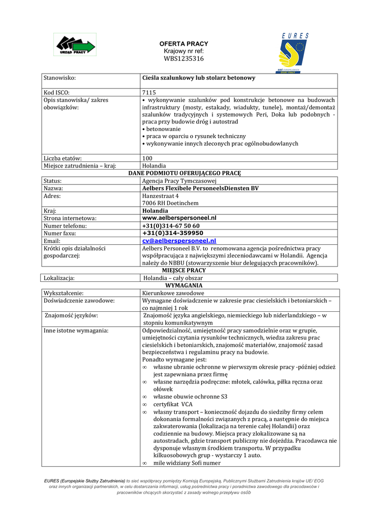OFERTA PRACY Krajowy nr ref: WBS1235316 Stanowisko: Cieśla szalunkowy lub stolarz betonowy Kod ISCO: Opis stanowiska/ zakres obowiązków: 7115 • wykonywanie szalunków pod konstrukcje betonowe na budowach infrastruktury (mosty, estakady, wiadukty, tunele), montaż/demontaż szalunków tradycyjnych i systemowych Peri, Doka lub podobnych praca przy budowie dróg i autostrad • betonowanie • praca w oparciu o rysunek techniczny • wykonywanie innych zleconych prac ogólnobudowlanych Liczba etatów: Miejsce zatrudnienia – kraj: Status: Nazwa: Adres: Kraj: Strona internetowa: Numer telefonu: Numer faxu: Email: Krótki opis działalności gospodarczej: Lokalizacja: Wykształcenie: Doświadczenie zawodowe: Znajomość języków: Inne istotne wymagania: 100 Holandia DANE PODMIOTU OFERUJĄCEGO PRACĘ Agencja Pracy Tymczasowej Aelbers Flexibele PersoneelsDiensten BV Hanzestraat 4 7006 RH Doetinchem Holandia www.aelberspersoneel.nl +31(0)314-67 50 60 +31(0)314-359950 [email protected] Aelbers Personeel B.V. to renomowana agencja pośrednictwa pracy współpracująca z największymi zleceniodawcami w Holandii. Agencja należy do NBBU (stowarzyszenie biur delegujących pracowników). MIEJSCE PRACY Holandia – cały obszar WYMAGANIA Kierunkowe zawodowe Wymagane doświadczenie w zakresie prac ciesielskich i betoniarskich – co najmniej 1 rok Znajomość języka angielskiego, niemieckiego lub niderlandzkiego – w stopniu komunikatywnym Odpowiedzialność, umiejętność pracy samodzielnie oraz w grupie, umiejętności czytania rysunków technicznych, wiedza zakresu prac ciesielskich i betoniarskich, znajomość materiałów, znajomość zasad bezpieczeństwa i regulaminu pracy na budowie. Ponadto wymagane jest: • własne ubranie ochronne w pierwszym okresie pracy -później odzież jest zapewniana przez firmę • własne narzędzia podręczne: młotek, calówka, piłka ręczna oraz ołówek • własne obuwie ochronne S3 • certyfikat VCA • własny transport – konieczność dojazdu do siedziby firmy celem dokonania formalności związanych z pracą, a następnie do miejsca zakwaterowania (lokalizacja na terenie całej Holandii) oraz codziennie na budowy. Miejsca pracy zlokalizowane są na autostradach, gdzie transport publiczny nie dojeżdża. Pracodawca nie dysponuje własnym środkiem transportu. W przypadku kilkuosobowych grup - wystarczy 1 auto. • mile widziany Sofi numer EURES (Europejskie Służby Zatrudnienia) to sieć współpracy pomiędzy Komisją Europejską, Publicznymi Służbami Zatrudnienia krajów UE/ EOG oraz innych organizacji partnerskich, w celu dostarczania informacji, usług pośrednictwa pracy i poradnictwa zawodowego dla pracodawców i pracowników chcących skorzystać z zasady wolnego przepływu osób WYNAGRODZENIE I WARUNKI ZATRUDNIENIA Min. 13,65 – wysokość pensji uzależniona od doświadczenia + 8% dodatku urlopowego Waluta, w jakiej wypłacana jest Euro pensja: Rodzaj stawki wynagrodzenia: Godzinowa – pensja wypłacana co tydzień Nazwa firmy, z którą zostanie podpisana umowa: Wysokość pensji brutto: Aelbers Flexibele PersoneelsDiensten BV Rodzaj umowy: Umowa o pracę Wymiar czasu pracy: Pełny Czas trwania umowy: (nieokreślony/ określony) Liczba godzin tygodniowo: Data rozpoczęcia: Określony – co najmniej 2 lata – z możliwością przedłużenia Inne: 40-45 Od zaraz - do uzgodnienia z pracodawcą Pracodawca oferuje zakwaterowanie oraz zwrot kosztów podróży z Polski do Holandii, zwrot kosztów dojazdu do pracy, opiekę polskiego koordynatora, możliwość nauki języka niderlandzkiego oraz ukończenia kursu brygadzisty. Wymagane dokumenty (list motywacyjny, CV itp.): Język, w którym muszą być sporządzone przedkładane dokumenty: Do kogo należy wysłać dokumenty: (do pracodawcy/ doradcy EURES) Gdzie należy wysłać dokumenty: (adres, adres e-mail, nr faksu z kodem kraju itp.) Dane teleadresowe doradcy EURES lub przedstawiciela pracodawcy: SPOSÓB SKŁADANIA WNIOSKU CV z opisem wymaganego doświadczenia Język polski/angielski/niemiecki Kandydaci proszeni są o przesłanie CV do doradcy EURES z Wojewódzkiego Urzędu Pracy w Białymstoku email: [email protected] – w tytule emaila proszę wpisać - Holandia - Cieśla szalunkowy lub stolarz betonowy Tel. 85 74 97 235 WUP w Białymstoku, ul. Pogodna 22 15-354 Białystok Przedstawiciel pracodawcy: Pani Justyna Markiewicz, email [email protected] Nr tel.: 0031-612-053-096 Data publikacji: Termin przedkładania podań o pracę / zakończenia ważności oferty: WAŻNOŚĆ 10.03.2016 r. Do odwołania Uprzejmie informujemy, że skontaktujemy się wyłącznie z wybranymi kandydatami. Agencja pracy tymczasowej Aelbers Flexibele PersoneelsDiensten BV oświadczyła, że prowadzi działalność zgodnie z przepisami obowiązującymi na terenie Holandii. Publiczne służby zatrudnienia w Holandii nie posiadają uprawnień do potwierdzenia legalności działania Agencji pracy tymczasowej DDD Personeel B.V. UWAGA: 1. Umowa z zagranicznym pracodawcą zostanie zawarta zgodnie z prawem kraju zatrudnienia. Oznacza to, że wszystkie roszczenia odnośnie do warunków, które obejmuje umowa, można kierować wyłącznie do odpowiedniego sądu w kraju zatrudnienia. Publiczne służby zatrudnienia (EURES) nie mogą pośredniczyć ani reprezentować pracownika w sądzie kraju zatrudnienia w przypadku sporu z pracodawcą. 2. Publiczne służby zatrudnienia (EURES) dokładają wszelkich starań, aby zapewnić rzetelność i wiarygodność ofert pracy zgłoszonych w lokalnym urzędzie pracy. Należy wyjaśnić, że oferta pracy została zgłoszona przez stronę trzecią i EURES nie odpowiada za ewentualne rozbieżności między warunkami pracy określonymi w ofercie pracy i warunkami oferowanymi przez potencjalnego pracodawcę. 3. Publiczne służby zatrudnienia (EURES) informują, że będą zbierać, przetwarzać i przekazywać potencjalnym pracodawcom zgodnie z przepisami dotyczącymi ochrony danych 