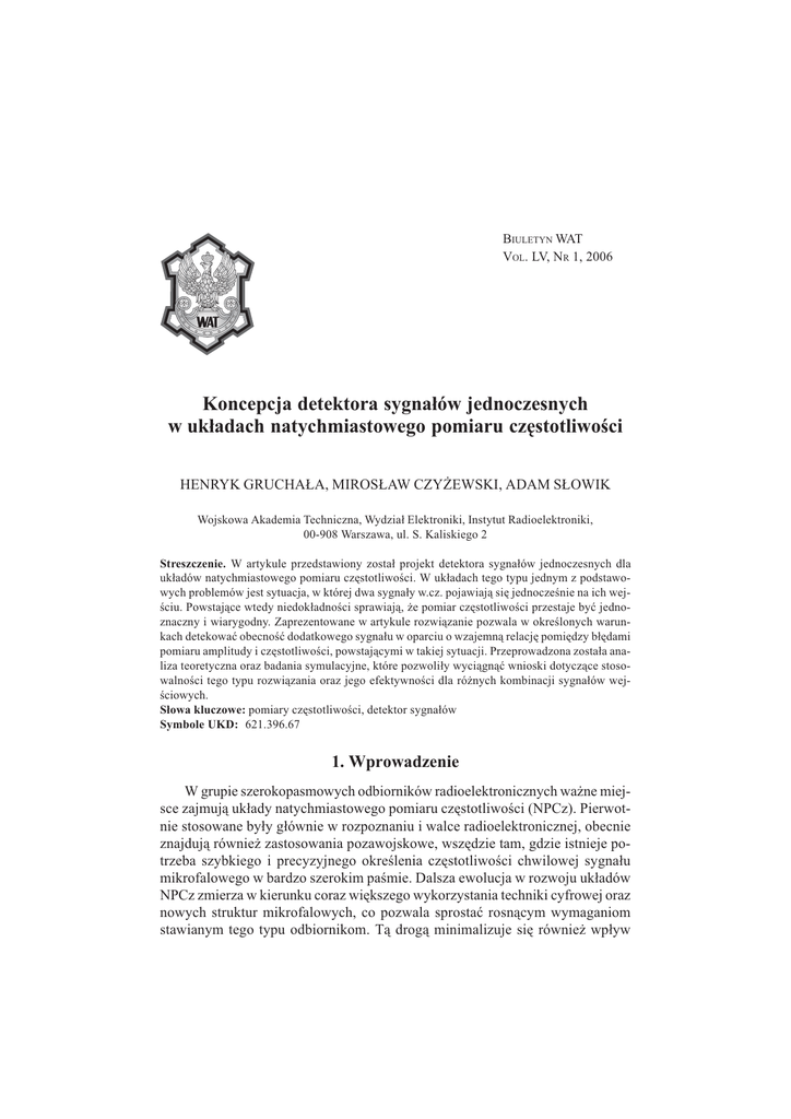 BIULETYN WAT VOL. LV, NR 1, 2006 Koncepcja detektora sygna³ów jednoczesnych w uk³adach natychmiastowego pomiaru czêstotliwoci HENRYK GRUCHA£A, MIROS£AW CZY¯EWSKI, ADAM S£OWIK Wojskowa Akademia Techniczna, Wydzia³ Elektroniki, Instytut Radioelektroniki, 00-908 Warszawa, ul. S. Kaliskiego 2 Streszczenie. W artykule przedstawiony zosta³ projekt detektora sygna³ów jednoczesnych dla uk³adów natychmiastowego pomiaru czêstotliwoci. W uk³adach tego typu jednym z podstawowych problemów jest sytuacja, w której dwa sygna³y w.cz. pojawiaj¹ siê jednoczenie na ich wejciu. Powstaj¹ce wtedy niedok³adnoci sprawiaj¹, ¿e pomiar czêstotliwoci przestaje byæ jednoznaczny i wiarygodny. Zaprezentowane w artykule rozwi¹zanie pozwala w okrelonych warunkach detekowaæ obecnoæ dodatkowego sygna³u w oparciu o wzajemn¹ relacjê pomiêdzy b³êdami pomiaru amplitudy i czêstotliwoci, powstaj¹cymi w takiej sytuacji. Przeprowadzona zosta³a analiza teoretyczna oraz badania symulacyjne, które pozwoli³y wyci¹gn¹æ wnioski dotycz¹ce stosowalnoci tego typu rozwi¹zania oraz jego efektywnoci dla ró¿nych kombinacji sygna³ów wejciowych. S³owa kluczowe: pomiary czêstotliwoci, detektor sygna³ów Symbole UKD: 621.396.67 1. Wprowadzenie W grupie szerokopasmowych odbiorników radioelektronicznych wa¿ne miejsce zajmuj¹ uk³ady natychmiastowego pomiaru czêstotliwoci (NPCz). Pierwotnie stosowane by³y g³ównie w rozpoznaniu i walce radioelektronicznej, obecnie znajduj¹ równie¿ zastosowania pozawojskowe, wszêdzie tam, gdzie istnieje potrzeba szybkiego i precyzyjnego okrelenia czêstotliwoci chwilowej sygna³u mikrofalowego w bardzo szerokim pamie. Dalsza ewolucja w rozwoju uk³adów NPCz zmierza w kierunku coraz wiêkszego wykorzystania techniki cyfrowej oraz nowych struktur mikrofalowych, co pozwala sprostaæ rosn¹cym wymaganiom stawianym tego typu odbiornikom. T¹ drog¹ minimalizuje siê równie¿ wp³yw 152 H. Grucha³a, M. Czy¿ewski, A. S³owik niekorzystnych zjawisk wystêpuj¹cych w takich strukturach, wród których na plan pierwszy wysuwa siê problem sygna³ów jednoczesnych. W sytuacji gdy na wejciu prostego uk³adu NPCz (rys. 1) pojawi¹ siê dwa lub wiêcej sygna³ów w.cz. jednoczenie, mierzona czêstotliwoæ bêdzie funkcj¹ czêstotliwoci wszystkich sygna³ów wejciowych, w zwi¹zku z tym dok³adny pomiar staje siê niemo¿liwy. Natomiast w z³o¿onych, wielokana³owych strukturach mikrofalowych, przy zastosowaniu odpowiednich algorytmów obróbki cyfrowej wp³yw tego niekorzystnego zjawiska mo¿e zostaæ w znacz¹cy sposób zmniejszony. Wród stosowanych w tym zakresie rozwi¹zañ znajduje siê detektor sygna³ów jednoczesnych (DSJ), który dla wielokana³owej struktury odbiornika NPCz w okrelonych warunkach sygnalizuje obecnoæ dodatkowego sygna³u. Dzielnik mocy Sprzêgacz 90o Dzielnik mocy Sinus Sprzêgacz 90o Sprzêgacz 90o Cosinus Z0 Uk³ad wpracowania proporcjonalnej ró¿nicy fazy Mikrofalowy Dyskryminator Fazy Rys. 1. Schemat mikrofalowego dyskryminatora czêstotliwoci 2. Przetwarzanie sygna³ów jednoczesnych w uk³adzie NPCZ Przedstawiony w artykule projekt detektora sygna³ów jednoczesnych stanowi model matematyczny obróbki cyfrowej danych wyjciowych otrzymywanych w wielokana³owym uk³adzie NPCz. Ka¿dy z kana³ów zbudowany jest w oparciu o mikrofalowy dyskryminator czêstotliwoci przedstawiony na rysunku 1. Uk³ad ten w pierwszym etapie zamienia czêstotliwoæ chwilow¹ sygna³u wejciowego na ró¿nicê fazy, a nastêpnie realizuje jej pomiar w mikrofalowym dyskryminatorze fazy. Otrzymane w ten sposób amplitudy napiêæ w kanale sinus i cosinus zawieraj¹ jednoznaczn¹ informacjê o czêstotliwoci sygna³u wejciowego. Zakres jednoznacznego pomiaru takiego uk³adu cile powi¹zany jest z d³ugoci¹ linii zastosowanej w uk³adzie wypracowania proporcjonalnej ró¿nicy fazy [1, 2]. Uk³ad wielokana³owy (rys. 2) pozwala na zastosowanie metod obróbki cyfrowej, które, w przeciwieñstwie do metod analogowych opartych na bezporednim pomiarze wartoci napiêæ, wykorzystuj¹ wzajemne relacje pomiêdzy tymi Koncepcja detektora sygna³ów jednoczesnych... DYSKRYMINATOR Linia LD x1 DYSKRYMINATOR Linia LD x2 WZMACNIACZ OGRANICZNIK fwcz UK£AD PODZIA£U MOCY DYSKRYMINATOR Linia LD x4 DYSKRYMINATOR Linia LD x8 DYSKRYMINATOR Linia LD x 16 153 sin x1 cos sin x2 cos sin cos x4 sin x8 cos sin cos x16 Rys. 2. Struktura piêciokana³owego uk³adu NPCz napiêciami. Na ich podstawie wyznaczana jest czêstotliwoæ z dok³adnoci¹ do przedzia³u, w którym te relacje pozostaj¹ sta³e. W uk³adzie wielokana³owym stosuj¹c ró¿ne d³ugoci linii, mo¿na regulowaæ szerokoci tych przedzia³ów. W pierwszym kanale, o najkrótszej linii, zakres jednoznacznego pomiaru jest najszerszy, ale dok³adnoæ okrelenia czêstotliwoci jest najmniejsza. W zwi¹zku z tym kana³ ten jest kana³em zgrubnym determinuj¹cym pasmo ca³ego uk³adu, które równe jest jego zakresowi jednoznacznego pomiaru. Za dok³adnoæ ca³ego uk³adu odpowiada za kana³ o najd³u¿szej linii, dla którego te przedzia³y s¹ najmniejsze. Pozosta³e kana³y pe³ni¹ rolê poredni¹ pomiêdzy nimi, dostarczaj¹c niezbêdnych informacji, tak aby na wyjciu ca³ego uk³adu otrzymaæ czêstotliwoæ chwilow¹ w postaci s³owa bitowego [3]. Ujemn¹ stron¹ zastosowania uk³adu wielokana³owego jest koniecznoæ podzia³u sygna³u wejciowego, co znacz¹co obni¿a czu³oæ ca³ego uk³adu. Aby zrównowa¿yæ to niekorzystne zjawisko, na wejciu takiego uk³adu zastosowany zosta³ wzmacniacz z ogranicznikiem. Dodatkow¹ zalet¹ tego typu rozwi¹zania jest ograniczenie innych niekorzystnych zjawisk zwi¹zanych z detekcj¹ liniow¹ czy z omawianym tu sygna³em jednoczesnym [4]. Wzmacniacz z ogranicznikiem w sytuacji gdy pojawia siê dodatkowy sygna³ o niskim poziomie powoduje jego t³umienie wzglêdem sygna³u silniejszego, co znacz¹co obni¿a jego wp³yw na pomiar koñcowy. W sytuacji gdy poziomy obydwu sygna³ów bêd¹