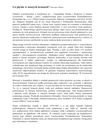 Co płynie w naszych kranach? Mirosław Wilusz Ostatnio uczestniczyłem w konferencji pt.: „ Gospodarka Wodna i Ściekowa w Gminie Lesznowola – dzisiaj i jutro”, zorganizowanej przez Lesznowolskie Przedsiębiorstwo Komunalne Sp. z o.o. i Wójta Gminy Lesznowola. Jednymi z prelegentów byli prof. dr hab. inż. Zbigniew Heidrich oraz dr inż. Jacek Wąsowski z Politechniki Warszawskiej. Obaj panowie podkreślili jedną rzecz, z którą coraz częściej mamy do czynienia w dzisiejszym świecie. Chodzi o coraz bardziej skażone środowisko, w tym oczywiście wody gruntowe. Według dr. Wąsowskiego główną przyczyną takiego stanu rzeczy jest przedostawanie się azotanów do wód gruntowych. Związek ten jest przyczyną wielu chorób zakaźnych w tym nawet chorób nowotworowych. Głównymi źródłami zanieczyszczeń wód gruntowych są nawozy chemiczne użytkowane w rolnictwie, zanieczyszczona woda deszczowa, a nawet, co jest pewnym novum, antybiotyki na coraz większą skalę stosowane w rolnictwie. Moją uwagę zwróciły również informacje o badaniach przeprowadzonych w województwie mazowieckim a dotyczące zbiorników szczelnych, czyli tzw. szamb. Otóż Prof. Heidrich zwrócił uwagę na bardzo niepokojące dane. Wynika z nich, że tylko około 11% ścieków zgromadzonych w przydomowych szambach jest regularnie wywożona i utylizowana zgodnie z obowiązującymi przepisami. „Brakująca reszta” najprawdopodobniej trafia do gruntu w formie azotanów, powodując skażenie środowiska, w tym niestety również wód gruntowych. Z badań naukowców wynika, że najbezpieczniejszym dla środowiska rozwiązaniem jest odprowadzanie ścieków do systemu zbiorczego kanalizacji. Tylko dobrze rozbudowana sieć kanalizacji daję gwarancję, że ścieki nie przedostaną się do środowiska naturalnego. Oczywiście nie każda gmina posiada odpowiednią infrastrukturę, aby zapewnić możliwość odprowadzania ścieków. W gminach wiejskich województwa mazowieckiego tylko 26,5% nieruchomości ma dostęp do zbiorczych systemów kanalizacji. W Lesznowoli jest to ponad 85%. Również w kontekście debaty o wodach gruntowych warto przyjrzeć się temu, co płynie w naszych kranach. Temat jest rzadko poruszany gdyż większość z nas wychodzi z założenia, że woda w kranie była, jest i będzie, i że jest ona dana raz na zawsze. Nic bardziej mylnego. To, że w naszych kranach płynie woda jest skutkiem dużych nakładów finansowych ponoszonych na bieżącą konserwację systemu wodociągowego. Nad bezpieczeństwem i jakością wody płynącej w naszych kranach czuwa sztab ludzi, którzy nieustannie monitorują sytuację. Woda dla mieszkańców Mysiadła i Nowej Iwicznej pochodzi ze stacji uzdatniania wody w Mysiadle, zlokalizowanej przy ulicy Geodetów 28 E, której wydajność wynosi 2000 m3 wody na dobę. Stacja wybudowana została w latach 1979-1981 a w jej skład wchodzi budynek technologiczny; betonowy zbiornik wody uzdatnionej o poj. 1000 m3; zbiornik wód tzw. popłucznych; dwie studnie głębinowe czerpiące wodę z pokładów czwartorzędowych położonych na głębokości 100 metrów. W ostatnim czasie rozpoczął się kompleksowy remont tego obiektu prowadzony przez Lesznowolskie Przedsiębiorstwo Komunalne. Natomiast w samym budynku stacji, po zakończeniu kompleksowego remontu, trwają prace przy automatyce i mechanice. Przeszłość i teraźniejszość Stacji Uzdatniania Wody Mysiadło. Obecnie trwa wymiana wszystkich elementów automatyki i mechaniki pochodzących jeszcze z lat 80. zastępowanych najnowszą technologią. . Okablowanie z lat 80. i nowoczesna szafa automatyczna. Woda, która płynie w naszych kranach jest dość twarda, ale jest zdrowa i zawiera dużo minerałów. Na stronie LPK Sp. z o.o. dostępne są wyniki badań a także stopień twardości wody. Woda w Mysiadle ma status wody twardej, co szczególnie widoczne jest podczas eksploatowania sprzętu AGD i armatury sanitarnej - urządzenia wymagają stałej konserwacji oraz wykorzystania środków do usuwania kamienia. Natomiast w kontekście walorów konsumpcyjnych sprawa wygląda znacznie lepiej. Kamień w wodzie to przede wszystkim źródło minerałów takich jak wapń i magnez. Jeżeli wierzyć słowom prof. Juliana Aleksandrowicza to „zdrowie i życie człowieka zależy w dużej mierze od rodzaju i jakości wody, którą, na co dzień pije”. Naukowiec ten jest twórcą Polskiego Towarzystwa Magnezologicznego, które zajmuję się badaniem wpływu na organizm człowieka biopierwiastków zawartych w wodach, szczególnie magnezu. Według wielu badań picie wody twardej jest dobre dla zdrowia. Ciekawe informacje na temat zależności między twardością wody a zachorowaniami na choroby sercowo-naczyniowe prezentuje w swoim artykule dr Małgorzata Pieniak. Oczywiście w dobie Internetu zdarza się, że ilość otrzymywanych informacji jest zawrotna a informacja przeczy informacji. W jednym dniu czytamy o szkodliwych skutkach picia kawy, kilka dni później ta sama przeglądarka informuje, że wskazane są 2-3 filiżaneczki małej czarnej. Ostatnio słyszymy, że należy pić dużo wody. Pytanie tylko, której: tej z plastikowych butelek, często oskarżanej o przyczynianie się do powstawania chorób nowotworowych, czy też wodę bezpośrednio z kranu? A może zamontować jakiś filtr? Jaki, skoro setki firm przekonuje nas do swoich rozwiązań i produktów? Reasumując: woda, która płynie w mysiadłowskich kranach jest twarda i bogata w minerały ze szczególnym uwzględnieniem wapnia i magnezu. Regularne badania, konserwacja i dezynfekcja sieci wodociągowej, a także modernizacja stacji uzdatniania wody, czynią ją bezpieczną i pozbawioną jakichkolwiek bakterii. Czy możemy ją bezpośrednio pić z kranu? Zależy tylko od tego czy nam smakuje!