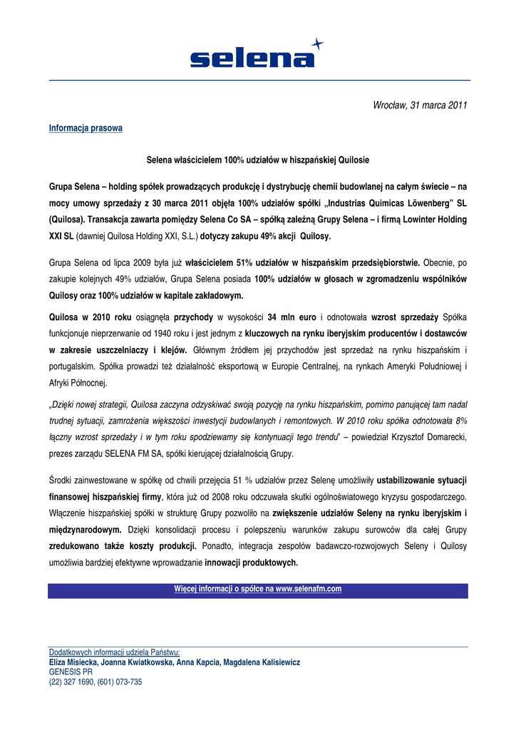 Wrocław, 31 marca 2011 Informacja prasowa Selena właścicielem 100% udziałów w hiszpańskiej Quilosie Grupa Selena – holding spółek prowadzących produkcję i dystrybucję chemii budowlanej na całym świecie – na mocy umowy sprzedaży z 30 marca 2011 objęła 100% udziałów spółki „Industrias Quimicas Löwenberg” SL (Quilosa). Transakcja zawarta pomiędzy Selena Co SA – spółką zależną Grupy Selena – i firmą Lowinter Holding XXI SL (dawniej Quilosa Holding XXI, S.L.) dotyczy zakupu 49% akcji Quilosy. Grupa Selena od lipca 2009 była już właścicielem 51% udziałów w hiszpańskim przedsiębiorstwie. Obecnie, po zakupie kolejnych 49% udziałów, Grupa Selena posiada 100% udziałów w głosach w zgromadzeniu wspólników Quilosy oraz 100% udziałów w kapitale zakładowym. Quilosa w 2010 roku osiągnęła przychody w wysokości 34 mln euro i odnotowała wzrost sprzedaży Spółka funkcjonuje nieprzerwanie od 1940 roku i jest jednym z kluczowych na rynku iberyjskim producentów i dostawców w zakresie uszczelniaczy i klejów. Głównym źródłem jej przychodów jest sprzedaż na rynku hiszpańskim i portugalskim. Spółka prowadzi też działalność eksportową w Europie Centralnej, na rynkach Ameryki Południowej i Afryki Północnej. „Dzięki nowej strategii, Quilosa zaczyna odzyskiwać swoją pozycję na rynku hiszpańskim, pomimo panującej tam nadal trudnej sytuacji, zamrożenia większości inwestycji budowlanych i remontowych. W 2010 roku spółka odnotowała 8% łączny wzrost sprzedaży i w tym roku spodziewamy się kontynuacji tego trendu” – powiedział Krzysztof Domarecki, prezes zarządu SELENA FM SA, spółki kierującej działalnością Grupy. Środki zainwestowane w spółkę od chwili przejęcia 51 % udziałów przez Selenę umożliwiły ustabilizowanie sytuacji finansowej hiszpańskiej firmy, która już od 2008 roku odczuwała skutki ogólnoświatowego kryzysu gospodarczego. Włączenie hiszpańskiej spółki w strukturę Grupy pozwoliło na zwiększenie udziałów Seleny na rynku iberyjskim i międzynarodowym. Dzięki konsolidacji procesu i polepszeniu warunków zakupu surowców dla całej Grupy zredukowano także koszty produkcji. Ponadto, integracja zespołów badawczo-rozwojowych Seleny i Quilosy umożliwia bardziej efektywne wprowadzanie innowacji produktowych. Więcej informacji o spółce na www.selenafm.com Dodatkowych informacji udzielą Państwu: Eliza Misiecka, Joanna Kwiatkowska, Anna Kapcia, Magdalena Kalisiewicz GENESIS PR (22) 327 1690, (601) 073-735 ERROR: syntaxerror OFFENDING COMMAND: --nostringval-STACK: (Selena wlascicielem 100proc udzialw w Quilosie) /Title () /Subject (D:20110331135632) /ModDate () /Keywords (PDFCreator Version 0.8.0) /Creator (D:20110331135632) /CreationDate (kkulisz) /Author -mark-