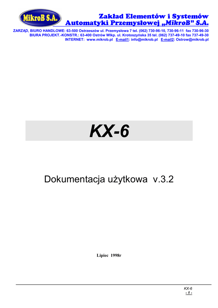 Zakład Elementów i Systemów Automatyki Przemysłowej „MikroB” S.A. ZARZĄD, BIURO HANDLOWE: 63-500 Ostrzeszów ul. Przemysłowa 7 tel. (062) 730-96-10, 730-96-11 fax 730-96-30 BIURA PROJEKT.-KONSTR.: 63-400 Ostrów Wlkp. ul. Krotoszyńska 35 tel. (062) 737-49-10 fax 737-49-30 INTERNET: www.mikrob.pl E-mail1: [email protected] E-mail2: [email protected] KX-6 Dokumentacja uŜytkowa v.3.2 Lipiec 1998r KX-6 -1- SPIS TREŚCI 1. OPIS OGÓLNY SPRZĘTU ............................................................................................................4 1.1. FUNKCJE URZĄDZENIA .................................................................................................................4 1.2. MECHANIKA .................................................................................................................................4 2. ZASILANIE – PAKIET ZASILACZA KZ-01 ..................................................................................6 2.1. 2.2. 2.3. 2.4. 2.5. 3. JEDNOSTKA CENTRALNA – PAKIET KM-50............................................................................8 3.1. 3.2. 3.3. 3.4. 3.5. 4. PRZEZNACZENIE ..........................................................................................................................6 DANE TECHNICZNE.......................................................................................................................6 TABELA ROZMIESZCZENIA SYGNAŁÓW NA ZŁĄCZU OBIEKTOWYM .....................................................6 SCHEMAT PODŁĄCZENIA ZASILANIA ...............................................................................................7 UWAGI EKSPLOATACYJNE ............................................................................................................7 PRZEZNACZENIE ..........................................................................................................................8 DANE TECHNICZNE.......................................................................................................................8 TABELA ROZMIESZCZENIA SYGNAŁÓW NA ZŁĄCZU OBIEKTOWYM .....................................................8 SCHEMAT APLIKACYJNY (SYGNAŁ SYNCHRO).............................................................................9 UWAGI EKSPLOATACYJNE ............................................................................................................9 PAKIETY WEJŚĆ I WYJŚĆ........................................................................................................10 4.1. W EJŚCIA ANALOGOWE – PAKIET KA-08 .....................................................................................10 4.1.1. Przeznaczenie.................................................................................................................10 4.1.2. Dane techniczne .............................................................................................................10 4.1.3. Tabela rozmieszczenia sygnałów na złączu obiektowym ...............................................10 4.1.4. Schemat aplikacyjny (dla wej. nr 1) ................................................................................11 4.1.5. Uwagi eksploatacyjne .....................................................................................................11 4.2. W EJŚCIA DWUSTANOWE – PAKIET KC-16 ..................................................................................12 4.2.1. Przeznaczenie.................................................................................................................12 4.2.2. Dane techniczne .............................................................................................................12 4.2.3. Tabela rozmieszczenia sygnałów na złączu obiektowym ...............................................12 4.2.4. Schemat aplikacyjny (dla wej. nr 1) ................................................................................13 4.2.5. Uwagi eksploatacyjne .....................................................................................................13 4.3. W EJŚCIA IMPULSOWE – PAKIETY KF-16/1 I KF-16/2 ..................................................................14 4.3.1. Przeznaczenie.................................................................................................................14 4.3.2. Dane techniczne .............................................................................................................14 4.3.3. Tabela rozmieszczenia sygnałów na złączu obiektowym ...............................................15 4.3.4. Schemat aplikacyjny (dla wej. nr 1) dla pakietu KF-16/1 ................................................15 4.3.5. Schemat aplikacyjny (dla wej. nr 1) dla pakietu KF-16/2 ................................................16 4.3.6. Uwagi eksploatacyjne .....................................................................................................16 4.4. W YJŚCIA ANALOGOWE – PAKIET KU-04.....................................................................................17 4.4.1. Przeznaczenie.................................................................................................................17 4.4.2. Dane techniczne .............................................................................................................17 4.4.3. Tabela rozmieszczenia sygnałów na złączu obiektowym ...............................................17 4.4.4. Schemat aplikacyjny (dla wyj. nr 1).................................................................................18 4.5. W YJŚCIA DWUSTANOWE – PAKIET KO-08..................................................................................19 4.5.1. Przeznaczenie.................................................................................................................19 4.5.2. Dane techniczne .............................................................................................................1