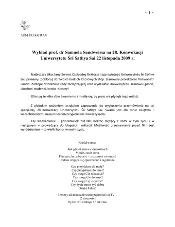 ~1~ AUM ŚRI SAI RAM Wykład prof. dr Samuela Sandweissa na 28. Konwokacji Uniwersytetu Śri Sathya Sai 22 listopada 2009 r. Najdroższy Ukochany Swami, Czcigodny Rektorze tego świętego Uniwersytetu Śri Sathya Sai, pranamy (pokłony) do Twoich boskich lotosowych stóp. Szanowny prorektorze Vishwanath Pandit, dostojni członkowie rady zarządzającej oraz wydziałów Uniwersytetu, szanowni goście, ukochani studenci, bracia i siostry! Ofiaruję te kilka słów Swamiemu i modlę się, by przez nie płynęła Jego miłośd. Z głębokim uniżeniem przyjąłem zaproszenie do wygłoszenia przemówienia na tej specjalnej, 28. Konwokacji Uniwersytetu Śri Sathya Sai. Swami jest dla mnie świętym – wszechobecnym, naszym stałym przyjacielem i towarzyszem. Czy kiedykolwiek – gdziekolwiek był taki Rektor, będący z nami w tym życiu i w następnym – prowadzący do błogości i miłości? Możliwośd przemawiania przed Nim jest wyróżnieniem – to wielki honor w moim życiu. Krótki wiersz: Jest gdzieś tam w ciemnościach Młode, czułe serce Płaczące, by zobaczyć – zrozumieć ciemność Jednak czujące się opuszczone i zagubione Czy przyjdziesz do mnie? Czy przyjdziesz do mnie? Czy mogę Cię zobaczyć? Czy mogę Cie dotknąć? Czy mogę Cię usłyszeć? Czy życie może być dobre Dzięki Tobie? I wtedy tak nieoczekiwanie pojawileś się Ty – Z ciemności Byłem w Bombaju 37 lat temu ~2~ Jako młody psychiatra Niepokojony niestałością I śmiercią Opuściłem małe mieszkanie By zobaczyć Cię po raz pierwszy Byłem pośród 20 milionów ludzi – A Ty przyszedłeś do mnie Co za miłość – Wyjść z ciemności I uczynić mnie szczęśliwym Widziałem wieczność – całe stworzenie Sens i przyczynę A ponad wszystko, Twoją miłość Jak mogę wyśpiewać Twoją chwałę? Jak mogę wyrazić Twoją wielkość? Przyjmij tę krótką mowę, Swami Modlitwę za Twe zagubione dzieci Modlę się, na miłość boską Niech Twa litość się rozleje Poprzez niebo i góry Na serca, które boleją Niech góry dzwonią Nieba śpiewają Niech każda istota Wykąpie się w widzeniu przez tę głęboką noc ciemności Spraw, by nam było dobrze i pełnie, i święcie Koniec wiersza Dzisiaj zwracam sie do kooczących studia na tym bardzo specjalnym uniwersytecie. Chciałbym także włączyd tutaj wszystkich wielbicieli Boga, ponieważ w naszych sercach wszyscy jesteśmy uczniami Swamiego. O czym dowiadujemy się tutaj, czego nie znalazłem nigdzie indziej? Doświadczyliśmy Swamiego, który miłościwie ratuje nas w ostatniej chwili, gdziekolwiek byśmy nie byli , ukazując Swoją władzę nad czasem i miejscem. Zobaczyd Swamiego materializującego przedmiot to otrzymad świadectwo prawdy, że „Stworzenie, wszechświat jest projekcją woli Boga – jest więc pozbawiona fundamentalnej realności.” Swami napisał o tym w „Bhagawata Wahini.” Czy współczesną naukę stad na chodby mgliste wyobrażenie tej rzeczywistości? ~3~ Nasza wiedza o miłości Swamiego oraz o Jego panowaniu nad czasem, przestrzenią i materią nie jest wiedzą wymyśloną czy książkową. Jest to wiedza zrodzona z rzeczywistego doświadczenia życia ze Swamim, jest to wiedza praktyczna. Nie da się jej nabyd za żaden ziemski skarb. A jednak Swami daje nam ją bez ograniczeo. Jest to Jego bezcenna łaska! Tak! Bóg istnieje! Jego serce jest miękkie jak masło; kocha nas i pragnie naszej miłości – miłośd łączy się z miłością – jestem Bogiem. Kluczem jest umysł – on powoduje naszą niewolę lub wyzwolenie . Podążaj za głosem sumienia, ono prowadzi nas na drogę służby społecznej. Przez służenie odnajdujemy Boga w społeczeostwie i spełniamy się! Studenci, jesteście świętą skarbnicą nauk Swamiego – u progu sprawdzania tej świętej wiedzy w tyglu codziennego życia. Jak mamy żyd według tych nauk? Posłuchajcie tej historii. W lutym 2005 roku Swami zmaterializował złoty pierścieo dla mojej żony. Miał on prostokątną powierzchnię oraz widoczny napis Om na jednej stronie. Zauważyliśmy, że gdy patrzy się pod różnym kątem, te same linie wyglądały jak słowa w różnych językach. Jeden z nich wyglądał na arabski. Swami powiedział, że były to imiona Boga. Wiedziałem, że tajemnica związana z różnymi imionami z czasem wyjdzie na jaw. Mój bliski przyjaciel, który miał niepełnosprawną żonę, zachorował. Nie byli w stanie opiekowad się sobą. Popadli w rozpacz. Przejechaliśmy 2000 mil, aby pracując ciężko przez cały tydzieo posprzątad ich dom oraz przenieśd ich w bezpieczne miejsce. W ich domu panował taki nieporządek i tyle było brudu, że podczas pracy w nim musieliśmy nosid maski ochronne. Oto w jakich warunkach żyje dziś człowiek – żyjemy na zanieczyszczonej ziemi, powietrzu oraz związkach społecznych. Zachorowaliśmy! Swami był w naszych myślach, słowach i czynach. Gdy przywróciliśmy schludnośd i czystośd w obejściu, a także w naszych pobudkach, zobaczyliśmy oznaki boskości Swamiego – w uśmiechach na twarzach naszych drogich przyjaciół. W recepcji naszego motelu recepcjonista zauważył pierścieo Sharon. „Czy wie pan, co to znaczy?” – zapytała Sharon. „To jest imię Boga, Allach” – odpowiedział. Służba zaowocowała wglądem! Następnie poznaliśmy znaczenie każdego słowa, jakie były widoczne przy ustawieniach pierścienia pod różnymi kątami. Z jednej strony był to ‘Om,’ z drugiej ‘Allach,’ z kolejnej ‘Ja to Ja’, z jeszcze innej ‘El’ – imię Boga w religii żydowskiej. Swami nauczał: różne są imiona, lecz jeden jest Bóg, oraz że poprzez służenie dostrzegamy naszą jednośd w różnorodności. Mądrośd pogłębiła się dzięki służbie. ~4~ Około półtora roku temu byliśmy z Sharon w St. Petersburgu, aby wystąpid podczas Rosyjskiej Narodowej Konferencji Sai. Swami naucza prowadzenia siebie, prowadzenia rodziny, służenia lokalnej społeczności, a na
