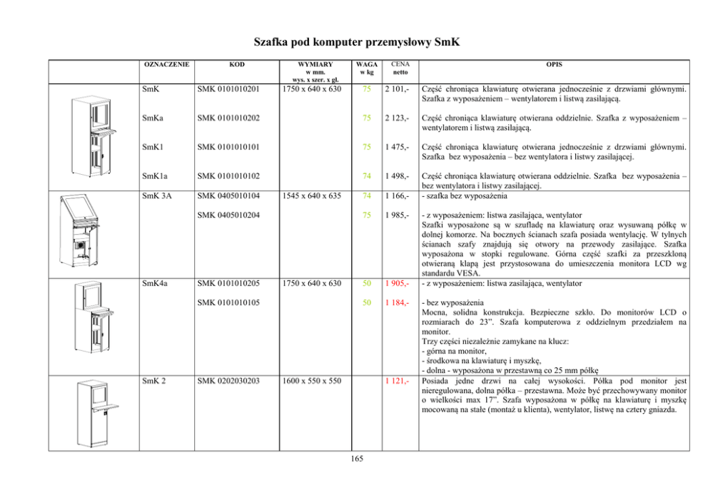 Szafka pod komputer przemysłowy SmK OZNACZENIE KOD SmK SMK 0101010201 SmKa WYMIARY w mm. wys. x szer. x gł. 1750 x 640 x 630 WAGA w kg CENA netto OPIS 75 2 101,- Cz chroni ca klawiatur otwierana jednocze nie z drzwiami głównymi. Szafka z wyposa eniem – wentylatorem i listw zasilaj c . SMK 0101010202 75 2 123,- Cz chroni ca klawiatur otwierana oddzielnie. Szafka z wyposa eniem – wentylatorem i listw zasilaj c . SmK1 SMK 0101010101 75 1 475,- Cz chroni ca klawiatur otwierana jednocze nie z drzwiami głównymi. Szafka bez wyposa enia – bez wentylatora i listwy zasilaj cej. SmK1a SMK 0101010102 74 1 498,- SmK 3A SMK 0405010104 74 1 166,- Cz chroni ca klawiatur otwierana oddzielnie. Szafka bez wyposa enia – bez wentylatora i listwy zasilaj cej. - szafka bez wyposa enia 75 1 985,- 50 1 905,- 50 1 184,- 1545 x 640 x 635 SMK 0405010204 SmK4a SMK 0101010205 1750 x 640 x 630 SMK 0101010105 SmK 2 SMK 0202030203 1600 x 550 x 550 1 121,- 165 - z wyposa eniem: listwa zasilaj ca, wentylator Szafki wyposa one s w szuflad na klawiatur oraz wysuwan półk w dolnej komorze. Na bocznych cianach szafa posiada wentylacj . W tylnych cianach szafy znajduj si otwory na przewody zasilaj ce. Szafka wyposa ona w stopki regulowane. Górna cz szafki za przeszklon otwieran klap jest przystosowana do umieszczenia monitora LCD wg standardu VESA. - z wyposa eniem: listwa zasilaj ca, wentylator - bez wyposa enia Mocna, solidna konstrukcja. Bezpieczne szkło. Do monitorów LCD o rozmiarach do 23”. Szafa komputerowa z oddzielnym przedziałem na monitor. Trzy cz ci niezale nie zamykane na klucz: - górna na monitor, - rodkowa na klawiatur i myszk , - dolna - wyposa ona w przestawn co 25 mm półk Posiada jedne drzwi na całej wysoko ci. Półka pod monitor jest nieregulowana, dolna półka – przestawna. Mo e by przechowywany monitor o wielko ci max 17”. Szafa wyposa ona w półk na klawiatur i myszk mocowan na stałe (monta u klienta), wentylator, listw na cztery gniazda. SPNK SMK0506050506 1770 x 755 x 300 (podstawa 600) 2 105,- 166 Szafa o klasie odporno ci IP-42 (ochrona przed ciałami o wielko ci ponad 1mm, oraz ochrona przed kroplami wody padaj cymi pod k tem 15º). Wyposa enie standardowe: - 2 półki na zaczepach, - 1 półka przesuwna na komputer, - wentylator, - listwa zasilaj ca z filtrem przeciwzakłóceniowym, - przył cze Ethernet, - kabel zasilaj cy, - odkr cana podstawa szafy (ze stopkami regulacyjnymi) umo liwiaj ca przymocowanie do podło a, - uchwyt monitora VESA, - drzwi zamykane zamkiem z wkładk patentow ryglowane w 3 pkt, - schowek klawiatury z wysuwan podstawk pod mysz zamykany zamkiem cylindrycznym w 1 pkt. Szafy malowane farb strukturaln .