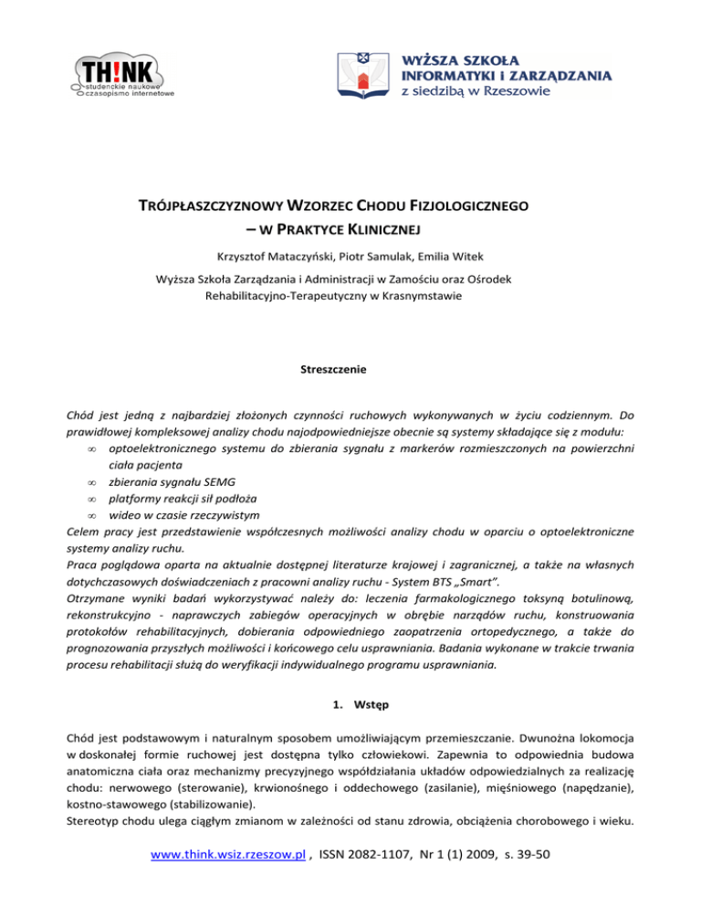TRÓJPŁASZCZYZNOWY WZORZEC CHODU FIZJOLOGICZNEGO – W PRAKTYCE KLINICZNEJ Krzysztof Mataczyński, Piotr Samulak, Emilia Witek Wyższa Szkoła Zarządzania i Administracji w Zamościu oraz Ośrodek Rehabilitacyjno-Terapeutyczny w Krasnymstawie Streszczenie Chód jest jedną z najbardziej złożonych czynności ruchowych wykonywanych w życiu codziennym. Do prawidłowej kompleksowej analizy chodu najodpowiedniejsze obecnie są systemy składające się z modułu: • optoelektronicznego systemu do zbierania sygnału z markerów rozmieszczonych na powierzchni ciała pacjenta • zbierania sygnału SEMG • platformy reakcji sił podłoża • wideo w czasie rzeczywistym Celem pracy jest przedstawienie współczesnych możliwości analizy chodu w oparciu o optoelektroniczne systemy analizy ruchu. Praca poglądowa oparta na aktualnie dostępnej literaturze krajowej i zagranicznej, a także na własnych dotychczasowych doświadczeniach z pracowni analizy ruchu - System BTS „Smart”. Otrzymane wyniki badań wykorzystywać należy do: leczenia farmakologicznego toksyną botulinową, rekonstrukcyjno - naprawczych zabiegów operacyjnych w obrębie narządów ruchu, konstruowania protokołów rehabilitacyjnych, dobierania odpowiedniego zaopatrzenia ortopedycznego, a także do prognozowania przyszłych możliwości i końcowego celu usprawniania. Badania wykonane w trakcie trwania procesu rehabilitacji służą do weryfikacji indywidualnego programu usprawniania. 1. Wstęp Chód jest podstawowym i naturalnym sposobem umożliwiającym przemieszczanie. Dwunożna lokomocja w doskonałej formie ruchowej jest dostępna tylko człowiekowi. Zapewnia to odpowiednia budowa anatomiczna ciała oraz mechanizmy precyzyjnego współdziałania układów odpowiedzialnych za realizację chodu: nerwowego (sterowanie), krwionośnego i oddechowego (zasilanie), mięśniowego (napędzanie), kostno-stawowego (stabilizowanie). Stereotyp chodu ulega ciągłym zmianom w zależności od stanu zdrowia, obciążenia chorobowego i wieku. www.think.wsiz.rzeszow.pl , ISSN 2082-1107, Nr 1 (1) 2009, s. 39-50 Trójpłaszczyznowy wzorzec chodu fizjologicznego – w praktyce klinicznej Dla zdrowego, młodego człowieka chód nie stanowi problemu, jest naturalną czynnością. Powstanie dysfunkcji w obrębie narządów ruchu powoduje potrzebę wydatkowania zwiększonej energii, obciąża układy sercowo-naczyniowy, oddechowy i znacznie obniża efektywność mechanizmów amortyzacyjnych [1]. Według Saundersa, Inmana i Eberharta utrata jednego wyznacznika chodu może być kompensowana kosztem większego zużycia energii, przy czym największe jej zużycie pojawia się przy utracie wyznacznika kolana. Utrata dwóch wyznaczników wręcz uniemożliwia aktywną kompensację, a koszt zużytej energii wrasta trzykrotnie. Brak czynności dwóch dużych stawów w obrębie kończyny dolnej obciąża układ sercowo-naczyniowy, który w tym przypadku musi pokryć kompensacyjne wymagania energetyczne rzędu 300% [8]. 2. Aspekt historyczny badania chodu Zainteresowania dotyczące zagadnień chodu sięgają odległych lat. Klasyczne studia chodu sięgają czasów Webera (1836), Marega (1885), Duchenne`a (1887). Intensywne badania dotyczące problematyki chodu wynikały przede wszystkim z potrzeb wyznaczania szeroko pojętych kierunków usprawniania osób, które utraciły zdolność sprawnej lokomocji. Podwaliny dla obecnej wiedzy z tego zakresu stworzył Steindler A.- wybitny ortopeda amerykański. W późniejszym okresie, w latach `70 XX w. Kalifornijski Uniwersytet Berckley w Los Angeles stał się wybitną placówką zajmującą się pionierskimi badaniami chodu. Amerykańscy badacze posługiwali się filmowaniem chodu na szklanej płycie wykorzystując dynamometr płytowy wmontowany w ruchomy chodnik dla badania sił podłoża. Czynności mięśni podczas chodu kontrolowano elektromiografem [9]. Dla celów klinicznych H.D.Eberhart i współpracownicy wyróżnili w trakcie cyklu chodu każdej z kończyn fazę podparcia (lub podporu) i przeniesienia (lub wymachu). Podczas przeciętnie szybkiego chodu faza podporu jednej kończyny dolnej zajmuje około 60% czasu cyklu chodu. W fazie podporu (stance) wyróżniono charakterystyczne momenty. Jest to uderzenie pięty (heel strike), płaskie przyłożenie stopy do podłoża (foot flat), oderwanie pięty od podłoża (heel off) oraz oderwanie palców (toe off). Foot flat występuje w dziesiątym procencie czasu całego cyklu chodu, heel off w 45%, toe off w 60%. Faza przenoszenia zajmuje zwykle około 40% czasu cyklu chodu, rozpoczyna się w momencie oderwania od podłoża palucha a kończy się z chwilą zetknięcia pięty tej samej kończyny z podłożem. Fazę wymachu (swing) można podzielić na początkową (initial swing) czyli przyspieszenia, rozpoczyna się w momencie gdy paluch kończyny dolnej zakrocznej odrywa się od podłoża i kończyna zakroczna goni tułów a kończy, gdy kończyna znajdzie się pod „środkiem” ciała. Faza wymachu środkowa (midswing) określona też przenoszeniem właściwym jest to moment w którym oś poprzeczna stawu skokowo- goleniowego pokrywa się z płaszczyzną czołową. Faza wymachu końcowa (terminal swing) to okres, w którym kończyna zakroczna wyprzedza tułów, następuje zwolnienie tempa ruchu kończyny ku przodowi i przygotowanie jej do kontaktu z podłożem. Sytuacja, w której paluch kończyny zakrocznej jeszcze się nie oderwał od podłoża a pięta kończyny wykrocznej już się o nią oparła, określana jest fazą podwójnego podparcia. Czas trwania tej fazy jest zależny od szybkości chodu, podczas biegu nie występuje- zastąpiona jest fazą lotu [8]. 3. Definicje chodu Istnieje wiele definicji chodu, z reguły są one do siebie bardzo zbliżone. Chód polega na przemieszczaniu do przodu masy ciała w przestrzeni, skupionej w środku ciężkości wzdłuż drogi wymagającej najmniejszego wydatku energetycznego. W kinetycznej analizie c