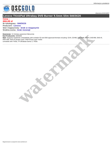 Informacje o produkcie Utworzono 02-03-2017 Lenovo ThinkPad Ultrabay DVD Burner 9.5mm Slim 0A65626 Cena : 666,00 zł Nr katalogowy : 0A65626 Producent : Lenovo Stan magazynowy : brak w magazynie Średnia ocena : brak recenzji w at er m ar k Gwarancja: 12 miesięcy gwarancji fabrycznej Kod Producenta: 0A65626 Opis: Supports read/write compatibility with multiple CD and DVD approved formats including: CD-R, CD-RW, DVD-RAM, DVD-R, DVD-RW, DVD+R, DVD+RW, DVD+R Double Layer, DVD-R Dual Layer media comatible with T430s, TP Ultrabase Series 3, T420s Wygenerowano w programie www.oscGold.com