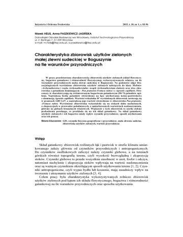 Inżynieria i Ochrona Środowiska 2015, t. 18, nr 1, s. 83-96 Marek HELIS, Anna PASZKIEWICZ-JASIŃSKA Dolnośląski Ośrodek Badawczy we Wrocławiu, Instytut Technologiczno-Przyrodniczy ul. Z. Berlinga 7, 51-209 Wrocław e-mail: [email protected], [email protected] Charakterystyka zbiorowisk użytków zielonych małej zlewni sudeckiej w Boguszynie na tle warunków przyrodniczych W pracy przedstawiono charakterystykę zbiorowisk użytków zielonych (skład florystyczny, bogactwo gatunkowe i różnorodność florystyczną), wykorzystywanych rolniczo, na tle warunków przyrodniczych małej zlewni sudeckiej w Boguszynie. Na podstawie zdjęć fitosocjologicznych wyróżniono zbiorowiska użytków zielonych należących do klasy Molinio-Arrhenatheretea i rzędu Arrhenatheretalia: zespół Arrhenatheretum elatioris oraz dwa zbiorowiska z gatunkiem dominującym - Poa pratensis-Festuca rubra i z Agrostis capillaris. Fitocenozy te charakteryzują się zróżnicowanym bogactwem gatunkowym (50-74 gatunków ogółem). Największą liczbę gatunków stwierdzono na łące użytkowanej kośno-pastwiskowo z dominacją Agrostis capillaris. Wartości wskaźnika H' wyróżnionych zbiorowisk zawierają się w granicach 2,00÷2,37, a największą jego wartość stwierdzono w zbiorowisku Poa pratensis-Festuca rubra. Wyróżnione zbiorowiska wykształciły się na stokach słabo nachylonych, o ekspozycjach w przewadze południowych, o umiarkowanych wartościach nasłonecznienia, głównie na glebach brunatnych właściwych. Większość z tych zbiorowisk to użytki zielone pochodzenia porolnego, co przekłada się na ich skład gatunkowy. Na skład gatunkowy użytków zielonych i ich bogactwo miały wpływ czynniki przyrodnicze, sposób użytkowania oraz ich geneza. Słowa kluczowe: GIS, czynniki fizyczno-geograficzne i przyrodnicze, mała zlewnia sudecka, zbiorowiska użytków zielonych, wartość przyrodnicza Wstęp Skład gatunkowy zbiorowisk roślinnych łąk i pastwisk w strefie klimatu umiarkowanego zależy głównie od czynników przyrodniczych i antropogenicznych. Do czynników siedliskowych zaliczyć należy czynniki glebowe, a na terenach górskich również topografię terenu, czyli wysokość bezwzględną i ekspozycję stoków. Czynniki glebowe to przede wszystkim zasobność w azot, fosfor i odczyn, natomiast nachylenie i ekspozycja stoków wpływają na wartość nasłonecznienia oraz są ważnym czynnikiem określającym sposób użytkowania terenu [1, 2]. Czynniki antropogeniczne, czyli wypas bydła lub koszenie, mają zasadniczy wpływ na tworzenie i utrzymanie użytków zielonych [3, 4]. Celem pracy była charakterystyka wykorzystywanych rolniczo zbiorowisk użytków zielonych pod kątem ich składu florystycznego, bogactwa i różnorodności gatunkowej na tle warunków przyrodniczych oraz sposobu użytkowania. 84 M. Helis, A. Paszkiewicz-Jasińska 1. Teren badań Zlewnia Potoku Boguszyńskiego o powierzchni 142 ha zlokalizowana jest w południowo-zachodniej części Polski, w województwie dolnośląskim, w powiecie kłodzkim. Według podziału fizyczno-geograficznego [5], leży w prowincji Masyw Czeski, podprowincji Sudety i Przedgórze Sudeckie, w makroregionie Sudety Środkowe, mezoregionie: Góry Bardzkie i Kotlina Kłodzka, na granicy dwóch mikroregionów: Kotliny Kłodzkiej i Wschodniego Grzbietu Gór Bardzkich. Zlewnia odwadniana jest przez Potok Boguszyński, będący bezpośrednim dopływem Nysy Kłodzkiej. Główna oś doliny cieku ma przebieg północny zachód - południowy wschód. Minimalna wysokość wynosi 282 m n.p.m., maksymalna to 440 m n.p.m., a średnie nachylenie stoków wynosi 7°. Według prac kartograficznych przeprowadzonych przez autorów, dominującymi ekspozycjami w zlewni są: zachodnia 35,4 ha, południowa - 31,8 ha i południowo-zachodnia - 28 ha. Dominujące ekspozycje „ciepłe” (południowe, zachodnie, południowo-zachodnie) zlewni przekładają się na wyliczone średnie wartości nasłonecznienia. Wartości najniższe nasłonecznienia, wyrażane przedziałem od 78 do 100%, zajmują powierzchnię 12,5 ha, wartości umiarkowane leżące w przedziale 101÷109% - 96,6 ha, a „ciepłe” w przedziale 110÷136% - 32,9 ha. Teren zlewni Potoku Boguszyńskiego na obszarze 1,91 ha pokryty jest obszarem zabudowanym, grunty orne zajmują 52,7 ha, użytki zielone 40,2 ha. Las liściasty, lokalizowany w sąsiedztwie cieku i wzdłuż niektórych miedz oraz na obszarach najbardziej nachylonych, zajmuje jedynie 5,8 ha, a drogi asfaltowe, gruntowe i miedze wraz z poboczami - 4,5 ha. Na stokach nachylonych powyżej 10÷12° występują trwałe użytki zielone. Grunty orne zalegają głównie na powierzchniach o najmniejszym nachyleniu, bliżej wododziału, na glebach brunatnych właściwych, wykształconych głównie z pyłów ilastych. Na obszarze 86,6 ha zlewnia pokryta jest słabo przepuszczalnymi pyłami ilastymi i lessami ilastymi pochodzenia eolicznego, a na pozostałej części obszaru znajdują się gliny lekkie i średnie pylaste pochodzenia glacjalnego. Na całej zlewni wytworzyły się gleby brunatne właściwe, bielice i pseudobielice. 2. Metodyka badań 2.1. Metodyka badań kartograficznych W celu określenia warunków przyrodniczych terenu badań fitosocjologicznych jako granice przyjęto działki ewidencyjne, które są jednorodne pod względem roślinności i sposobu użytkowania. Za warunki przyrodnicze uznano dane o czynnikach glebowych, sposób użytkowania terenu i Numeryczny Model Wysokościowy (NMW) wraz z pochodnymi (ekspozycją, nachyleniem i nasłonecznieniem). Prace kartograficzne prowadzono w oparciu o istniejącą w Instytucie Technologiczno-Przyrodniczym Dolnośląskiego Ośrodka Badawczego bazę danych o czynnikach przyrodniczych w Sudetach. Baza ta została uszczegółowiona i wzbogacona poprzez wprowadzenie do niej dodatkowych warstw tematycznych obszaru Bogu- Charakterystyka zbiorowisk użytków zielonych małej zlewni sudeckiej w Bogus
