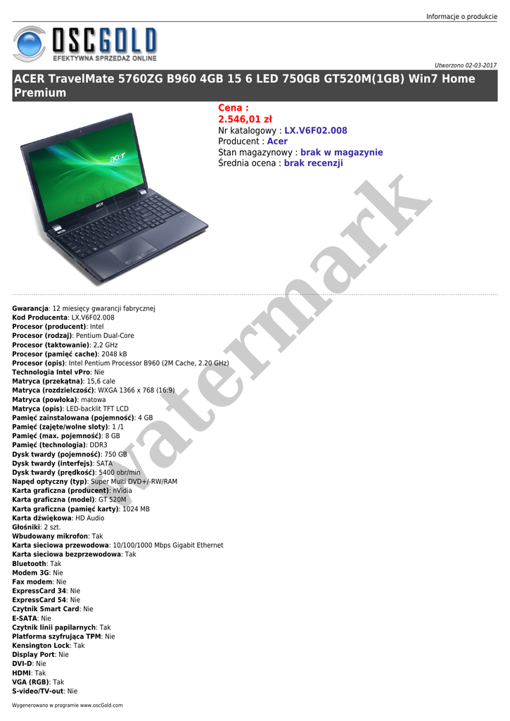 Informacje o produkcie Utworzono 02-03-2017 ACER TravelMate 5760ZG B960 4GB 15 6 LED 750GB GT520M(1GB) Win7 Home Premium Cena : 2.546,01 zł er m ar k Nr katalogowy : LX.V6F02.008 Producent : Acer Stan magazynowy : brak w magazynie Średnia ocena : brak recenzji w at Gwarancja: 12 miesięcy gwarancji fabrycznej Kod Producenta: LX.V6F02.008 Procesor (producent): Intel Procesor (rodzaj): Pentium Dual-Core Procesor (taktowanie): 2,2 GHz Procesor (pamięć cache): 2048 kB Procesor (opis): Intel Pentium Processor B960 (2M Cache, 2.20 GHz) Technologia Intel vPro: Nie Matryca (przekątna): 15,6 cale Matryca (rozdzielczość): WXGA 1366 x 768 (16:9) Matryca (powłoka): matowa Matryca (opis): LED-backlit TFT LCD Pamięć zainstalowana (pojemność): 4 GB Pamięć (zajęte/wolne sloty): 1 /1 Pamięć (max. pojemność): 8 GB Pamięć (technologia): DDR3 Dysk twardy (pojemność): 750 GB Dysk twardy (interfejs): SATA Dysk twardy (prędkość): 5400 obr/min Napęd optyczny (typ): Super Multi DVD+/-RW/RAM Karta graficzna (producent): nVidia Karta graficzna (model): GT 520M Karta graficzna (pamięć karty): 1024 MB Karta dźwiękowa: HD Audio Głośniki: 2 szt. Wbudowany mikrofon: Tak Karta sieciowa przewodowa: 10/100/1000 Mbps Gigabit Ethernet Karta sieciowa bezprzewodowa: Tak Bluetooth: Tak Modem 3G: Nie Fax modem: Nie ExpressCard 34: Nie ExpressCard 54: Nie Czytnik Smart Card: Nie E-SATA: Nie Czytnik linii papilarnych: Tak Platforma szyfrująca TPM: Nie Kensington Lock: Tak Display Port: Nie DVI-D: Nie HDMI: Tak VGA (RGB): Tak S-video/TV-out: Nie Wygenerowano w programie www.oscGold.com w at er m ar k AV-in (Tuner TV): Nie Line-in: Nie Line-out: Tak Wejście mikrofonu: Tak S/PDIF: Nie RS232 (szeregowy): Nie Czytnik kart pamięci: Tak Czytnik kart pamięci (opis): (SD, MMC, MS, MS PRO, xD) Panel klawiszy multimedialnych: Nie Złącze replikatora portów: Nie Fire-Wire (IEEE1394): Nie USB 2.0: 3 szt. System operacyjny: Windows 7 Home Premium 64 bit System operacyjny (wer. Językowa): polski Wbudowana kamera: Tak Akumulator (technologia): Litowo-Jonowa, 6 komorowa Akumulator (pojemność): 4400 mAh Akumulator (czas pracy): 4 h Wymiary (wysokość): 33 mm Wymiary (szerokość): 376 mm Wymiary (głębokość): 253 mm Waga: 2,54 kg Gwarancja: 12 mies Gwarancja międzynarodowa: Nie Gwarancja baterii: 12 mies Wyposażenie: Zasilacz sieciowy 90W AC Adres www producenta: Link na stronę opisu technicznego Podświetlana klawiatura: Nie Urządzenie wskazujące: TouchPad