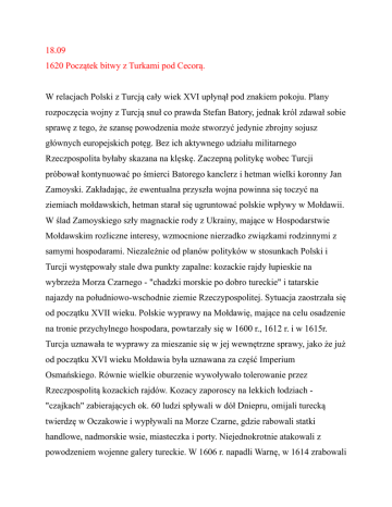 18.09 1620 Początek bitwy z Turkami pod Cecorą. W relacjach Polski z Turcją cały wiek XVI upłynął pod znakiem pokoju. Plany rozpoczęcia wojny z Turcją snuł co prawda Stefan Batory, jednak król zdawał sobie sprawę z tego, że szansę powodzenia może stworzyć jedynie zbrojny sojusz głównych europejskich potęg. Bez ich aktywnego udziału militarnego Rzeczpospolita byłaby skazana na klęskę. Zaczepną politykę wobec Turcji próbował kontynuować po śmierci Batorego kanclerz i hetman wielki koronny Jan Zamoyski. Zakładając, że ewentualna przyszła wojna powinna się toczyć na ziemiach mołdawskich, hetman starał się ugruntować polskie wpływy w Mołdawii. W ślad Zamoyskiego szły magnackie rody z Ukrainy, mające w Hospodarstwie Mołdawskim rozliczne interesy, wzmocnione nierzadko związkami rodzinnymi z samymi hospodarami. Niezależnie od planów polityków w stosunkach Polski i Turcji występowały stale dwa punkty zapalne: kozackie rajdy łupieskie na wybrzeża Morza Czarnego - "chadzki morskie po dobro tureckie" i tatarskie najazdy na południowo-wschodnie ziemie Rzeczypospolitej. Sytuacja zaostrzała się od początku XVII wieku. Polskie wyprawy na Mołdawię, mające na celu osadzenie na tronie przychylnego hospodara, powtarzały się w 1600 r., 1612 r. i w 1615r. Turcja uznawała te wyprawy za mieszanie się w jej wewnętrzne sprawy, jako że już od początku XVI wieku Mołdawia była uznawana za część Imperium Osmańskiego. Równie wielkie oburzenie wywoływało tolerowanie przez Rzeczpospolitą kozackich rajdów. Kozacy zaporoscy na lekkich łodziach "czajkach" zabierających ok. 60 ludzi spływali w dół Dniepru, omijali turecką twierdzę w Oczakowie i wypływali na Morze Czarne, gdzie rabowali statki handlowe, nadmorskie wsie, miasteczka i porty. Niejednokrotnie atakowali z powodzeniem wojenne galery tureckie. W 1606 r. napadli Warnę, w 1614 zrabowali i spalili Synopę na wybrzeżu Azji Mniejszej, w 1616 na oczach sułtana spalili dwa porty w najbliższej okolicy Istanbulu. W następnym roku podobny los spotkał Trapezunt w Azji Mniejszej i Kaffę na Krymie. W Polsce niektórzy politycy zdawali sobie sprawę z tego, że prywatne wojny w Mołdawii i tolerowanie kozackich wypraw może doprowadzić do wojny. Strona turecka również nie pozostawała bez winy. Nad mieszkańcami ziem ukrainnych wiecznie wisiało widmo tatarskich zagonów. Kiedy rozpadła się Złota Orda, tatarskie państwo rozciągające się od ujścia Dunaju po Irtysz w Azji, na Półwyspie Krymskim powstał oddzielny chanat, na którego czele w 1427 r. stanęła dynastia Girejów, sprawująca swą władzę aż do zlikwidowania chanatu przez Rosję w 1783 r. W 1475 r. Chanat Krymski dostał się pod protektorat turecki. Część ziem włączono bezpośrednio do Turcji, zaś sprawującego władzę nad pozostałą częścią chana wyznaczał każdorazowo, spośród członków rodu Girejów, sułtan. Zagony tatarskie pojawiały się na ziemiach polskich niemal corocznie siejąc postrach i zniszczenie, a ponadto uniemożliwiając rozwój gospodarczy Podola i Ukrainy. Strona turecka uważała, że straty i szkody wyrządzane przez Kozaków są nieporównanie większe i postanowiła problem niesfornych szkodników rozwiązac samodzielnie. W 1617 r., na wiosnę armia turecka dowodzona przez Iskandera paszę wyruszyła na północ. Drogę Turkom zastąpiły niewielkie siły polskie pod wodzą hetmana wielkiego koronnego Stanisława Żółkiewskiego. Obydwie strony, jak się okazało były zainteresowane szybkim zakończeniem konfliktu. Rzeczpospolita w tym czasie zaangażowana była w wojnę z Moskwą, na którą skierowała większość wojska, ponadto nad Dniestrem, gdzie zgromadził swe odziały hetman, nie pojawiły się oczekiwane posiłki kozackie. Turcy z kolei oczekiwali rychłego wybuchu wojny z Persją. Obydwa wojska spotkały się nad Dniestrem, w okolicach miasteczka Jaruga. 23 września 1617 r. został zawarty traktat, w którym Polacy zobowiązali się poniechać wypraw na Mołdawię i poskromić Kozaków, zaś Turcy obiecali powstrzymać tatarskie wyprawy. Niestety żadna strona nie dotrzymała zobowiązań. Jeszcze tego samego roku Tatarzy pojawili się w Polsce a Kozacy na Morzu Czarnym. Obustronne niezadowolenie narastało, a ponadto pojawił się nowy powód do wojny. Król polski Zygmunt III Waza zaangażował się po stronie Habsburgów w wojnie trzydziestoletniej, wysyłając do, Siedmiogrodu, będącego tureckim lennem, oddziały lekkiej jazdy, tzw. lisowczyków. Książę siedmiogrodzki Bethlen Gabor oblegał w tym czasie Wiedeń. Lisowczycy jesienią 1619 r. przekroczyli karpaty i 21 listopada rozbili armię węgierska pod Humiennem. Bethlen Gabor porzucił oblężenie Wiednia i rozpoczął w Istanbule starania o wystąpienie przeciwko Rzeczypospolitej. Do starań Gabora przyłączyły się intrygi chana krymskiego i patriarchy konstantynopolitańskiego. Ten ostatni usiłował doprowadzić do osłabienia Polski w toczącej się wojnie z prawosławną Moskwą. W marcu 1620 r. do Istanbulu udał się polski poseł Hieronim Otwinowski. Skrajnie nieprzychylne przyjęcie wskazywało na toczące się już przygotowania do wojny. Konflikt z Persją został już zakończony i Turcja miała rozwiązane ręce w na północy. 16 maja Zygmunt III Waza wydał uniwersał do szlachty, w którym informował o zbliżającej się wojnie i wzywał do obrony granic. Ponieważ hospodar mołdawski Piotr Graziani od pewnego czasu szukał w Polsce sprzymierzeńca przeciwko Turcji, hetman Żółkiewski zdecydował się na wkroczenie z wojskiem do Mołdawii i szukanie zbrojnego rozstrzygnięcia w zaczepnej operacji poza granicami Rzeczypospolitej. Siły polskie liczyły ok. 8 tysięcy żołnierzy , w tym znaczną część stanowiły zbrojne oddziały kresowych magnatów, z natury rzeczy mniej zdyscyplinowane niż kwarciane wojska koronne. 2 września armia Żółkiewskiego przekroczyła D
