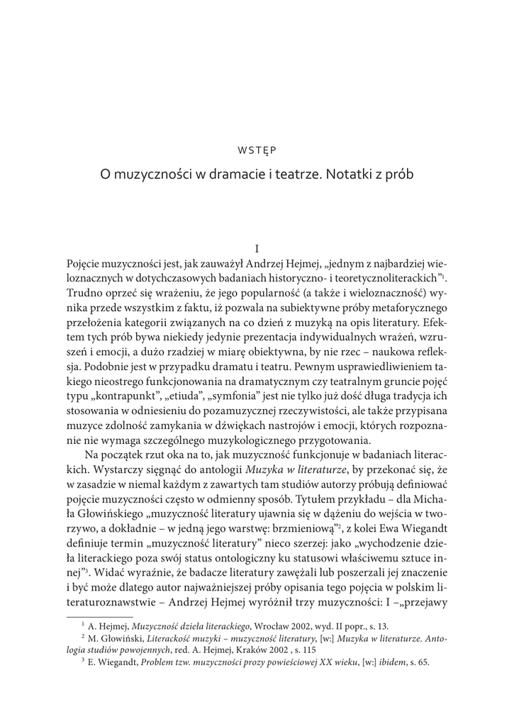 W s t ę p O muzyczności w dramacie i teatrze. Notatki z prób I Pojęcie muzyczności jest, jak zauważył Andrzej Hejmej, „jednym z najbardziej wieloznacznych w dotychczasowych badaniach historyczno- i teoretycznoliterackich”1. Trudno oprzeć się wrażeniu, że jego popularność (a także i wieloznaczność) wynika przede wszystkim z faktu, iż pozwala na subiektywne próby metaforycznego przełożenia kategorii związanych na co dzień z muzyką na opis literatury. Efektem tych prób bywa niekiedy jedynie prezentacja indywidualnych wrażeń, wzruszeń i emocji, a dużo rzadziej w miarę obiektywna, by nie rzec – naukowa refleksja. Podobnie jest w przypadku dramatu i teatru. Pewnym usprawiedliwieniem takiego nieostrego funkcjonowania na dramatycznym czy teatralnym gruncie pojęć typu „kontrapunkt”, „etiuda”, „symfonia” jest nie tylko już dość długa tradycja ich stosowania w odniesieniu do pozamuzycznej rzeczywistości, ale także przypisana muzyce zdolność zamykania w dźwiękach nastrojów i emocji, których rozpoznanie nie wymaga szczególnego muzykologicznego przygotowania. Na początek rzut oka na to, jak muzyczność funkcjonuje w badaniach literackich. Wystarczy sięgnąć do antologii Muzyka w literaturze, by przekonać się, że w zasadzie w niemal każdym z zawartych tam studiów autorzy próbują definiować pojęcie muzyczności często w odmienny sposób. Tytułem przykładu – dla Michała Głowińskiego „muzyczność literatury ujawnia się w dążeniu do wejścia w tworzywo, a dokładnie – w jedną jego warstwę: brzmieniową”2, z kolei Ewa Wiegandt definiuje termin „muzyczność literatury” nieco szerzej: jako „wychodzenie dzieła literackiego poza swój status ontologiczny ku statusowi właściwemu sztuce innej”3. Widać wyraźnie, że badacze literatury zawężali lub poszerzali jej znaczenie i być może dlatego autor najważniejszej próby opisania tego pojęcia w polskim literaturoznawstwie – Andrzej Hejmej wyróżnił trzy muzyczności: I –„przejawy 1 A. Hejmej, Muzyczność dzieła literackiego, Wrocław 2002, wyd. II popr., s. 13. M. Głowiński, Literackość muzyki – muzyczność literatury, [w:] Muzyka w literaturze. Antologia studiów powojennych, red. A. Hejmej, Kraków 2002 , s. 115 3 E. Wiegandt, Problem tzw. muzyczności prozy powieściowej XX wieku, [w:] ibidem, s. 65. 2 8 Wstęp odnoszone do sfery instrumentacji dźwiękowej i prozodii”, II – „poziom tematyzowania muzyki, sposoby prezentowania aspektów dzieła muzycznego w dziele literackim”4 oraz III – „retoryczne strategie wprowadzania kontekstu konstrukcyjności kompozycji muzycznej w obręb utworu literackiego”5. Inaczej spogląda na ten termin człowiek teatru Wojsław Brydak, który w roku 1978 na łamach „Dialogu” ujął muzyczność jako po prostu „cechy właściwe przede wszystkim muzyce, które dają się odkryć poza nią”6 . Mówiąc zatem o muzyczności w dramacie i teatrze, trzeba skupić się właśnie na muzycznych cechach, jakie da się zaobserwować w sztukach i spektaklach, a które funkcjonują poza samą muzyką wpisaną w przedstawienie lub jego projekt (jeśli jako taki potraktować dzieło dramatyczne). W ten sposób nieco na boku pozostaje problem wieloletniego związku teatru i muzyki – współistnienia w postaci opery, wodewilu, operetki, musicalu, gdzie raczej dochodzi do syntezy tych sztuk, prób tworzenia nowych jakości wynikających z ich połączenia (przy zachowaniu pewnej autonomii w ramach spektaklu), a nie tyle wzajemnego przenikania się cech tworzywa teatralnego i muzycznego (umuzycznienia teatru czy teatralizowania muzyki). Teatrolog, próbując badać zagadnienie muzyczności, musi brać pod uwagę zarówno „muzykologiczne”, jak i „potoczne” znaczenia poszczególnych pojęć, będące efektem przeniesienia precyzyjnego kodu muzycznego na znacznie bardziej skomplikowany, niejednoznaczny, a przede wszystkim składający się z wielu tworzyw, kod teatralny. Na pierwszy rzut oka dzieło muzyczne z dziełem teatralnym i dramatycznym zdaje się łączyć wiele. Przede wszystkim są one strukturami czasowymi, muzyka zawiera wszak uporządkowane sekwencje dźwięków, podobnie jak dramat pewne sekwencje wydarzeń. II Dramaturg, porządkując w czasie poszczególne elementy swego dzieła, dysponuje (podobnie jak kompozytor) możliwością tworzenia w scenicznym materiale muzycznych, a raczej quasi-muzycznych struktur. Dzięki tej właściwości muzyczność dramatu jest, że się tak wyrażę, mniej metaforyczna niż wiersza czy powieści. Możliwe jest również przenoszenie muzycznych pojęć na sferę znaczeń w dramacie (tak jest chociażby w Particie na instrument drewniany Stanisława Grochowiaka). Muzycznie można więc „skomponować” nie tylko dźwięki, ale i elementy scenograficzne, kostiumy, światła, ruch sceniczny, wtedy ich wzajemny układ może wydać się ważniejszy niż sfera znaczeń – tu jako przykład przychodzi do 4 A. Hejmej, op. cit., s. 52. Ibidem, s. 62. 6 W. Brydak, O muzyczności, „Dialog” 1978, nr 1. 5 O muzyczności w dramacie i teatrze. Notatki z prób 9 głowy projekt spektaklu Czystej Formy Stanisława Ignacego Witkiewicza, w którym czysto abstrakcyjny porządek wzajemnych relacji poszczególnych elementów wyraźnie zdominował sens: A więc: wychodzą trzy osoby czerwono ubrane i kłaniają się niewiadomo komu. Jedna z nich deklamuje jakiś poemat (powinien on robić wrażenie czegoś koniecznego w tej właśnie chwili). Wchodzi łagodny staruszek z kotem na sznurku. Dotąd wszystko było na tle czarnej zasłony. Zasłona się rozsuwa i widać włoski pejzaż. Słychać muzykę organów. Staruszek mówi coś z postaciami, coś, co musi dawać odpowiedni do wszystkiego poprzedniego nastrój. Ze stolika spada szklanka. Wszyscy rzucają się na kolana i płaczą. Staruszek zmienia się z łagodnego człowieka w rozjuszonego „Pochronia” i mo