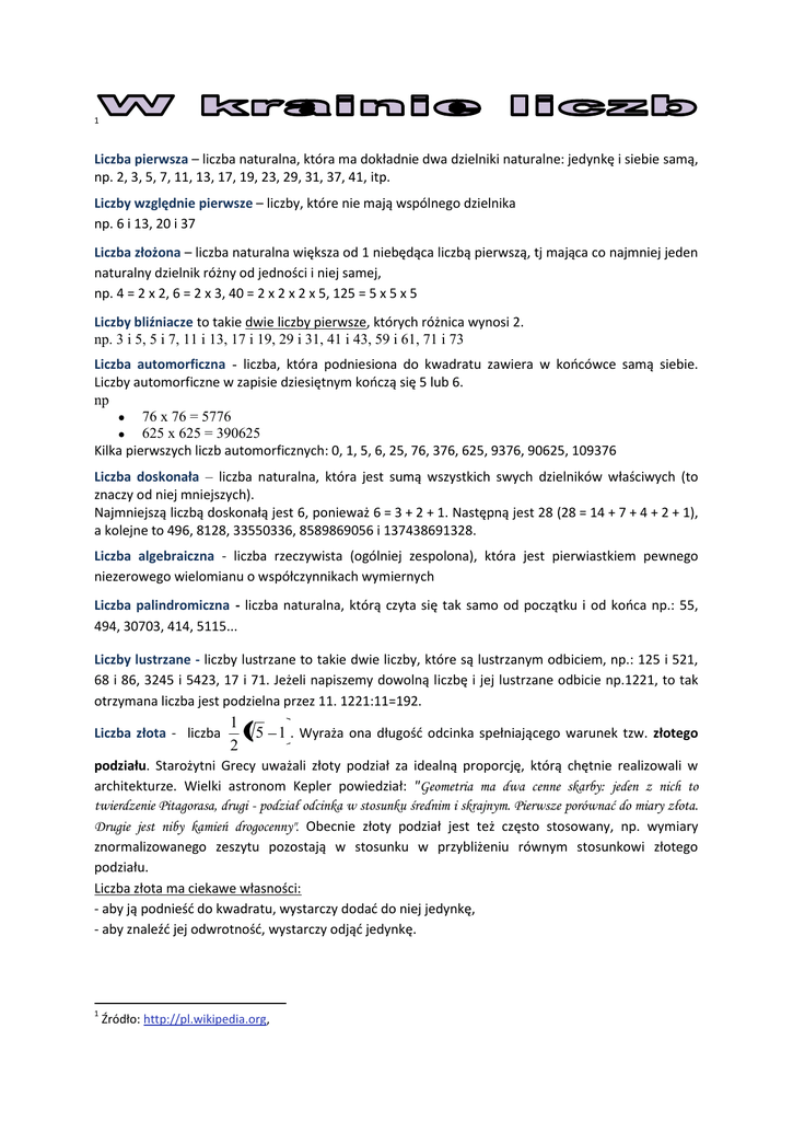 1 Liczba pierwsza – liczba naturalna, która ma dokładnie dwa dzielniki naturalne: jedynkę i siebie samą, np. 2, 3, 5, 7, 11, 13, 17, 19, 23, 29, 31, 37, 41, itp. Liczby względnie pierwsze – liczby, które nie mają wspólnego dzielnika np. 6 i 13, 20 i 37 Liczba złożona – liczba naturalna większa od 1 niebędąca liczbą pierwszą, tj mająca co najmniej jeden naturalny dzielnik różny od jedności i niej samej, np. 4 = 2 x 2, 6 = 2 x 3, 40 = 2 x 2 x 2 x 5, 125 = 5 x 5 x 5 Liczby bliźniacze to takie dwie liczby pierwsze, których różnica wynosi 2. np. 3 i 5, 5 i 7, 11 i 13, 17 i 19, 29 i 31, 41 i 43, 59 i 61, 71 i 73 Liczba automorficzna - liczba, która podniesiona do kwadratu zawiera w koocówce samą siebie. Liczby automorficzne w zapisie dziesiętnym kooczą się 5 lub 6. np 76 x 76 = 5776 625 x 625 = 390625 Kilka pierwszych liczb automorficznych: 0, 1, 5, 6, 25, 76, 376, 625, 9376, 90625, 109376 Liczba doskonała – liczba naturalna, która jest sumą wszystkich swych dzielników właściwych (to znaczy od niej mniejszych). Najmniejszą liczbą doskonałą jest 6, ponieważ 6 = 3 + 2 + 1. Następną jest 28 (28 = 14 + 7 + 4 + 2 + 1), a kolejne to 496, 8128, 33550336, 8589869056 i 137438691328. Liczba algebraiczna - liczba rzeczywista (ogólniej zespolona), która jest pierwiastkiem pewnego niezerowego wielomianu o współczynnikach wymiernych Liczba palindromiczna - liczba naturalna, którą czyta się tak samo od początku i od kooca np.: 55, 494, 30703, 414, 5115... Liczby lustrzane - liczby lustrzane to takie dwie liczby, które są lustrzanym odbiciem, np.: 125 i 521, 68 i 86, 3245 i 5423, 17 i 71. Jeżeli napiszemy dowolną liczbę i jej lustrzane odbicie np.1221, to tak otrzymana liczba jest podzielna przez 11. 1221:11=192. Liczba złota - liczba 1 2 5 1 . Wyraża ona długośd odcinka spełniającego warunek tzw. złotego podziału. Starożytni Grecy uważali złoty podział za idealną proporcję, którą chętnie realizowali w architekturze. Wielki astronom Kepler powiedział: "Geometria ma dwa cenne skarby: jeden z nich to twierdzenie Pitagorasa, drugi - podział odcinka w stosunku średnim i skrajnym. Pierwsze porównać do miary złota. Drugie jest niby kamień drogocenny". Obecnie złoty podział jest też często stosowany, np. wymiary znormalizowanego zeszytu pozostają w stosunku w przybliżeniu równym stosunkowi złotego podziału. Liczba złota ma ciekawe własności: - aby ją podnieśd do kwadratu, wystarczy dodad do niej jedynkę, - aby znaleźd jej odwrotnośd, wystarczy odjąd jedynkę. 1 Źródło: http://pl.wikipedia.org, Zbiór Oznaczenie „szkolne” Oznaczenie standardowe Liczby naturalne bez zera , czasem 1, 2, 3, 4, … Liczby naturalne z zerem 0, 1, 2, 3, … , czasem Liczby całkowite Liczby wymierne w teorii mnogości ω od niem. Quotient – iloraz[7] dadzą się zapisać w postaci p ułamka , q 0 q ich rozwinięcie dziesiętne jest skończone lub okresowe Liczby niewymierne 3, rzadziej używane oznaczenia: od niem. Zahlen – liczby -…-3, -2, -1, 0, 1, 2, 3, … np. , czasem Uwagi czasem ich rozwinięcie dziesiętne jest nieskończone i nieokresowe Liczby rzeczywiste suma liczb wymiernych i niewymierych od ang. real numbers