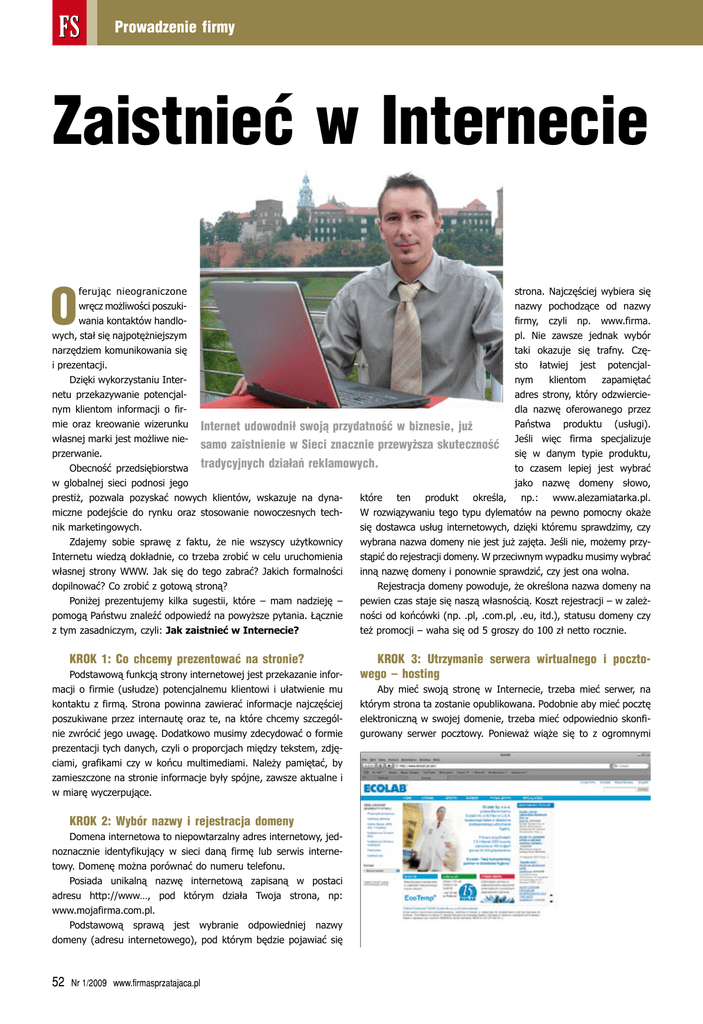 Prowadzenie firmy Zaistnieć w Internecie O ferując nieograniczone strona. Najczęściej wybiera się wręcz możliwości poszukinazwy pochodzące od nazwy wania kontaktów handlofirmy, czyli np. www.firma. wych, stał się najpotężniejszym pl. Nie zawsze jednak wybór narzędziem komunikowania się taki okazuje się trafny. Częi prezentacji. sto łatwiej jest potencjalDzięki wykorzystaniu Internym klientom zapamiętać netu przekazywanie potencjaladres strony, który odzwiercienym klientom informacji o firdla nazwę oferowanego przez mie oraz kreowanie wizerunku Internet udowodnił swoją przydatność w biznesie, już Państwa produktu (usługi). własnej marki jest możliwe nieJeśli więc firma specjalizuje samo zaistnienie w Sieci znacznie przewyższa skuteczność przerwanie. się w danym typie produktu, Obecność przedsiębiorstwa tradycyjnych działań reklamowych. to czasem lepiej jest wybrać w globalnej sieci podnosi jego jako nazwę domeny słowo, prestiż, pozwala pozyskać nowych klientów, wskazuje na dynaktóre ten produkt określa, np.: www.alezamiatarka.pl. miczne podejście do rynku oraz stosowanie nowoczesnych techW rozwiązywaniu tego typu dylematów na pewno pomocny okaże nik marketingowych. się dostawca usług internetowych, dzięki któremu sprawdzimy, czy Zdajemy sobie sprawę z faktu, że nie wszyscy użytkownicy wybrana nazwa domeny nie jest już zajęta. Jeśli nie, możemy przyInternetu wiedzą dokładnie, co trzeba zrobić w celu uruchomienia stąpić do rejestracji domeny. W przeciwnym wypadku musimy wybrać własnej strony WWW. Jak się do tego zabrać? Jakich formalności inną nazwę domeny i ponownie sprawdzić, czy jest ona wolna. dopilnować? Co zrobić z gotową stroną? Rejestracja domeny powoduje, że określona nazwa domeny na Poniżej prezentujemy kilka sugestii, które – mam nadzieję – pewien czas staje się naszą własnością. Koszt rejestracji – w zależpomogą Państwu znaleźć odpowiedź na powyższe pytania. Łącznie ności od końcówki (np. .pl, .com.pl, .eu, itd.), statusu domeny czy z tym zasadniczym, czyli: Jak zaistnieć w Internecie? też promocji – waha się od 5 groszy do 100 zł netto rocznie. KROK 1: Co chcemy prezentować na stronie? Podstawową funkcją strony internetowej jest przekazanie informacji o firmie (usłudze) potencjalnemu klientowi i ułatwienie mu kontaktu z firmą. Strona powinna zawierać informacje najczęściej poszukiwane przez internautę oraz te, na które chcemy szczególnie zwrócić jego uwagę. Dodatkowo musimy zdecydować o formie prezentacji tych danych, czyli o proporcjach między tekstem, zdjęciami, grafikami czy w końcu multimediami. Należy pamiętać, by zamieszczone na stronie informacje były spójne, zawsze aktualne i w miarę wyczerpujące. KROK 2: Wybór nazwy i rejestracja domeny Domena internetowa to niepowtarzalny adres internetowy, jednoznacznie identyfikujący w sieci daną firmę lub serwis internetowy. Domenę można porównać do numeru telefonu. Posiada unikalną nazwę internetową zapisaną w postaci adresu http://www…, pod którym działa Twoja strona, np: www.mojafirma.com.pl. Podstawową sprawą jest wybranie odpowiedniej nazwy domeny (adresu internetowego), pod którym będzie pojawiać się 52 Nr 1/2009 www.firmasprzatajaca.pl KROK 3: Utrzymanie serwera wirtualnego i pocztowego – hosting Aby mieć swoją stronę w Internecie, trzeba mieć serwer, na którym strona ta zostanie opublikowana. Podobnie aby mieć pocztę elektroniczną w swojej domenie, trzeba mieć odpowiednio skonfigurowany serwer pocztowy. Ponieważ wiąże się to z ogromnymi Prowadzenie firmy kosztami (stałe łącze, drogi sprzęt, wysoko kwalifikowani administratorzy, licencje na oprogramowanie itp.) istnieją firmy specjalizujące się w wynajmowaniu serwerów wirtualnych, które dzięki dużej skali przedsięwzięcia oferują swoje usługi bez porównania taniej. Usługi te noszą nazwę hostingu. Hosting polega na udostępnianiu serwera wirtualnego i pocztowego. Jest to miejsce na stronę WWW na komputerze, który jest przyłączony do sieci internetowej 24 godziny na dobę przez 7 dni w tygodniu. Cena usługi waha się od 200 zł netto rocznie do nawet 1600 zł netto rocznie – wszystko w zależności od parametrów hostingu oraz marki dostawcy usługi. KROK 4: Projekt strony WWW W Internecie liczba nowych, atrakcyjnych i obszernych witryn stale się powiększa, a ich forma graficzna, czytelność oraz ergonomia mają zachęcać internautę do bliższego zapoznania się z nimi. Dlatego zlecając wykonanie strony WWW, warto wcześniej przyjrzeć się dotychczasowym produkcjom wykonawcy w tym zakresie i ocenić, czy ich poziom odpowiada naszym wymaganiom. W tym przypadku chodzi o grafika posiadającego doświadczenie w projektowaniu witryn internetowych. Projektując stronę WWW, trzeba przede wszystkim wziąć pod uwagę nie tyle jej estetykę, co funkcjonalność (ergonomię). Internautom bowiem zależy głównie na szybkim dostępie do informacji zgromadzonych w serwisie. We wzorcowo zaprojektowanej witrynie główna część strony zajmuje około 80% ekranu, pozostały obszar przeznaczony jest zaś dla elementów nawigacyjnych. W praktyce trudno osiągnąć „złoty podział”, zwłaszcza gdy dochodzą inne elementy, np. reklamy. Połączenie funkcjonalności z estetyką witryny jest trudne, ale możliwe. Osiągnięcie tej równowagi wymaga dużego wysiłku i kompromisów, z pewnością jednak zaowocuje zadowoleniem internautów. KROK 5: Wykonanie strony WWW Jeśli mamy już domenę i serwer, na którym możemy ją umieścić, dysponujemy kompletem materiałów oraz projektem witryny – przystępujemy do ich kompletnego złożenia, czyli wykonania stron, które będzie można wczytywać za pomocą przeglądarki internetowej. Jeżeli chcemy, aby nasza strona odpowiadała potrzebom i wymaganiom dzisiejszych użytkowników sieci, to niezbędne jest zlecenie wykonania strony 