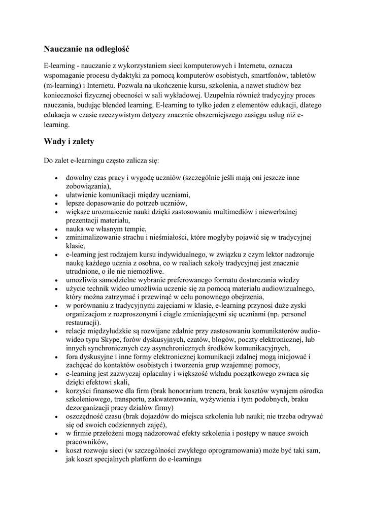Nauczanie na odległość E-learning - nauczanie z wykorzystaniem sieci komputerowych i Internetu, oznacza wspomaganie procesu dydaktyki za pomocą komputerów osobistych, smartfonów, tabletów (m-learning) i Internetu. Pozwala na ukończenie kursu, szkolenia, a nawet studiów bez konieczności fizycznej obecności w sali wykładowej. Uzupełnia również tradycyjny proces nauczania, budując blended learning. E-learning to tylko jeden z elementów edukacji, dlatego edukacja w czasie rzeczywistym dotyczy znacznie obszerniejszego zasięgu usług niż elearning. Wady i zalety Do zalet e-learningu często zalicza się:                  dowolny czas pracy i wygodę uczniów (szczególnie jeśli mają oni jeszcze inne zobowiązania), ułatwienie komunikacji między uczniami, lepsze dopasowanie do potrzeb uczniów, większe urozmaicenie nauki dzięki zastosowaniu multimediów i niewerbalnej prezentacji materiału, nauka we własnym tempie, zminimalizowanie strachu i nieśmiałości, które mogłyby pojawić się w tradycyjnej klasie, e-learning jest rodzajem kursu indywidualnego, w związku z czym lektor nadzoruje naukę każdego ucznia z osobna, co w realiach szkoły tradycyjnej jest znacznie utrudnione, o ile nie niemożliwe. umożliwia samodzielne wybranie preferowanego formatu dostarczania wiedzy użycie technik wideo umożliwia uczenie się za pomocą materiału audiowizualnego, który można zatrzymać i przewinąć w celu ponownego obejrzenia, w porównaniu z tradycyjnymi zajęciami w klasie, e-learning przynosi duże zyski organizacjom z rozproszonymi i ciągle zmieniającymi się uczniami (np. personel restauracji). relacje międzyludzkie są rozwijane zdalnie przy zastosowaniu komunikatorów audiowideo typu Skype, forów dyskusyjnych, czatów, blogów, poczty elektronicznej, lub innych synchronicznych czy asynchronicznych środków komunikacyjnych, fora dyskusyjne i inne formy elektronicznej komunikacji zdalnej mogą inicjować i zachęcać do kontaktów osobistych i tworzenia grup wzajemnej pomocy, e-learning jest zazwyczaj opłacalny i większość wkładu początkowego zwraca się dzięki efektowi skali, korzyści finansowe dla firm (brak honorarium trenera, brak kosztów wynajem ośrodka szkoleniowego, transportu, zakwaterowania, wyżywienia i tym podobnych, braku dezorganizacji pracy działów firmy) oszczędność czasu (brak dojazdów do miejsca szkolenia lub nauki; nie trzeba odrywać się od swoich codziennych zajęć), w firmie przełożeni mogą nadzorować efekty szkolenia i postępy w nauce swoich pracowników, koszt rozwoju sieci (w szczególności zwykłego oprogramowania) może być taki sam, jak koszt specjalnych platform do e-learningu Wady e-learningu opisywane są następująco:    brak osobistego kontaktu z nauczycielem i w związku z tym, jak twierdzą niektórzy, nie jest on już „edukacyjny” w ujęciu czysto filozoficznym (np. według definicji R.S. Petersa, filozofa edukacji) wrażenie odosobnienia, którego doświadczają uczniowie uczący się na odległość, opracowanie materiałów w formie e-learningu jest bardziej czasochłonne niż opracowanie klasycznych drukowanych materiałów edukacyjnych