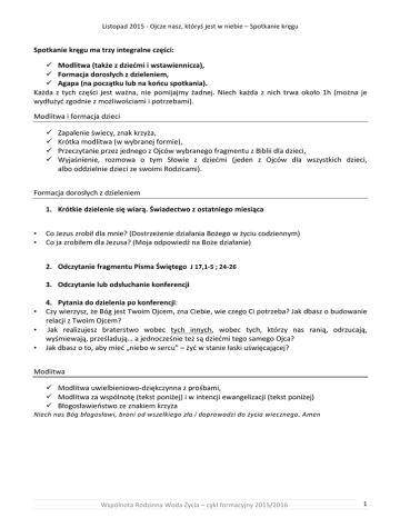 Listopad2015-Ojczenasz,któryśjestwniebie–Spotkaniekręgu Spotkaniekręgumatrzyintegralneczęści: ü Modlitwa(takżezdziećmiiwstawiennicza), ü Formacjadorosłychzdzieleniem, ü Agapa(napoczątkulubnakońcuspotkania). Każda z tych części jest ważna, nie pomijajmy żadnej. Niech każda z nich trwa około 1h (można je wydłużyćzgodniezmożliwościamiipotrzebami). Modlitwaiformacjadzieci ü ü ü ü Zapalenieświecy,znakkrzyża, Krótkamodlitwa(wwybranejformie), PrzeczytanieprzezjednegozOjcówwybranegofragmentuzBibliidladzieci, Wyjaśnienie, rozmowa o tym Słowie z dziećmi (jeden z Ojców dla wszystkich dzieci, albooddzielniedziecizeswoimiRodzicami). Formacjadorosłychzdzieleniem • • • • • 1. Krótkiedzieleniesięwiarą.Świadectwozostatniegomiesiąca CoJezuszrobiłdlamnie?(DostrzeżeniedziałaniaBożegowżyciucodziennym) CojazrobiłemdlaJezusa?(MojaodpowiedźnaBożedziałanie) 2. OdczytaniefragmentuPismaŚwiętegoJ17,1-5;24-26 3. Odczytanielubodsłuchaniekonferencji 4. Pytaniadodzieleniapokonferencji: Czywierzysz,żeBógjestTwoimOjcem,znaCiebie,wieczegoCipotrzeba?Jakdbaszobudowanie relacjizTwoimOjcem? Jak realizujesz braterstwo wobec tych innych, wobec tych, którzy nas ranią, odrzucają, wyśmiewają,prześladują…ajednocześnieteżsądziećmitegosamegoOjca? Jakdbaszoto,abymieć„niebowsercu”–żyćwstaniełaskiuświęcającej? Modlitwa ü Modlitwauwielbieniowo-dziękczynnazprośbami, ü Modlitwazawspólnotę(tekstponiżej)iwintencjiewangelizacji(tekstponiżej) ü Błogosławieństwozeznakiemkrzyża NiechnasBógbłogosławi,broniodwszelkiegozłaidoprowadzidożyciawiecznego.Amen WspólnotaRodzinnaWodaŻycia–cyklformacyjny2015/2016 1 Listopad2015-Ojczenasz,któryśjestwniebie–Spotkaniekręgu KONFERENCJA ModlitwaPańskajeststreszczeniemcałejEwangelii.Wniejjestwszystko–jestmodlitwą podstawowąijużnicdodaćniemożna.Jezustylkopowiedział–proście,aotrzymacie. Czywierzysz,żeBógkochaciebie,jesttwoimOjcemichcetwojegodobra? Czywierzysz,żeOnjestblisko,znaciebie–wie,czegopotrzeba? Czywierzysz,żemożeszmiećrelacjęzBogiem–mówićdoNiego,aOnsłuchaiwysłuchujeciebie? ModlitwaPańskaskładasięzinwokacjiisiedmiupróśb. Dziśrozważymywstępczyliinwokację–Ojczenasz,któryśjestwniebie. 1. Ojcze–Abba–Tatusiu! Jezus ukazuje nam Boga, który jest Ojcem, ale już w Starym Testamencie Bóg jest nazwany Ojcem. Choćby ten tekst z proroka Izajasza – „A jednak, Panie, Tyś naszym Ojcem. Myśmy gliną, a Ty naszym Twórcą, dziełem rąk Twoich jesteśmy wszyscy” Iz 64,7. Jezus nazywa Boga „Ojcem”, do apostołówmówi„MójOjciec”.JezusjestSynemBożym,jestBogiem.Matęsamąnaturęboską,jest równy Ojcu. „Wysławiam Cię Ojcze, Panie nieba i ziemi, że zakryłeś te rzeczy przed mądrymi i roztropnymi,aobjawiłeśjeprostaczkom.WszystkoprzekazałmiOjciecMój.NiktteżnieznaSyna, tylkoOjciec,aniOjcaniktnieznatylkoSyn,iten,komuSynzechceobjawić.”Mt11,25-27.Bógjest niewidzialny,jesttajemnicądlanas,niepojętyinieogarniony,objawianamSwojeobliczeprzezSyna swegoJezusaChrystusa.ObjawiasięjakoOjciec.Ojciectzn.źródłoipoczątekwszystkiego.Ojcostwo Boga w stosunku do nas ma jakby dwa wymiary - mówi nam, że Bóg jest pierwszym początkiem wszystkiego i transcendentnym autorytetem, ale także jednocześnie jest dobrocią i troskliwą miłością obejmującą wszystkie swoje dzieci. Ta ojcowska troskliwość Boga może być wyrażona w obraziemacierzyństwa,któryjeszczebardziejuwypuklaimmanencjęBogaibliskośćmiędzyBogiem aJegostworzeniem.KKK239.MiećOjcatzn.niejesteśmysierotaminatejziemi–skądśwyszliśmyi dokądśidziemy.WyszliśmyzrąknaszegoOjca,Onnascudowniestworzył–idziemydodomuOjca. Jezus nas prowadzi, ukazuje nam cel naszej wędrówki – dom Ojca. Modlimy się w psalmie 139 „Dziękuję Ci, że mnie cudownie stworzyłeś, godne podziwu są Twoje dzieła. I dobrze znasz moją duszę, nie tajna Ci moja istota, kiedy w ukryciu powstawałem, utkany w głębi ziemi. Mnie w zalążku widziały Twoja oczy i w Twej księdze zostały spisane wszystkie dni, które zostały przeznaczone,chociażżadenznichjeszczenienastał”Ps139,14-16.AJezuswmowiepożegnalnej mówiodomuOjca,któryjestcelemnaszejwędrówki–„Niechsięnietrwożysercewasze.wierzycie wBoga?IweMniewierzcie!WdomuOjcamegojestmieszkańwiele.Gdybytakniebyło,tobym Wam powiedział. Idę przecież przygotować wam miejsce, przyjdę powtórnie i zabiorę was do siebie, abyście i wy byli tam, gdzie Ja jestem.” J 14,1-3. Bóg Ojciec jest miłosierny. Takiego Ojca ukazujenamJezuswprzypowieściosynumarnotrawnym,tojestprzypowieśćomiłosiernymOjcu. „A gdy był jeszcze daleko, ujrzał go jego ojciec i wzruszył się głęboko; wybiegł naprzeciw niego, rzuciłmusięnaszyjęiucałowałgo.”Łk15,20.Ojciecwzruszyłsięgłęboko.TakopisujeJezusstan serca Ojca, gdy widzi, że syn wraca. To wzruszenie Ojca trzeba doświadczyć na sobie – bo wszyscy jesteśmy synami, którzy gdzieś się oddalili, gdzieś się pogubili. Ojciec kocha nas miłością bezwarunkową–kochaciebiedziś.TojestpodstawowaprawdaEwangelii:„TakBógumiłowałświat, żedałswegoSyna…”MiłośćmiłosiernaBoga,któryszukaiznajdujeciebie,posyłaSynanaświat,aby przez ofiarę krzyża ocalić ciebie, uratować od unicestwienia. Miłosierdzie Boga jest największym z przymiotów Boga. W grudniu rozpoczniemy Jubileusz Miłosierdzia, czas nadzwyczajny, aby miłosierdzierozlałosiępoświecieludzkichdróg,abyczłowiekmógłzanurzyćsięwmiłosierdziuBoga. WspólnotaRodzinnaWodaŻycia–cyklformacyjny2015/2016 2 Listopad2015-Ojczenasz,któryśjestwniebie–Spotkaniekręgu 2. Mówimy„Ojczenasz” Niemój-Nasztzn.,żenietylkojamówię,alemówiąinni,sąbraciaisiostry,sąinniludzie, którzymówiądoBoga„Ojcze”,awiectenBógjestOjcemichitakdlasiebiejesteśmybraćmi siostrami,tworzymyjednąrodzinębożą.Bógkochakażdegoznasosobiściealetworzyznas rodzinę, wspólnotę, jesteśmy dla siebie w miłości naszego Ojca
