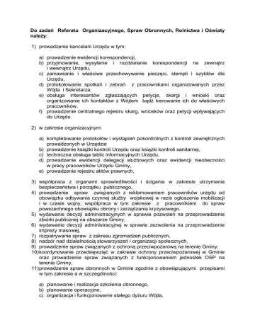 Do zadań Referatu Organizacyjnego, Spraw Obronnych, Rolnictwa i Oświaty należy: 1) prowadzenie kancelarii Urzędu w tym: a) prowadzenie ewidencji korespondencji, b) przyjmowanie, wysyłanie i rozdzielanie korespondencji na zewnątrz i wewnątrz Urzędu, c) zamawianie i właściwe przechowywanie pieczęci, stempli i szyldów dla Urzędu, d) protokołowanie spotkań i zebrań z pracownikami organizowanych przez Wójta i Sekretarza, e) obsługa interesantów zgłaszających petycje, skargi i wnioski oraz organizowanie ich kontaktów z Wójtem bądź kierowanie ich do właściwych pracowników, f) prowadzenie centralnego rejestru skarg, wniosków oraz petycji wpływających do Urzędu. 2) w zakresie organizacyjnym: a) kompletowanie protokołów i wystąpień pokontrolnych z kontroli zewnętrznych prowadzonych w Urzędzie b) prowadzenie książki kontroli Urzędu oraz książki kontroli sanitarnej, c) techniczna obsługa tablic informacyjnych Urzędu, d) prowadzenie ewidencji delegacji służbowych oraz ewidencji nieobecności w pracy pracowników Urzędu Gminy, e) prowadzenie rejestru aktów prawnych, 3) współpraca z organami sprawiedliwości i ścigania w zakresie utrzymania bezpieczeństwa i porządku publicznego, 4) prowadzenie spraw związanych z reklamowaniem pracowników urzędu od obowiązku odbywania czynnej służby wojskowej w razie ogłoszenia mobilizacji i w czasie wojny, współpraca w tym zakresie z pracownikiem do spraw powszechnego obowiązku obrony i zarządzania kryzysowego. 5) wydawanie decyzji administracyjnych w sprawie pozwoleń na przeprowadzenie zbiórki publicznej na obszarze Gminy, 6) wydawanie decyzji administracyjnej w sprawie zezwolenia na przeprowadzenie imprezy masowej, 7) rozpatrywanie spraw z zakresu zgromadzeń publicznych, 8) nadzór nad działalnością stowarzyszeń i organizacji społecznych, 9) prowadzenie spraw związanych z ochroną przeciwpożarową na terenie Gminy, 10) koordynowanie przedsięwzięć w zakresie ochrony przeciwpożarowej w Gminie oraz prowadzenie spraw związanych z funkcjonowaniem jednostek OSP na terenie Gminy, 11) prowadzenie spraw obronnych w Gminie zgodnie z obowiązującymi przepisami w tym zakresie a w szczególności: a) planowanie i realizacja szkolenia obronnego, b) planowanie operacyjne, c) organizacja i funkcjonowanie stałego dyżuru Wójta, d) e) f) g) zadania wykonywane na rzecz Sił Zbrojnych, w tym akcji kurierskiej, planowanie i nakładanie świadczeń na rzecz obrony, rejestracja i kwalifikacja wojskowa, przygotowanie systemu kierowania obroną Gminy, w tym dokumentacja stanowisk kierowania, h) przygotowanie i funkcjonowanie Zastępczych Miejsc Szpitalnych, i) sprawozdawczość w zakresie obronności. j) prowadzenie spraw z zakresu obrony cywilnej w Gminie zgodnie z obowiązującymi przepisami w tym zakresie, 12) prowadzenie spraw z zakresu powszechnego obowiązku obrony: a) prowadzenie spraw związanych z rejestracją oraz kwalifikacją wojskową rejestracji przedpoborowych, b) współudział w organizacji kwalifikacji wojskowej, c) organizowanie doręczenia kart powołania do odbycia ćwiczeń wojskowych oraz do czynnej służby wojskowej w razie ogłoszenia mobilizacji i w czasie wojny, d) prowadzenie spraw związanych z zarządzaniem kryzysowym: e) przygotowanie do działania centrum zarządzania, f) nadzorowanie, planowanie i opracowanie procedur zapewnienia łączności kryzysowej, g) planowanie i realizowanie funkcji ostrzegania i alarmowania, h) utrzymywanie w ciągłej aktualności list powiadamiania osób funkcyjnych o sytuacji kryzysowej, i) zbieranie, analizowanie i opracowywanie informacji dla potrzeb reagowania kryzysowego, j) utrzymanie stałej łączności z osobami dowodzącymi działaniami reagowania kryzysowego w miejscu zdarzenia oraz przekazywanie decyzji Wójta dotyczących prowadzenia akcji, k) opracowywanie i przesyłanie informacji do powiatowego centrum zarządzania kryzysowego, 13) realizacja zadań w zakresie ochrony informacji niejawnych: a) zapewnienie ochrony informacji niejawnych, w tym ich ochrony fizycznej, b) zapewnienie ochrony systemów i sieci teleinformatycznych, w których są wytwarzane, przetwarzane, przechowywane lub przekazywane informacje niejawne, c) kontrola ochrony informacji niejawnych oraz przestrzegania przepisów o ochronie tych informacji, d) okresowa kontrola ewidencji, materiałów i obiegu dokumentów, e) opracowywanie planu ochrony informacji niejawnych i nadzorowanie jego realizacji, f) szkolenie pracowników w zakresie ochrony informacji niejawnych, 15) pełnienie funkcji Pełnomocnika ds. Ochrony Informacji Niejawnych, 16) prowadzenie spraw w zakresie bezpieczeństwa i higieny pracy: a) przestrzeganie przepisów i zasad bhp w Urzędzie, b) przedstawianie Wójtowi Gminy pokontrolnej analizy stanu bhp wraz z koniecznymi wnioskami i propozycjami, c) współdziałanie z PIP, d) prowadzenie rejestru i sporządzanie akt dotyczących wypadków przy pracy, e) organizowanie szkoleń bhp przed dopuszczeniem do pracy i szkoleń okresowych, f) organizowanie badań profilaktycznych pracowników i współdziałanie ze służbą zdrowia w zakresie profilaktycznej opieki zdrowotnej nad pracownikami Urzędu, 17) nadzór nad wykorzystaniem mienia ruchomego będącego własnością Gminy poprzez prowadzenie ewidencji pracy tego sprzętu, prowadzenie rejestru kart drogowych i ich rozliczanie, 18) zadania z zakresu rolnictwa i melioracji: a) prowadzenie spraw z zakresu produkcji roślinnej i zwierzęcej, b) ochrona gruntów rolnych, c) profilaktyka weterynaryjna oraz znakowanie obszarów dotkniętych lub zagrożonych chorobą zakaźną zwierząt, d) współpraca z PIOR w zakresie ochrony roślin uprawnych przed chorobami, szkodnikami i chwastami, e) uczestniczenie w zwalczaniu skutków klęsk żywiołowych, f) aktualizacja dokumentów do spisów rolnych oraz prowadzenie spraw związanych z ich przeprowadzeniem, g) współdziałanie z samorządem rolniczym, prowadzenie spr