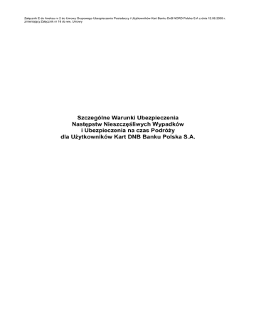 Załącznik E do Aneksu nr 2 do Umowy Grupowego Ubezpieczenia Posiadaczy i Użytkowników Kart Banku DnB NORD Polska S.A z dnia 12.08.2009 r. zmieniający Załącznik nr 16 do ww. Umowy Szczególne Warunki Ubezpieczenia Następstw Nieszczęśliwych Wypadków i Ubezpieczenia na czas Podróży dla Użytkowników Kart DNB Banku Polska S.A. DEFINICJE W niniejszych Szczególnych Warunkach Ubezpieczenia określone wyrazy definiowane są w określony sposób. Definicje te zaznaczane są kursywą i zachowują to samo znaczenie w polisie, wszelkich załącznikach, dodatkach oraz oświadczeniach. Travel Guard - Firma wspomagająca, upoważniona przez Ubezpieczyciela do działania w jego imieniu. Beneficjent - O ile Ubezpieczający lub Osoba ubezpieczona nie uzgodni inaczej, w przypadku śmierci Osoby ubezpieczonej Beneficjentem jest pozostający przy życiu małżonek Osoby ubezpieczonej, będący w pełni władz umysłowych i nie rozwiedziony, a następnie dzieci uznane czy zaadoptowane, a potem prawni spadkobiercy. W przypadku wszelkich innych świadczeń Beneficjentem jest Ubezpieczający lub Osoba ubezpieczona. Choroba - Każda niespodziewana i nagła choroba lub infekcja zdiagnozowana w Okresie ubezpieczenia. Dziecko - Każde dziecko Osoby ubezpieczonej, stanu wolnego i wspólnie z nią zamieszkujące, przed ukończeniem 19 roku życia lub przed ukończeniem 25 roku życia, w przypadku podjęcia nauki w trybie dziennym. Dzienne wynagrodzenie - Jeżeli wynagrodzenie Osoby ubezpieczonej wypłacane jest miesięcznie, Dzienne Wynagrodzenie oznacza średnie miesięczne wynagrodzenie podstawowe brutto z wyłączeniem wynagrodzenia z tytułu nadgodzin, prowizji i premii, z okresu ostatnich trzech miesięcy poprzedzających doznanie Uszkodzenia ciała podzielone przez trzydzieści. Kraj stałego zamieszkania - Kraj, w którym Ubezpieczony zamieszkuje przez okres co najmniej sześć miesięcy i w którym koncentruje się jego życie osobiste i zawodowe. Krajem zamieszkania nie jest kraj, w którym dana osoba przebywa w celu kształcenia się lub do którego jest oddelegowana do pracy. Lekarz - Każdy posiadający odpowiednie uprawnienia i zarejestrowany lekarz, z wyłączeniem: a) Osoby ubezpieczonej, b) Członków najbliższej rodziny Osoby ubezpieczonej, Nieszczęśliwy Wypadek - Oznacza nagłe, niespodziewane zdarzenie spowodowane widocznymi czynnikami zewnętrznymi, niezależne od woli Osoby ubezpieczonej. Okres ochrony - Czas w trakcie trwania Okresu ubezpieczenia, w którym Ubezpieczającemu lub Osobie ubezpieczonej udzielana jest ochrona ubezpieczeniowa (zgodnie z Polisą i dalszym brzmieniem niniejszych Szczególnych Warunków Ubezpieczenia). Okres ubezpieczenia - Od dnia 1 października 2014 roku przez okres 12 miesięcy i jest przedłużany automatycznie na okres następnych 12 miesięcy, o ile umowa ubezpieczenia nie zostanie rozwiązana przez żadną ze Stron.. Osoba ubezpieczona - Użytkownicy Kart DNB Banku Polska S.A., którzy nie ukończyli 70 lat. Ochrona ubezpieczeniowa przysługuje do końca Okresu ubezpieczenia, w którym Osoba ubezpieczona ukończy 70 lat, chyba że Ubezpieczyciel ustali inaczej na piśmie. Planowy Lot - Lot, który rozpoczyna się lub kończy na międzynarodowo uznanym lotnisku zgodnie z opublikowanym grafikiem linii lotniczej lub lot czarterowy. Podróż - Każda podróż rozpoczynająca się w Okresie ubezpieczenia, o planowanej długości nie przekraczającej 180 dni, chyba że Ubezpieczyciel wyrazi pisemnie zgodę na inne warunki. Polisa - Dokument potwierdzający zawarcie umowy ubezpieczenia i przedstawiający szczegóły ubezpieczenia wykupionego przez Ubezpieczającego. Suma ubezpieczenia - Określona w Polisie dla każdego zakresu ubezpieczenia maksymalna kwota, do wysokości której Ubezpieczyciel ponosi odpowiedzialność w przypadku zaistnienia zdarzenia objętego ochroną ubezpieczeniową, z zastrzeżeniem odpowiednich postanowień Szczególnych Warunków Ubezpieczenia. 2 Terroryzm - Akt, włączając zagrożenie lub rzeczywiste użycie siły lub przemocy przez dowolną osobę lub grupę osób działających indywidualnie lub w imieniu jakiejkolwiek organizacji lub rządu lub w związku z nimi, na tle politycznym, religijnym, ideologicznym lub etycznym lub z innych powodów, w tym w zamiarze wywarcia wpływu na dowolny rząd lub w celu zastraszenia społeczeństwa lub jego części. Ubezpieczający - DNB Bank Polska S.A. Ubezpieczyciel - AIG Europe Limited Sp. z o.o. Oddział w Polsce Uszkodzenie ciała - Uraz ciała spowodowany Nieszczęśliwym Wypadkiem, mający miejsce w Okresie ubezpieczenia, a który nie powstawał stopniowo. Uszkodzeniem ciała nie jest: a) Choroba, chyba że stanowi konsekwencję Uszkodzenia ciała; lub b) Zespół stresu pourazowego; lub c) Choroba, stan psychologiczny lub psychiczny z wyłączeniem nieuleczalnej niepoczytalności stanowiącej bezpośredni skutek Nieszczęśliwego Wypadku. Wojna - Każda czynność wynikająca z użycia sił wojskowych lub stanowiąca próbę uczestnictwa w użyciu siły w stosunku do narodów, wojna domowa, rewolucja, inwazja, powstanie, użycie sił wojskowych, przejęcie rządu lub sił wojskowych, celowe wykorzystanie sił wojskowych w celu przejęcia, zapobieżenia, lub zniwelowania skutków aktów Terroryzmu, o których wiedziano lub co do których przeprowadzenia istniały podejrzenia. Zwykłe i uzasadnione koszty - Poniesione opłaty i należności, z wyłączeniem opłat i należności, które nie zostałyby poniesione w przypadku niewykupienia ubezpieczenia oraz opłat i należności za świadczenia medyczne, które z medycznego punktu widzenia nie były niezbędne zarówno w Okresie ubezpieczenia jak i w czasie Podróży/Podróży służbowej (którykolwiek upływa pierwszy). POSTANOWIENIA OGÓLNE Cesja Świadczenia z tytułu niniejszej Umowy nie będą przedmiotem cesji, o ile Ubezpieczyciel nie postanowił inaczej na piśmie. Ochrona danych Ubezpieczający: 1) potwierdza, że Ubez