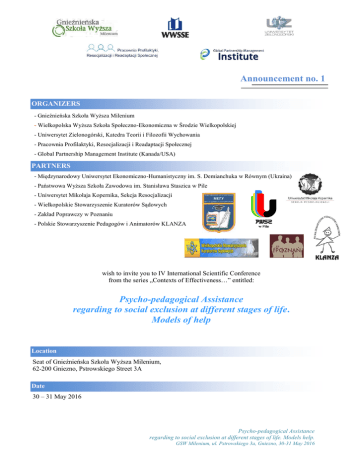Announcement no. 1 ORGANIZERS - Gnieźnieńska Szkoła Wyższa Milenium - Wielkopolska Wyższa Szkoła Społeczno-Ekonomiczna w Środzie Wielkopolskiej - Uniwersytet Zielonogórski, Katedra Teorii i Filozofii Wychowania - Pracownia Profilaktyki, Resocjalizacji i Readaptacji Społecznej - Global Partnership Management Institute (Kanada/USA) PARTNERS - Międzynarodowy Uniwersytet Ekonomiczno-Humanistyczny im. S. Demianchuka w Równym (Ukraina) - Państwowa Wyższa Szkoła Zawodowa im. Stanisława Staszica w Pile - Uniwersytet Mikołaja Kopernika, Sekcja Resocjalizacji - Wielkopolskie Stowarzyszenie Kuratorów Sądowych - Zakład Poprawczy w Poznaniu - Polskie Stowarzyszenie Pedagogów i Animatorów KLANZA wish to invite you to IV International Scientific Conference from the series „Contexts of Effectiveness…” entitled: Psycho-pedagogical Assistance regarding to social exclusion at different stages of life. Models of help Location Seat of Gnieźnieńska Szkoła Wyższa Milenium, 62-200 Gniezno, Pstrowskiego Street 3A Date 30 – 31 May 2016 Psycho-pedagogical Assistance regarding to social exclusion at different stages of life. Models help. GSW Milenium, ul. Pstrowskiego 3a, Gniezno, 30-31 May 2016 I. The Honorary Committee Prof. zw. dr hab. Ireneusz Kubiaczyk, WWSSE Środa Wlkp. Prof. zw. dr hab. Wiesław Ambrozik, UAM Poznań Prof. zw. dr hab. Kazimierz Przyszczypkowski, UAM Poznań Prof. nzw. dr Lechosław Gawrecki, GSW Milenium Prof. dr hab. Anatoli Demianchuk, MEGU w Równym, Ukraina Prof. dr Hamid Kazeroony, European Academy of Management, Minnesota State Colleges, Universities Inver Grove, Minnesota, USA Prof. Ph.D. Peter Odrakiewicz, Ambassador Academy of Management, USA Prof. dr Carol H. Sawyer, University of La Verne, California, USA Dr hab. Jerzy Eider, prof. Uniwersytetu Szczecińskiego Dr Hubert Paluch, Rektor GSW Milenium II. The Scientific Committee Prof. zw. dr hab. Dzierżymir Jankowski, GSW Milenium Prof. zw. dr hab. Jerzy Modrzewski, UAM Prof. zw. dr hab. Urszula Ostrowska, GSW Milenium Prof. zw. dr hab. Andrzej Radziewicz-Winnicki, Uniwersytet Zielonogórski Prof. PhDr. Ingrid Emmerová, PhD., Univerzity Mateja Bela v Banskej Bystrici Prof. PhDr. Jolana Hroncová, CSc., Univerzity Mateja Bela v Banskej Bystrici Doc. PaedDr. Peter Jusko, PhD., Univerzity Mateja Bela v Banskej Bystrici Dr hab. Grażyna Bartkowiak, prof. GSW Milenium Dr hab. Jarosław Bąbka, prof. UZ Dr hab. Stanisława Byra, prof. UMCS Dr hab. Piotr Chomczyński, Uniwersytet Łódzki Dr hab. Marek Furmanek, prof. UZ Dr hab. Mirosław Kowalski, prof. UZ Dr hab. Czesław Kustra, prof. UMK w Toruniu Dr hab. Wojciech J. Maliszewski, PWSZ w Pile Dr hab. Beata Maria Nowak Dr hab. Barbara Toroń-Fórmanek, Uniwersytet Zielonogórski Dr hab. Marek Walancik, prof. WSB Dąbrowa Górnicza Dr hab. Jan Włodarek, prof. WWSSE Środa Wlkp. Doc. dr Przemysław Frąckowiak, PPRiRS, WWSSE Środa Wlkp. Dr Anna Knocińska, PPRiRS, GSW Milenium Dr Ewa Kowalska, Uniwersytet Zielonogórski Dr Danuta Krzysztofiak, PPRiRS, WWSSE Środa Wlkp. Dr Małgorzata Paczyńska-Jędrycka, Uniwersytet Szczeciński Dr Jolanta Spętana, PPRiRS, WWSSE Środa Wlkp. Dr Adam Szecówka, Uniwersytet Wrocławski Dr Michał Szykut, PPRiRS, WSKS, UMK w Toruniu Dr Agata Woźniak, GSW Milenium III. Organizing Committee Dr Iwona Gawrecka, GSW Milenium Dr Aneta Kokot, GSW Milenium Dr Tomasz Siwiec, UMK Toruń Mgr Anna Hedrych-Stanisławska, PPRiRS, GSW Milenium Mgr Sylwia Jabłońska, PPRiRS, GSW Milenium Mgr inż. Natalia Kempiak, GSW Milenium Mgr Joanna Kryza, PWSZ w Pile Psycho-pedagogical Assistance regarding to social exclusion at different stages of life. Models help. GSW Milenium, ul. Pstrowskiego 3a, Gniezno, 30-31 May 2016 IV. Introduction Help, or more precisely: help another human being is an integral part of humanity. Some say that is inscribed in human nature. She accompanied by people for centuries, regardless of where were perceived her sources - in the instinct of sociability and mutual aid, in selfish motives dictated by survival instinct, or perhaps in the requirements of social control and conscious made choices. With the development of civilization tended to develop form and scope of assistance - from informal mutual assistance, family, neighbors through aid activities, charitable, philanthropic individuals, churches, religious associations, to institutionalized forms of social assistance state. A special form of support implemented by the state is psycho-pedagogical Assistance. Psychological and Pedagogical Assistance to a number of professional and therefore conscious and intentional actions of professionals to the different groups and individuals to support their development. Methods and techniques of specialists are focused on a variety of theoretical models help from psychodynamic, through behavioral, behavioral- cognitive, humanistic-existential to the system or integrated. On the approach to helping, the choice of way of working, changes made in the procedures aid is influenced by many factors. These include, among other discoveries of neuroscience, psycho-neuroscience, the development of cognitive science, cybernetics second row. In working with people aided many changes have been inspired by the ideas of postmodernist. A special role is played here constructivism and social constructivism. Specialists in various fields of psychological and pedagogical faced dilemmas concerning the role of "expert help", the limits of its competence, and therefore the limits of interference in the process of change. At the same time the development of health psychology and health education professionals focused attention on preventive actions, supporting and activating the resources of people with developmental disabilities and behavior. Specialists who deal with different areas of psychological and pedagogical faced dilemmas concerning the role of "expert help" the limits of its competence, and therefore the limits of interference in the 