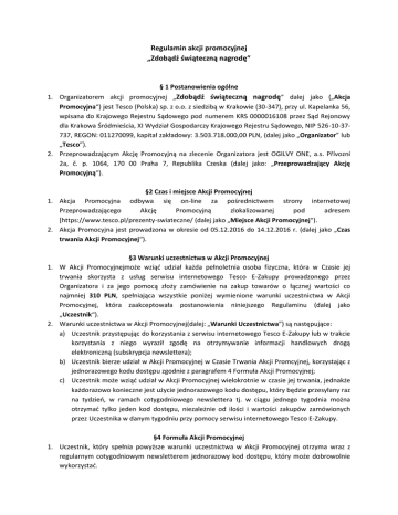 Regulamin akcji promocyjnej „Zdobądź świąteczną nagrodę“ § 1 Postanowienia ogólne 1. Organizatorem akcji promocyjnej „Zdobądź świąteczną nagrodę“ dalej jako („Akcja Promocyjna“) jest Tesco (Polska) sp. z o.o. z siedzibą w Krakowie (30-347), przy ul. Kapelanka 56, wpisana do Krajowego Rejestru Sądowego pod numerem KRS 0000016108 przez Sąd Rejonowy dla Krakowa Śródmieścia, XI Wydział Gospodarczy Krajowego Rejestru Sądowego, NIP 526-10-37737, REGON: 011270099, kapitał zakładowy: 3.503.718.000,00 PLN, (dalej jako „Organizator” lub „Tesco”). 2. Przeprowadzającym Akcję Promocyjną na zlecenie Organizatora jest OGILVY ONE, a.s. Přívozní 2a, č. p. 1064, 170 00 Praha 7, Republika Czeska (dalej jako: „Przeprowadzający Akcję Promocyjną“). §2 Czas i miejsce Akcji Promocyjnej 1. Akcja Promocyjna odbywa się on-line za pośrednictwem strony internetowej Przeprowadzającego Akcję Promocyjną zlokalizowanej pod adresem [https://www.tesco.pl/prezenty-swiateczne/ (dalej jako „Miejsce Akcji Promocyjnej“). 2. Akcja Promocyjna jest prowadzona w okresie od 05.12.2016 do 14.12.2016 r. (dalej jako „Czas trwania Akcji Promocyjnej“). §3 Warunki uczestnictwa w Akcji Promocyjnej 1. W Akcji Promocyjnejmoże wziąd udział każda pełnoletnia osoba fizyczna, która w Czasie jej trwania skorzysta z usług serwisu internetowego Tesco E-Zakupy prowadzonego przez Organizatora i za jego pomocą złoży zamówienie na zakup towarów o łącznej wartości co najmniej 310 PLN, spełniająca wszystkie poniżej wymienione warunki uczestnictwa w Akcji Promocyjnej, która zaakceptowała postanowienia niniejszego Regulaminu (dalej jako „Uczestnik“). 2. Warunki uczestnictwa w Akcji Promocyjnej(dalej: „Warunki Uczestnictwa”) są następujące: a) Uczestnik przystępując do korzystania z serwisu internetowego Tesco E-Zakupy lub w trakcie korzystania z niego wyraził zgodę na otrzymywanie informacji handlowych drogą elektroniczną (subskrypcja newslettera); b) Uczestnik bierze udział w Akcji Promocyjnej w Czasie Trwania Akcji Promcyjnej, korzystając z jednorazowego kodu dostępu zgodnie z paragrafem 4 Formuła Akcji Promocyjnej; c) Uczestnik może wziąd udział w Akcji Promocyjnej wielokrotnie w czasie jej trwania, jednakże każdorazowo konieczne jest użycie jednorazowego kodu dostępu, który będzie przesyłany raz na tydzieo, w ramach cotygodniowego newslettera tj. w ciągu jednego tygodnia można otrzymad tylko jeden kod dostępu, niezależnie od ilości i wartości zakupów zamówionych przez Uczestnika w danym tygodniu przy pomocy serwisu internetowego Tesco E-Zakupy. §4 Formuła Akcji Promocyjnej 1. Uczestnik, który spełnia powyższe warunki uczestnictwa w Akcji Promocyjnej otrzyma wraz z regularnym cotygodniowym newsletterem jednorazowy kod dostępu, który może dobrowolnie wykorzystad. 2. Jeżeli Uczestnik zdecyduje się wziąd udział w Akcji Promocyjnej, wprowadza ten jednorazowy kod dostępu w Miejscu Akcji Promocyjnej [https://www.tesco.pl/prezenty-swiateczne/oraz wprowadza na formularzu następujące dane: imię i nazwisko oraz adres e-mail. 3. Uczestnicy mogą zarejestrowad się wzięcia udziału w Akcji Promocyjnej oraz wprowadzad jednorazowe kody dostępu do dnia 18.12.2016 r. do godz. 23:59. 1. 2. 3. 4. §5 E-kupon Każdy Uczestnik, który dołączy do Akcji Promocyjnej w sposób opisany powyżej, otrzyma gwarantowaną nagrodę w postaci e-kuponu rabatowego o wartości 15 PLNprzy zakupie towaru za ponad 200PLN, który można wykorzystad w ramach usługi Tesco E-Zakupy w okresie od 02.01.2017 r. do 31.01.2017 (dalej jako „E-kupon“). Dodatkowo Uczestnik, który w trakcie trwania Akcji Promocyjnej zdecyduje się zamieścid na stronie internetowej zlokalizowanej w Miejscu Akcji Promocyjnej zdjęcie o tematyce świątecznej, zgodne z hasłem „Nasze magiczne Święta Bożego Narodzenia z Tesco E-Zakupy” zgodne z wymaganiami określonymi w niniejszym Regulaminie otrzyma dodatkowy E-kupon rabatowy o wartości 60 PLNprzy zakupie towaru za ponad 70 PLN, który można wykorzystad w ramach usługi Tesco E-Zakupy w okresie od 02.01.2017 r. do 31.01.2017 r. E-kupony, o których mowa w ustępach powyżej zostaną wysłane na adres e-mail Uczestnika podany w formularzu rejestracyjnym Akcji Promocyjnej. E-kupony mogą byd wykorzystane tylko w ramach usługi Tesco E-Zakupy zamówionej z tego samego adresu e-mail, który został podany przez Uczestnika w formularzu rejestracyjnym Akcji Promocyjnej. §6 Wymagania dotyczące zdjęd 1. Zamieszczane zdjęcia, o których mowa w § 5 ust. 2 Regulaminu, muszą spełniad następujące wymagania: a) Zostały zapisane w formacie JPG, GIF lub PNG. b) stanowią wytwór twórczości Uczestnika i Uczestnik posiada do nich pełnię praw autorskich, w szczególności bez ograniczeo, co do możliwości udzielenia przez Uczestnika licencji na ich publikację przez Organizatora lub Przeprowadzającego Akcję Promocyjną lub innego korzystania z nich. c) Nie naruszają obowiązujących przepisów, dóbr osobistych lub praw osób trzecich, w szczególności praw własności intelektualnej. d) Tematyka oraz treśd zdjęd są zgodne hasłem „Nasze magiczne Święta Bożego Narodzenia z Tesco E-Zakupy” oraz z dobrymi obyczajami, zasadami współżycia społecznego, w szczególności nie propagują treści zabronionych przez prawo, niemoralnych lub w inny sposób niestosownych, nie stanowią promocji podmiotów trzecich, nie naruszają godności osobistej, nie obrażają uczud religijnych, nie stanowią wyrazu dyskryminacji, nie zawierają treści wulgarnych lub obraźliwych. 2. Organizator zastrzega sobie prawo oceny zamieszczonych zdjęd pod kątem ich zgodności z wymaganiami określonymi w niniejszym Regulaminie, a w przypadku uznania ich za niezgodne jest uprawniony do usunięcia takichzdjęd, co skutkowad będzie utratą prawa do dodatkowego Ekuponu. Ocena Organizatora w tym zakresie jest ostateczna. 3. O
