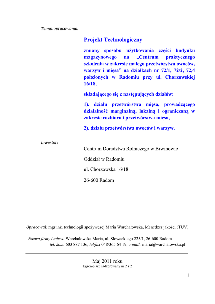 Projekt Technologiczny - Centrum Doradztwa Rolniczego w Brwinowie