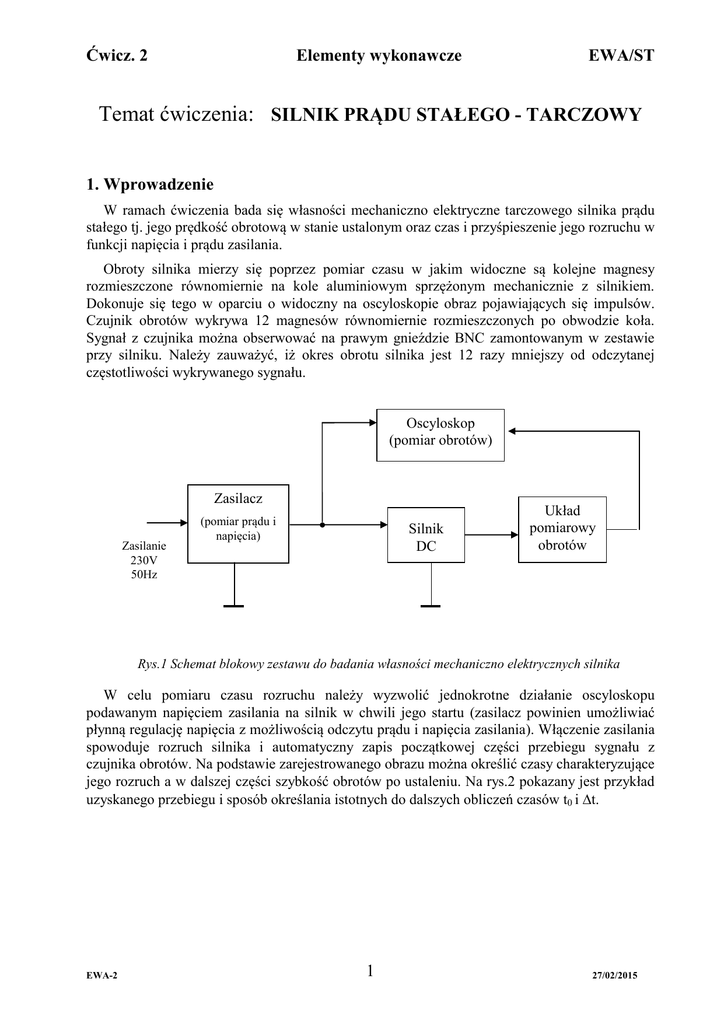 Ćwicz. 2 Elementy wykonawcze EWA/ST Temat ćwiczenia: SILNIK PRĄDU STAŁEGO - TARCZOWY 1. Wprowadzenie W ramach ćwiczenia bada się własności mechaniczno elektryczne tarczowego silnika prądu stałego tj. jego prędkość obrotową w stanie ustalonym oraz czas i przyśpieszenie jego rozruchu w funkcji napięcia i prądu zasilania. Obroty silnika mierzy się poprzez pomiar czasu w jakim widoczne są kolejne magnesy rozmieszczone równomiernie na kole aluminiowym sprzężonym mechanicznie z silnikiem. Dokonuje się tego w oparciu o widoczny na oscyloskopie obraz pojawiających się impulsów. Czujnik obrotów wykrywa 12 magnesów równomiernie rozmieszczonych po obwodzie koła. Sygnał z czujnika można obserwować na prawym gnieździe BNC zamontowanym w zestawie przy silniku. Należy zauważyć, iż okres obrotu silnika jest 12 razy mniejszy od odczytanej częstotliwości wykrywanego sygnału. Oscyloskop (pomiar obrotów) Zasilacz Zasilanie 230V 50Hz (pomiar prądu i napięcia) Silnik DC Układ pomiarowy obrotów Rys.1 Schemat blokowy zestawu do badania własności mechaniczno elektrycznych silnika W celu pomiaru czasu rozruchu należy wyzwolić jednokrotne działanie oscyloskopu podawanym napięciem zasilania na silnik w chwili jego startu (zasilacz powinien umożliwiać płynną regulację napięcia z możliwością odczytu prądu i napięcia zasilania). Włączenie zasilania spowoduje rozruch silnika i automatyczny zapis początkowej części przebiegu sygnału z czujnika obrotów. Na podstawie zarejestrowanego obrazu można określić czasy charakteryzujące jego rozruch a w dalszej części szybkość obrotów po ustaleniu. Na rys.2 pokazany jest przykład uzyskanego przebiegu i sposób określania istotnych do dalszych obliczeń czasów t0 i t. EWA-2 1 27/02/2015 Ćwicz. 2 Elementy wykonawcze EWA/ST t t0 Rys.2 Sygnał obrazujący rozruch silnika t0 - jest to czas w jakim silnik obróci tarczę z rozmieszczonymi 12 magnesami od momentu jego włączenia aż do momentu gdy najbliżej położony głowicy magnes znajdzie się przy niej. t - jest to okres w jakim silnik dokona obrotu tarczy od momentu t0 o kąt =3600/24=150 (maksymalne wartości na zarejestrowanym przebiegu odpowiadają momentom gdy poszczególne magnesy znajdują się przy głowicy, minima gdy głowica jest pomiędzy magnesami). Na ich podstawie, przy założeniu, że przyśpieszenie kątowe obrotu silnika a jest stałe (można takie założenie przyjąć dla początkowej fazy rozruchu) wzór uzależniający obrót tarczy po czasie t0 o kąt i szukane przyśpieszenie mają postać: =at0t+ at2 a=/ (t0t + t2) czyli (1) W ćwiczeniu dokonuje się korelacji obrotów silnika z prądem i napięciem zasilającym silnik oraz jego przyśpieszeniem kątowym. 2. Zestaw aparatury - Zasilacz - - EWA-2 silnik prądu stałego (tarczowy PTT-11 WAMEL) z zestawem czujników, -urządzenie pomiaru obrotów, oscyloskop i komputer. 2 27/02/2015 Ćwicz. 2 Elementy wykonawcze EWA/ST 3. Zadania 3.1 Włączyć zasilacz i ustawić maksymalną wartość ograniczenia prądowego (gałka CURRENT w prawej pozycji). Ustawić napięcie zasilające na poziomie ok. 2V. W urządzeniu pomiaru obrotów w panelu czujniki włączyć przycisk HALL. (Pozostałe przyciski nie mają znaczenia). Uruchomić program oscyloskopu (ikona Pc_lab2000se). Sprawdzić poprawność ustawienia w menu; powinno być zaznaczone : w oknie USB-Device PCSU 1000 a w oknie LPT-Device NON. Przy prawidłowo włączonym oscyloskopie świeci jego żółty wskaźnik. Ustawić podstawę czasu na wartość 20ms lub 50ms. Sprawdzić, przy wyłączonym wyzwalaniu (trigger off), czy są widoczne sygnały z czujnika obrotów – sygnał zbliżony kształtem do sinusoidalnego na poziomie kilkunastu mV– a na drugim kanale oscyloskopu poziom zasilania (obydwa kanały powinny mieć ustawione wejście DC). 3.2 Włączyć wyzwalanie z kanału na którym obserwuje się zasilanie silnika (np. Trigger on dla Ch2). Ustawić poziom wyzwalania na ok. 1V (na ekranie oscyloskopu, z lewej strony, widoczny znacznik czułości triggera). Ustawić rodzaj pracy oscyloskopu na single i podłączyć zasilanie silnika (końcówka przewodu do gniazda + zasilacza). W momencie podłączania zasilania powinno nastąpić wyzwolenie rejestracji oscyloskopu. Włączyć markery (okno View) i wykorzystać je do określenia: czasów charakteryzujących rozruch silnika (opis – rys.2) oraz okres obrotu w stanie ustalonym. Stan ustalony można zarejestrować po dłuższym czasie rozpędzania się silnika. Najwygodniej jest powtórzyć pomiar z wyłączona synchronizacją oscyloskopu. Zanotować odczytane czasy i zapisać obrazy (z ustawionymi prawidłowo markerami) w pamięci komputera dla pomiaru przyśpieszenia oraz prędkości obrotów silnika. Pomiary: obrotów silnika, napięcia, prądu oraz czasów rozruchu t0 i t wykonać dla napięć od 2V do 5V co 0.5V Wyniki badań archiwizować w obu formatach, to jest: obraz (png) i dane (txt). Uwaga: wartość napięcia i prądu odczytuje się ze wskazania na zasilaczu. Należy, w sprawozdaniu udokumentować wybrane przykładowo obrazy pokazujące pomiar czasu rozruchu i prędkości obrotu z prawidłowo ustawionymi markerami. 4. Opracowanie wyników. 4.1 Zamieścić tabelę pomiarową i wyniki obliczeń (należy zamieścić wzory użyte do obliczeń oraz co najmniej dwa przykładowe obliczenia z podstawionymi pomierzonymi wielkościami). 4.2 Zamieścić uwagi i wnioski. EWA-2 3 27/02/2015