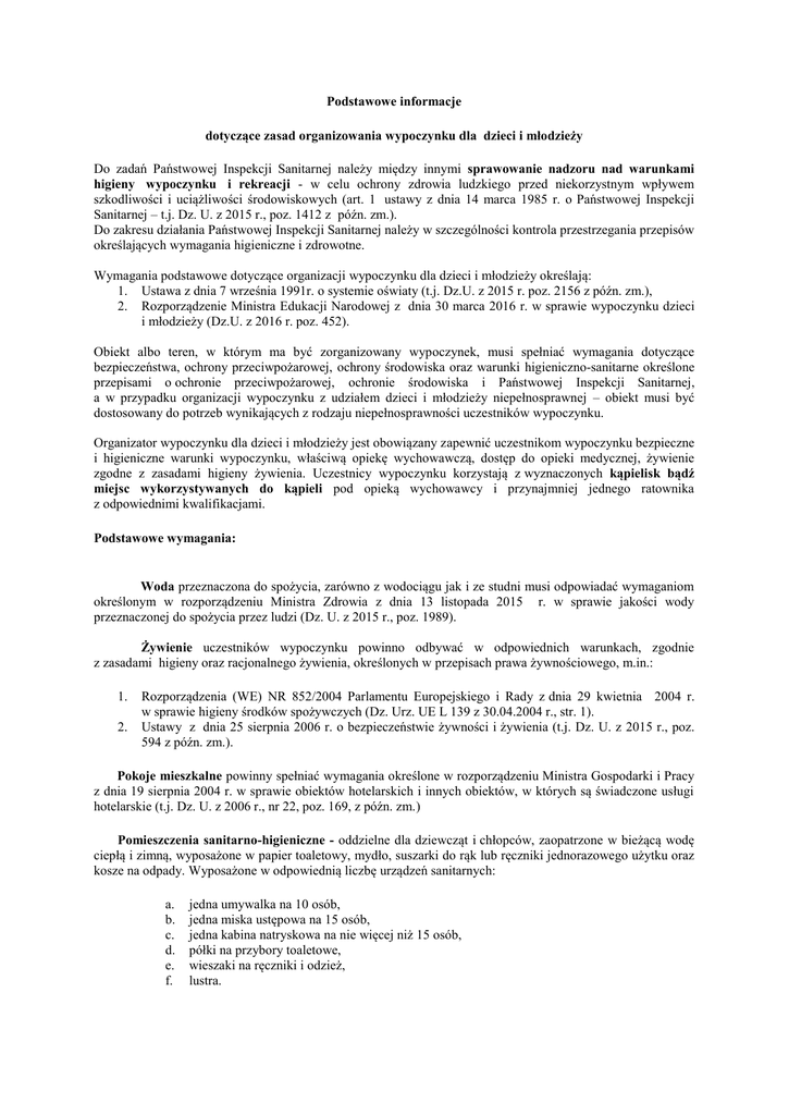 Podstawowe informacje dotyczące zasad organizowania wypoczynku dla dzieci i młodzieży Do zadań Państwowej Inspekcji Sanitarnej należy między innymi sprawowanie nadzoru nad warunkami higieny wypoczynku i rekreacji - w celu ochrony zdrowia ludzkiego przed niekorzystnym wpływem szkodliwości i uciążliwości środowiskowych (art. 1 ustawy z dnia 14 marca 1985 r. o Państwowej Inspekcji Sanitarnej – t.j. Dz. U. z 2015 r., poz. 1412 z późn. zm.). Do zakresu działania Państwowej Inspekcji Sanitarnej należy w szczególności kontrola przestrzegania przepisów określających wymagania higieniczne i zdrowotne. Wymagania podstawowe dotyczące organizacji wypoczynku dla dzieci i młodzieży określają: 1. Ustawa z dnia 7 września 1991r. o systemie oświaty (t.j. Dz.U. z 2015 r. poz. 2156 z późn. zm.), 2. Rozporządzenie Ministra Edukacji Narodowej z dnia 30 marca 2016 r. w sprawie wypoczynku dzieci i młodzieży (Dz.U. z 2016 r. poz. 452). Obiekt albo teren, w którym ma być zorganizowany wypoczynek, musi spełniać wymagania dotyczące bezpieczeństwa, ochrony przeciwpożarowej, ochrony środowiska oraz warunki higieniczno-sanitarne określone przepisami o ochronie przeciwpożarowej, ochronie środowiska i Państwowej Inspekcji Sanitarnej, a w przypadku organizacji wypoczynku z udziałem dzieci i młodzieży niepełnosprawnej – obiekt musi być dostosowany do potrzeb wynikających z rodzaju niepełnosprawności uczestników wypoczynku. Organizator wypoczynku dla dzieci i młodzieży jest obowiązany zapewnić uczestnikom wypoczynku bezpieczne i higieniczne warunki wypoczynku, właściwą opiekę wychowawczą, dostęp do opieki medycznej, żywienie zgodne z zasadami higieny żywienia. Uczestnicy wypoczynku korzystają z wyznaczonych kąpielisk bądź miejsc wykorzystywanych do kąpieli pod opieką wychowawcy i przynajmniej jednego ratownika z odpowiednimi kwalifikacjami. Podstawowe wymagania: Woda przeznaczona do spożycia, zarówno z wodociągu jak i ze studni musi odpowiadać wymaganiom określonym w rozporządzeniu Ministra Zdrowia z dnia 13 listopada 2015 r. w sprawie jakości wody przeznaczonej do spożycia przez ludzi (Dz. U. z 2015 r., poz. 1989). Żywienie uczestników wypoczynku powinno odbywać w odpowiednich warunkach, zgodnie z zasadami higieny oraz racjonalnego żywienia, określonych w przepisach prawa żywnościowego, m.in.: 1. 2. Rozporządzenia (WE) NR 852/2004 Parlamentu Europejskiego i Rady z dnia 29 kwietnia 2004 r. w sprawie higieny środków spożywczych (Dz. Urz. UE L 139 z 30.04.2004 r., str. 1). Ustawy z dnia 25 sierpnia 2006 r. o bezpieczeństwie żywności i żywienia (t.j. Dz. U. z 2015 r., poz. 594 z późn. zm.). Pokoje mieszkalne powinny spełniać wymagania określone w rozporządzeniu Ministra Gospodarki i Pracy z dnia 19 sierpnia 2004 r. w sprawie obiektów hotelarskich i innych obiektów, w których są świadczone usługi hotelarskie (t.j. Dz. U. z 2006 r., nr 22, poz. 169, z późn. zm.) Pomieszczenia sanitarno-higieniczne - oddzielne dla dziewcząt i chłopców, zaopatrzone w bieżącą wodę ciepłą i zimną, wyposażone w papier toaletowy, mydło, suszarki do rąk lub ręczniki jednorazowego użytku oraz kosze na odpady. Wyposażone w odpowiednią liczbę urządzeń sanitarnych: a. b. c. d. e. f. jedna umywalka na 10 osób, jedna miska ustępowa na 15 osób, jedna kabina natryskowa na nie więcej niż 15 osób, półki na przybory toaletowe, wieszaki na ręczniki i odzież, lustra. Ponadto w obiekcie powinny być wydzielone pomieszczenia na: pranie i suszenie mokrej odzieży uczestników wypoczynku, przechowywanie sprzętu porządkowego i środków czystości, brudną i czystą bieliznę pościelową. Organizator wypoczynku dzieci i młodzieży w zależności od rodzaju zakwaterowania powinien zadbać o właściwe przygotowanie zaplecza sanitarnego takiego jak: wc, śmietniki, pojemniki na śmieci oraz posiadać aktualne umowy na wywóz nieczystości stałych i płynnych. Personel wypoczynku powinien posiadać do wglądu dokumentację zdrowotną (np. badania do celów sanitarno-epidemiologicznych). Możliwość skorzystania z kąpieli jest jednym z elementów dobrze zorganizowanego wypoczynku dzieci i młodzieży. W przypadku dzieci wskazane jest wydzielenie na obszarze wodnym strzeżonego, oznakowanego miejsca przeznaczonego do kąpieli, zaznaczenie stref dla małych dzieci i osób nie umiejących pływać. Ponadto teren przy kąpieliskach należy wyposażyć w urządzenia sanitarne. Woda w kąpieliskach powinna spełniać wymagania rozporządzanie Ministra Zdrowia z 8 kwietnia 2011 r. w sprawie prowadzenia nadzoru nad jakością wody w kąpielisku i w miejscu wykorzystywanym do kąpieli (Dz. U. z 2011 r., Nr 86 poz. 478 z późn. zm.). Badanie jakości wody kąpieliska i miejsca wykorzystywanego do kąpieli jest jednym z zadań i obowiązków organizatora kąpieliska bądź miejsca wykorzystywanego do kąpieli . Dodatkowe wymagania dla obozów pod namiotami W zakresie organizacji obozów pod namiotami (dla liczby uczestników nie przekraczającej 50 osób) obowiązuje „Instrukcja Głównego Inspektora Sanitarnego w sprawie wymagań higieniczno sanitarnych dla stacjonarnych obozów pod namiotami Warszawa czerwiec 2010 r.” – zamieszczona w podstronie. Każda placówka wypoczynku winna posiadać między innymi: wynik badania wody przeznaczonej do spożycia; ocenę jakości wody kąpieliska lub miejsca wykorzystywanego do kąpieli; kopie umowy na wywóz nieczystości; dokumentację zdrowotną personelu (badania do celów sanitarno epidemiologicznych); dokumentację zdrowotną uczestników (karta kwalifikacyjna uczestnika); instrukcje / procedury dotyczące dobrej praktyki higienicznej, które należy przedkładać do wglądu właściwym organom kontroli. Przepisy prawne: 1. 2. 3. 4. 5. 6. Ustawa z dnia 14 marca 1985 r. o Państwowej Inspekcji Sanitarnej (t.j. Dz. U. z 2015 r., poz. 1412 z późn. zm.). Ustawa z dnia 7 września 19