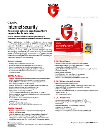 Informacje o produkcie Kompletna ochrona przed wszystkimi zagrożeniami z Internetu. G DATA InternetSecurity 2008 to najdokładniejsza i najszybsza ochrona przed wirusami, spamem i hakerami. Dzięki połączeniu metody podwójnego skanowania z technologią OutbreakShield, G DATA InternetSecurity 2008 zapewnia dokładne i najszybsze wykrywanie złośliwych programów przy minimalnym obciążeniu komputera. Nowością w wersji 2008 jest Firewall, zoptymalizowany dla 20 najpopularniejszych gier online. W skład pakietu wchodzi też filtr spamu rozpoznający wiadomości w 10 językach, moduł kontroli rodzicielskiej, filtr treści stron internetowych i wiele innych. Surfowanie może być przyjemnością! Bezpieczeństwo G DATA AntiSpam • • • • • • Nowość Rozpoznawanie wiadomości w 10 językach • Obsługa wszystkich programów pocztowych: Outlook, Outlook Express, Mozilla itp. (POP3) • Spam-OutbreakShield rozpoznaje i blokuje nowe wysyłki masowe w ułamku sekundy • Liczne kryteria filtrowania • Predefiniowane filtry oraz algorytm samouczący • Indywidualne traktowanie wiadomości • Dowolna ilość konfigurowalnych filtrów użytkownika Podgląd stanu wszystkich zabezpieczeń Wsparcie dla systemów Windows w technologii 64-bit Ochrona ważniejszych protokołów komunikacyjnych Poprawiona obsługa poszczególnych składników pakietu W cenie roczna aktualizacja sygnatur wirusów i upgrade do nowszej wersji G DATA AntiVirus • Nowość Udoskonalona technologia podwójnego skanowania jest jeszcze bardziej dokładna i powoduje mniejsze obciążenie • OutbreakShield – Natychmiastowa ochrona przed nowymi wirusami, już po upływie 0,5 do 2 minut • Nowość Lepsza ochrona przed wirusami, robakami, rootkitami, spyware, dialerami, trojanami, backdoorami itp. • Doskonałe rozpoznanie formatów kompresji • Wykrywanie i neutralizacja rootkitów • Ochrona komunikatorów internetowych (MSN, Yahoo, AOL) • Ochrona poczty w programach Outlook, Outlook Express, Mozilla, Opera itd. (POP3 / IMAP) • Automatyczne skanowanie pobieranych plików • Ochrona rejestru i pliku hosts • Kwarantanna • Nowość Lekki interfejs użytkownika • Automatyczne skanowanie i aktualizacja baz wirusów G DATA Firewall • • • • • • Nowość Optymalizacja dla 20 najpopularniejszych gier PC Nowość Tryb Autopilota Kontrola wszystkich wychodzących i przychodzących połączeń Automatyczne tworzenie reguł dla wszystkich programów Cztery gotowe zestawy reguł i szczegółowy tryb zaawansowany Blokowanie ataków typu DoS, Ping of Death, skanowanie portów Wymagania programu: Komputer z systemem Windows® VistaTM (32/64-bit), Windows® XP z SP2 (32/64-bit), Windows® 2000 z SP4 od 256 MB RAM Dostęp do Internetu G DATA Kontrola rodzicielska • • • • • Definiowalne profile użytkowników Wbudowane filtry treści według kategorii (erotyka, przemoc itp.) Czasowa blokada dostępu do komputera lub Internetu Definiowalne filtry treści Białe listy stron internetowych: po włączeniu dostępne są tylko strony zawarte na listach. • Ochrona ustawień hasłem G DATA WebFilter • Dodatek do przeglądarek Internet Explorer i Firefox • Usuwanie prywatnych informacji (cookies, pamięć cache, historia itp.) • Blokowanie znanych stron stosujących phishing (cogodzinne aktualizacje) • Blokowanie banerów i pop-upów • Wyłączanie animacji Flash, skryptów Java Script, VB Script Bezpiecznie. Bezpieczniej. G DATA Software.