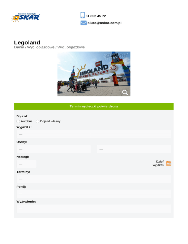 61 852 45 72 [email protected] Legoland Dania / Wyc. objazdowe / Wyc. objazdowe Termin wycieczki potwierdzony Dojazd: Autobus Dojazd własny Wyjazd z: Osoby: Noclegi: Dzień wyjazdu Terminy: Pokój: Wyżywienie: Najtańsza oferta Zaliczka do 5 marca 2017: 99,00 zł do 5 marca 2017: 99,00 zł Suma: 99,00 zł Opis oferty Miejscowość Legoland Duński Park Legoland w Billund jest najstarszym i największym parkiem wśród wszystkich Parków Opinie Logoland na świecie. Park został otwarty w 1968 roku. Rocznie przyciąga około 1,8 mln odwiedzających w różnym wieku i jest tym samym największą duńską atrakcją turystyczną poza Kopenhagą. Wszystko w Rozkład Bilund jazdy jest zbudowane z klocków Lego, a obserwowane z wysokości przypomina miasteczko. Legoland W Legolandzie znajdują się różne atrakcje, między innymi miniatury autentycznych budowli (stadion drużyny FC Kopenhaga, Pałac Królewski, olbrzymi posąg Indianina, statua wolności i inne miniatury, związane zwłaszcza z tematyką duńską), karuzele, kina. Ponadto organizowane są także spektakle z udziałem aktorów. W Legolandzie znajduje się również ponad 30-metrowej wysokości kolejka górska oraz hotel o nazwie "Hotel Legoland". Park zajmuje powierzchnię 123 000 m2. Park podzielony jest na kilka krain tematycznych- DUPLO® Land, Imagination Zone, LEGOREDO® Town, Adventure Land, Miniland, Pirate Land, Polar Land, Knights Kingdom. Zakwaterowanie Oferta nie obejmuje zakwaterowania. Ubezpieczenie Warunki ubezpieczenia Bezpieczne Podróże Signal Iduna dokument do pobrania www.oskar.com.pl/zalaczniki/owu Warunki ubezpieczenia Kosztów Imprezy Turystycznej Signal Iduna dokument do pobrania www.oskar.com.pl/zalaczniki/owurg Pakiet KOMFORT gwarancja wyboru miejsca w autokarze napoje w autokarze w cenie (6 x do wyboru: kawa, herbata, zimny napój 0,2l) cena: 50 zł/os Pakiet PRESTIGE gwarancja wyboru miejsca w autokarze napoje w autokarze w cenie (6 x do wyboru: kawa, herbata, zimny napój 0,2l) pierwszeństwo wejścia na pokład autokaru nadbagaż 5 kg w cenie napoje do obiadokolacji (0,2l) cena: 100 zł/os Karta Dużej Rodziny www.oskar.com.pl/zalaczniki/karta_duzej_rodziny Warunki promocji FIRST MINUTE www.oskar.com.pl/zalaczniki/warunki_promocji Turystyczny Fundusz Gwarancyjny W związku z powołaniem do życia w dniu 26.11.2016 Turystycznego Funduszu Gwarancyjnego każdy klient Biura Podróży Oskar zobowiązany jest do zapłaty kwoty w wysokości 10zł/os. przy każdorazowej rezerwacji imprezy turystycznej (obowiązuje od dnia 26.11.2016). Kwota przeznaczona na Turystyczny Fundusz Gwarancyjny zostanie automatycznie doliczona do wartości rezerwacji (w momencie jej dokonania). Wyjątkiem są imprezy turystyczne odbywające się w krajach posiadających granicę z Rzeczpospolitą Polską. Składka nie jest przychodem biura. DWUpak i TRZYpak DWUpak z rabatem do 25% na osobe TRZYpak z rabatem do 50% na osobe Promocja obowiązuje przy zakupie 2 lub 3 spośród typów ofert: Karnawał w Wenecji, Wyspa Tropikalna, Legoland, Heide Park, Alzacja: Strasburg + Colmar, Festiwal Tulipanów i Amsterdam, Parada Kwiatów, Hamburg + Kraina M iniatur, Kopenhaga + Ogrody Tivoli, Salzburg i Hallstatt, Wodospad Rheinfall i Wyspa M ainau. Rabat naliczany jest od ceny podstawowej i dotyczy najtańszej spośród wybranych ofert. Istnieje możliwość dowolnej kombinacji rezerwacji wyjazdów przy zalożeniu, że dane osobowe uczestników nie ulegają zmianie. Udogodnienia Klimatyzacja Animacje dla dzieci Regulowane fotele Tacki Zawodowy kierowca Pasy bezpieczeństwa Toaleta w autokarze Podnóżki Dla rodzin z dziećmi Bez paszportu Program ramowy Dzień 1 (piątek) Wyjazd wg. rozkładu jazdy, nocny przejazd przez Niemcy. Dzień 2 (sobota) Przyjazd do Billund. Całodzienny pobyt w krainie zabawy i przygód. Markę klocków Lego znają wszyscy. W parku każdy znajdzie coś dla siebie, zarówno dzieci, jak i dorośli, spędzą tam fantastyczny dzień. Wrażenie robią modele słynnych obiektów, zachwyca park miniatur ze znanymi budynkami, stolicami, miastami, wioskami, zbudowany z 20 mln klocków oraz miasteczko z Dzikiego Zachodu, gdzie spotkać można poszukiwaczy złota, kowbojów, Indian, szeryfa, a także udać się na przejażdżkę pociągiem lub canoe. W Strefie Wyobraźni znajduje się akwarium i największe w Skandynawii kino 4D. W godzinach wieczornych wyjazd w drogę powrotną. Nocny przejazd przez Niemcy. Dzień 3 (niedziela) Przyjazd do Polski. Cena obejmuje przejazd autokarem klasy LUX (klimatyzacja, cafe - bar, DVD, WC) opiekę pilota w czasie podróży ubezpieczenie SIGNAL IDUNA (KL 10000 euro, NNW 10000 zł, BP 500 zł) Cena nie obejmuje Dopłaty wymagane na miejscu bilet wstępu do Legoland 45 euro/os; płatne obowiązkowo u pilota w autokarze Informacje dodatkowe dokument tożsamości: paszport lub dowód osobisty Chcesz wiedzieć szybciej? Polub nas na facebooku OSKAR Sp. z o.o. pl.Wolności 2/4c, 61-738 Poznań Potrzebujesz pomocy? Zadzwoń lub napisz: 61 852 45 72 [email protected] Zadzwoń Projekt i wdrożenie: Simply User