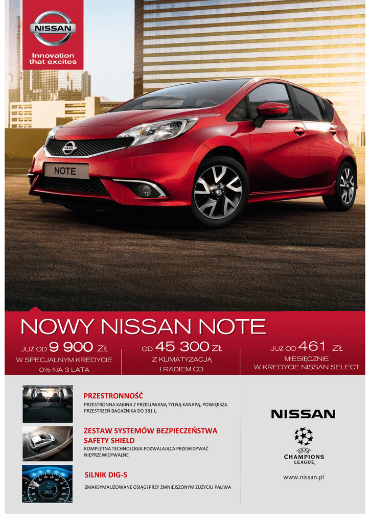 NOWY NISSAN NOTE JUŻ OD 9 900 ZŁ OD 45 300 300 ZŁ W SPECJALNYM KREDYCIE Z KLIMATYZACJĄ 0% NA 3 LATA I RADIEM CD JUŻ OD 461 MIESIĘCZNIE W KREDYCIE NISSAN SELECT PRZESTRONNOŚĆ PRZESTRONNA KABINA Z PRZESUWANĄ TYLNĄ KANAPĄ, POWIĘKSZA PRZESTRZEŃ BAGAŻNIKA DO 381 L. ZESTAW SYSTEMÓW BEZPIECZEŃSTWA SAFETY SHIELD KOMPLETNA TECHNOLOGIA POZWALAJĄCA PRZEWIDYWAĆ NIEPRZEWIDYWALNE SILNIK DIG-S ZMAKSYMALIZOWANE OSIĄGI PRZY ZMNIEJSZONYM ZUŻYCIU PALIWA ZŁ www.nissan.pl MODELE EURO6 JUŻ OD JUŻ OD 9 900 ZŁ W SPECJALNYM KREDYCIE 0% NA 3 LATA 41 300 300 ZŁ JUŻ OD 461 zł MIESIĘCZNIE 1 EURO6 NOTE | CENNIK PROMOCYJNY Silnik benzynowy VISIA ACENTA ACENTA PLUS N-TEC TEKNA 1.2 l 59 kW (80 KM) - MT 4.7 l/100 km 41 300 47 800 52 500 56 800 59 300 1.2 l DIG-S 72kW (98 KM) - MT 4.3 l/100 km - 54 600 58 500 62 800 65 300 1.2 l DIG-S 72kW (98 KM) - CVT 5.1 l/100 km - 59 700 63 600 67 900 70 400 3.5 l/100 km 52 100 58 600 63 300 67 600 70 100 VISIA ACENTA ACENTA PLUS N-TEC TEKNA 4 000 S - - - - 1 700 S S S - - 2 300 S S Przednie reflektory przeciwmgłowe Automatyczna klimatyzacja Automatyczne światła i czujnik deszczu - 2 500 S S S NissanConnect Kamera cofania Zestaw systemów bezpieczeństwa Safety Shield - - 3 800 S S Zewnętrzny pakiet stylizacyjny z 16" felgami ze stopów metali lekkich - 3 000 3 000 2 500 3 000 System inteligentnego kluczyka I-Key z przyciskiem Start/Stop - 1 000 1 000 S Szklany dach - - - - 2 000 2 000 2 000 2 000 2 000 2 000 880 800 880 800 880 800 880 800 880 800 Silniki diesla 1.5 dCi 66 kW (90 KM) - MT WYPOSAŻENIE OPCJONALNE Pakiet Comfort Klimatyzacja manualna Radio CD Pakiet Rodzinny Przyciemniane szyby Podłokietnik kierowcy i tylny Przesuwana tylna kanapa System aranżacji przestrzeni bagażowej Karakuri 3 tylne zagłówki Nowy NissanConnect z 5.8" kolorowym wyświetlaczem dotykowym Gniazdo USB i MP3, iPod + 6 głośników Nissan Connect Pakiet Auto Pakiet IT 2 Pakiet sport Lakier metalizowany 4 lata lub 100 000 km Nissan 5★ Rozszerzona Gwarancja 4 1 000 2 3 5 lat lub 100 000 km 1 820 1 650 1 820 1 650 1 820 1 650 1 820 1 650 1 820 1 650 5 lat lub 150 000 km 2 220 2 000 2 220 2 000 2 220 2 000 2 220 2 000 2 220 2 000 S - Standard 1 - W celu zapoznania się ze szczegółami ofert odwiedź najbliższą placówkę dealerską 2 - System inteligentnego kluczyka I-key jest standardowym wyposażeniem Pakietu IT w wersji Acenta Plus 3 - Dostępne tylko w wersji Tekna z silnikiem 1.2 DIG-S 4 - Nissan 5★ Rozszerzona Gwarancja Umowa Ubezpieczenia Grupowego jest produktem ubezpieczeniowym; w celu uzyskania bliższych informacji prosimy zapoznać się z broszurą informacyjną oraz Ogólnymi Warunkami Ubezpieczenia dostępnymi u Autoryzowanych Dealerów EURO6 NOTE | CENNIK PODSTAWOWY Silnik benzynowy VISIA ACENTA ACENTA PLUS N-TEC TEKNA 1.2 l 59 kW (80 KM) - MT 4.7 l/100 km 44 390 50 890 55 590 59 890 62 390 1.2 l DIG-S 72kW (98 KM) - MT 4.3 l/100 km - 57 690 61 590 65 890 68 390 1.2 l DIG-S 72kW (98 KM) - CVT 5.1 l/100 km - 62 790 66 690 70 990 73 490 3.5 l/100 km 55 190 61 690 66 390 70 690 73 190 VISIA ACENTA ACENTA PLUS N-TEC TEKNA 4 000 S - - - - 1 700 S S S - - 2 300 S S Przednie reflektory przeciwmgłowe Automatyczna klimatyzacja Automatyczne światła i czujnik deszczu - 2 500 S S S NissanConnect Kai Kamera cofania Zestaw systemów bezpieczeństwa Safety Shield - - 3 800 S S - 3 000 3 000 2 500 3 000 System inteligentnego kluczyka I-Key z przyciskiem Start/Stop - 1 000 1 000 S Szklany dach - - - - 2 000 2 000 2 000 2 000 2 000 2 000 880 800 880 800 880 800 880 800 880 800 5 lat lub 100 000 km 1 820 1 650 1 820 1 650 1 820 1 650 1 820 1 650 1 820 1 650 5 lat lub 150 000 km 2 220 2 000 2 220 2 000 2 220 2 000 2 220 2 000 2 220 2 000 Silniki diesla 1.5 dCi 66 kW (90 KM) - MT WYPOSAŻENIE OPCJONALNE Pakiet Comfort Klimatyzacja manualna Radio CD Pakiet Rodzinny Przyciemniane szyby Podłokietnik kierowcy i tylny Przesuwana tylna kanapa System aranżacji przestrzeni bagażowej Karakuri 3 tylne zagłówki Nowy NissanConnect Kai z 5.8" kolorowym wyświetlaczem dotykowym Gniazdo USB i MP3, iPod + 6 głośników Nissan Connect Pakiet Auto Pakiet IT 1 Zewnętrzny pakiet stylizacyjny z 16" felgami ze stopów metali lekkich Pakiet sport Lakier metalizowany 4 lata lub 100 000 km Nissan 5★ Rozszerzona Gwarancja 3 1 000 1 S - Standard 1 - System inteligentnego kluczyka I-key jest standardowym wyposażeniem Pakietu IT w wersji Acenta Plus 2 - Dostępne tylko w wersji Tekna z silnikiem 1.2 DIG-S 3 - Nissan 5★ Rozszerzona Gwarancja Umowa Ubezpieczenia Grupowego jest produktem ubezpieczeniowym; w celu uzyskania bliższych informacji prosimy zapoznać się z broszurą informacyjną oraz Ogólnymi Warunkami Ubezpieczenia dostępnymi u Autoryzowanych Dealerów 2 NOTE | WYPOSAŻENIE BEZPIECZEŃSTWO VISIA ACENTA ACENTA PLUS N-TEC TEKNA - - - - - Przednie, czołowe poduszki powietrzne (kierowcy i pasażera) Przednie, boczne poduszki powietrzne Kurtynowe poduszki powietrzne Wyłącznik przedniej poduszki pasażera Trzypunktowe pasy bezpieczeństwa dla wszystkich miejsc Sygnalizator braku zapięcia pasów bezpieczeństwa kierowcy Punkty zaczepu fotelika dla dziecka ISOFIX przy tylnych zewnętrznych fotelach Zabezpieczenie drzwi tylnych przed otwarciem przez dzieci Regulacja położenia kolumny kierownicy ESP + ABS + BA Tempomat z funkcją ograniczenia prędkości Opony o niskich oporach toczenia Koło zapasowe (dojazdowe) Immobilizer WYGLĄD ZEWNĘTRZNY 15" stalowe felgi z kołpakami 15" felgi ze stopów metali lekkich - 16" felgi ze stopów metali lekkich - P/ DIG-S P/ DIG-S Chromowana obwódka wlotu powietrza Zderzaki w kolorze nadwozia Lusterka i klamki zewnętrzne w kolorze nadwozia - Lusterka i klamki zewnętrzne w kolorze satynowym - - - P - - Reflektory do jazdy dziennej Tylne lampy w technologii LED Przednie reflektory przeciwmgłowe Lusterka zewnętrzne regulowane elektrycznie Lusterka zewnętrzne regulowane i podgrzewane + kierunkowskazy w technologii LED - Przyciemniane szyby