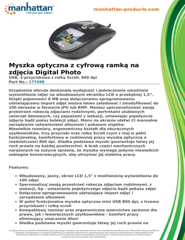Myszka optyczna z cyfrową ramką na zdjęcia Digital Photo USB, 3-przyciskowa z rolką Scroll, 800 dpi Part No.: 177498 Urządzenie oferuje doskonałą wydajność i jednocześnie umożliwia wyświetlanie zdjęć na wbudowanym ekraniku LCD o przekątnej 1,5”. Dzięki pojemności 8 MB oraz dołączonemu oprogramowaniu ułatwiającemu import zdjęć można łatwo załadować i zmodyfikować do 100 obrazów w formacie JPG lub BMP. Możesz spersonalizować swoją przestrzeń roboczą zdjęciami rodzinnymi, portretami ulubionych zwierząt domowych, czy pejzażami z wakacji, ustawiając pojedyncze zdjęcia bądź pokaz kolekcji zdjęć. Menu na ekranie ułatwi Ci manualne zarządzanie ustawieniami albumem i pokazem slajdów. Niewielkie rozmiary, ergonomiczny kształt dla oburęcznych użytkowników, trzy przyciski oraz rolka Scroll czyni z niej w pełni funkcjonalną, komfortową w codziennej pracy myszkę optyczną o rozdzielczości 800 dpi. Gładka podstawa myszki gwarantuje łatwy jej ruch prawie na każdej powierzchni. A brak części mechanicznych narażonych na zużycie sprawia, że myszka wymaga jedynie niewielkich zabiegów konserwacyjnych, aby utrzymać jej stabilną pracę. Features: Wbudowany, jasny, ekran LCD 1,5" z możliwością wyświetlania do 100 zdjęć Spersonalizuj swoją przestrzeń roboczą zdjęciam rodzinnymi, z wakacji, itp - ustawianie pojedynczego zdjęcia bądź pokazu zdjęć Dołączone oprogramowanie ułatwiające import zdjęć i zarządzanie albumem W pełni funkcjonalna myszka optyczna mini USB 800 dpi, z trzema przyciskami i rolką scroll Kompaktowy rozmiar oraz ergonomiczne wzornictwo zarówno dla prawo, jak i leworęcznych użytkowników - komfort pracy eliminujący zmęczenie dłoni Gładka podstawa myszki gwarantuje łatwy jej ruch prawie na O pełną ofertę produktów Manhattan pytaj lokalnego resellera lub odwiedź stronę www.manhattan-products.com. Wszystkie nazwy handlowe i towarów występujące w niniejszej publikacji są znakami towarowymi zastrzeżonymi lub nazwami zastrzeżonymi odpowiednich firm odnośnych właścicieli i zostały zamieszczone wyłącznie celem identyfikacji. Dystrybucja i reprodukcja powyższych dokumentów, wykorzystanie zawartości jest zabronione. każdej powierzchni Instalacja Plug and Play; współpraca z systemami Windows Gwarancja "Lifetime Warranty" Specyfikacja: Standardy i certyfikaty: • USB 1.1 • CE • FCC • RoHS • WEEE Parametry techniczne: • Myszka: optyczna, rozdzielczość 800 dpi • Ekran: 1,5” TFT-LCD • Pamięć: 8 MB (możliwość przechowywania do 107 zdjęć) • Obsługiwane formaty: BMP, JPG • Przyciski: prawy i lewy przycisk myszy z rolką scroll, up, down, reset oraz przyciski menu • Żywotność przełączania: 1000000 cykli • Materiał: plastik ABS • Współpraca z systemami Windows XP/Vista/7 Wymiary: • Myszka: 10 x 5,5 x 3,25 cm; waga: 85 g • Kabel USB o długości 120 cm Parametry fizyczne: • Temperatura pracy: 0 – 40°C • Temperatura przechowywania: -15 – 60°C • Wilgotność: O pełną ofertę produktów Manhattan pytaj lokalnego resellera lub odwiedź stronę www.manhattan-products.com. Wszystkie nazwy handlowe i towarów występujące w niniejszej publikacji są znakami towarowymi zastrzeżonymi lub nazwami zastrzeżonymi odpowiednich firm odnośnych właścicieli i zostały zamieszczone wyłącznie celem identyfikacji. Dystrybucja i reprodukcja powyższych dokumentów, wykorzystanie zawartości jest zabronione.