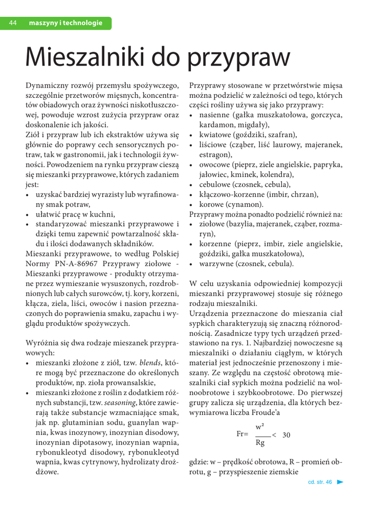 44 maszyny i technologie Mieszalniki do przypraw Dynamiczny rozwój przemysłu spożywczego, szczególnie przetworów mięsnych, koncentratów obiadowych oraz żywności niskotłuszczowej, powoduje wzrost zużycia przypraw oraz doskonalenie ich jakości. Ziół i przypraw lub ich ekstraktów używa się głównie do poprawy cech sensorycznych potraw, tak w gastronomii, jak i technologii żywności. Powodzeniem na rynku przypraw cieszą się mieszanki przyprawowe, których zadaniem jest: • uzyskać bardziej wyrazisty lub wyrafinowany smak potraw, • u łatwić pracę w kuchni, • standaryzować mieszanki przyprawowe i dzięki temu zapewnić powtarzalność składu i ilości dodawanych składników. Mieszanki przyprawowe, to według Polskiej Normy PN-A-86967 Przyprawy ziołowe Mieszanki przyprawowe - produkty otrzymane przez wymieszanie wysuszonych, rozdrobnionych lub całych surowców, tj. kory, korzeni, kłącza, ziela, liści, owoców i nasion przeznaczonych do poprawienia smaku, zapachu i wyglądu produktów spożywczych. Wyróżnia się dwa rodzaje mieszanek przyprawowych: • mieszanki złożone z ziół, tzw. blends, które mogą być przeznaczone do określonych produktów, np. zioła prowansalskie, • mieszanki złożone z roślin z dodatkiem różnych substancji, tzw. seasoning, które zawierają także substancje wzmacniające smak, jak np. glutaminian sodu, guanylan wapnia, kwas inozynowy, inozynian disodowy, inozynian dipotasowy, inozynian wapnia, rybonukleotyd disodowy, rybonukleotyd wapnia, kwas cytrynowy, hydrolizaty drożdżowe. Przyprawy stosowane w przetwórstwie mięsa można podzielić w zależności od tego, których części rośliny używa się jako przyprawy: • nasienne (gałka muszkatołowa, gorczyca, kardamon, migdały), • k wiatowe (goździki, szafran), • liściowe (cząber, liść laurowy, majeranek, estragon), • owocowe (pieprz, ziele angielskie, papryka, jałowiec, kminek, kolendra), • cebulowe (czosnek, cebula), • k łączowo-korzenne (imbir, chrzan), • korowe (cynamon). Przyprawy można ponadto podzielić również na: • ziołowe (bazylia, majeranek, cząber, rozmaryn), • korzenne (pieprz, imbir, ziele angielskie, goździki, gałka muszkatołowa), • warzywne (czosnek, cebula). W celu uzyskania odpowiedniej kompozycji mieszanki przyprawowej stosuje się różnego rodzaju mieszalniki. Urządzenia przeznaczone do mieszania ciał sypkich charakteryzują się znaczną różnorodnością. Zasadnicze typy tych urządzeń przedstawiono na rys. 1. Najbardziej nowoczesne są mieszalniki o działaniu ciągłym, w których materiał jest jednocześnie przenoszony i mieszany. Ze względu na częstość obrotową mieszalniki ciał sypkich można podzielić na wolnoobrotowe i szybkoobrotowe. Do pierwszej grupy zalicza się urządzenia, dla których bezwymiarowa liczba Froude’a Fr= w2 Rg < 30 gdzie: w – prędkość obrotowa, R – promień obrotu, g – przyspieszenie ziemskie cd. str. 46 46 maszyny i technologie Rys. 1. Klasyfikacja mieszalników ciał sypkich Dla mieszalników bębnowych wielkości w oraz R przyjmuje się dla wewnętrznej powierzchni bębna, dla mieszalników ślimakowych R jest promieniem mieszadła ślimakowego zaś w -odpowiadającą temu promieniowi prędkością obwodową. Najczęściej używanymi mieszalnikami przypraw są: mieszalnik bębnowy i mieszalnik stożkowy. Mieszalnik bębnowy poziomy (rys. 2) o działaniu ciągłym składa się z bębna cylindrycznego 1 z podłużnymi przegrodami 2, które podnoszą materiał sypki do góry. Bęben ma dwa pierścienie 3 spoczywające na rolkach 4, z których dwie połączone wałem są wprawiane w ruch obrotowy, powodując obrót bębna. Wewnątrz bębna znajdują się dwie przegrody pionowe 5, nie połączone z bębnem, między którymi są umieszczone skośnie półki 6. Materiał sypki jest zasypywany z kosza zasypowego 7. Uniesiony do góry opada w dół pod działaniem siły ciężkości między skośne półki, a następnie do dolnej części bębna bliżej wysypu. Półki skośne zapewniają przesuwanie materiału sypkie- go wzdłuż bębna. Mieszanina opadając do kosza 8 jest odprowadzana z mieszalnika. W mieszalnikach z mieszadłami mechanicznymi zmianę położenia cząstek, a więc i ich ruch, powodują mieszadła wykonujące ruch obrotowy. Spośród bardzo dużej liczby mieszalników tego typu należy wymienić przede wszystkim mieszalniki z mieszadłami ślimakowymi. Przedstawiony na rys. 3 mieszalnik z mieszadłami ślimakowymi składa się z dwóch stożków 1 i 2 przenikających się i tworzących w górnej części jedną wspólną przestrzeń. Wewnątrz tych stożków znajdują się mieszadła ślimakowe 3 i 4, których wały zajmują położenie równoległe do tworzących tych stożków. Mieszadła są wprawiane w ruch obrotowy wokół osi własnych i ruch obrotowy wokół osi stożków za pomocą odpowiedniego układu napędowego 5. Materiał doprowadzany króćcem 6 wskutek złożonego ruchu mieszadeł podlega mieszaniu, przesuwając się stopniowo do króćca wysypowego 7, którym jest odprowadzany na zewnątrz. cd. str. 48 48 maszyny i technologie Rys. 2. Mieszalnik bębnowy poziomy: 1 - bęben poziomy, 2 - przegrody, 3 - pierścienie, 4 - rolki, 5 - przegrody pionowe, 6 - półki skośne, 7, 8 - kosze W codziennej działalności można zetknąć się ze stołowym mieszalnikiem do przypraw, ziół, dodatków funkcjonalnych sypkich SPme-8 (rys. 4a). Dzięki temu urządzeniu szybko i dokładnie sporządzimy niewielką porcję mieszanek różnorodnych komponentów sypkich, takich jak przyprawy, zioła, dodatki funkcjonalne. Mieszalnik SPme-8 to wygodne i nie- Rys. 3. Mieszalnik dwustożkowy z mieszadłami ślimakowymi: 1, 2 - stożki, 3, 4 - mieszadła ślimakowe, 5 - układ napędowy, 6 - króciec zasypowy, 7 - króciec wysypowy wielkie urządzenie, które może być postawione wprost na blacie stołu. Jego pojemność to 8 dm3. Wyposażone jest w miesz