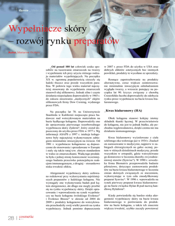 Opinie _ Medycyna estetyczna Wypełniacze skóry – rozwój rynku preparatów Autor_Marianne Wolters _Od ponad 100 lat człowiek szuka sposobów na tuszowanie zmarszczek na twarzy i wypełnianie ich przy użyciu różnego rodzaju materiałów wypełniających. Na początku XX w. ogromną popularnością cieszyły się ludzki tłuszcz oraz przede wszystkim paraina. W połowie tego wieku materiał najczęściej stosowany do wypełniania zmarszczek stanowił olej silikonowy. Jednak silne i częste działania niepożądane doprowadziły w 1965 r. do zakazu stosowania „medycznych” olejów silikonowych irmy Dow Corning, wydanego przez FDA. Na początku lat 70. na Uniwersytecie Stanforda w Kalifornii rozpoczęto prace badawcze nad wstrzykiwanym materiałem na bazie bydlęcego kolagenu. Doprowadziły one do opracowania pierwszego resorbowalnego wypełniacza skóry Zyderm®, który został dopuszczony do użytku przez FDA w 1977 r. Wg informacji ASAPS z 1997 r. iniekcje kolagenowe były najczęściej wykonywanym zabiegiem minimalnie inwazyjnym na świecie. Od 1981 r. wypełniacze kolagenowe są dopuszczone do stosowania i sprzedawane w Europie i stały się także tutaj tzw. złotym standardem w walce ze zmarszczkami. Wadą tego produktu była z jednej strony konieczność wcześniejszego badania przeciwko potencjalnym reakcjom immunogennym, z drugiej – stosunkowo niska trwałość efektu. Alergenność wypełniaczy skóry usiłowano redukować przy wykorzystaniu najróżniejszych preparatów z ludzkiego kolagenu. Nie wymagały one wykonywania badań pod kątem alergenności, ale długo nie mogły przebić się na rynku wypełniaczy skóry. Dzięki opracowaniu i wprowadzeniu na rynek wypełniaczy na bazie kolagenu świńskiego Evolence® i Evolence Breeze® w okresie od 2004 do 2009 r. produkty kolagenowe do wstrzykiwania przechodziły swój wielki powrót na rynku wypełniaczy. Jednak pomimo dopuszczenia 28 cosmetic 2_2014 w 2007 r. przez FDA do użytku w USA oraz dobrych efektów estetycznych bez istotnych powikłań, produkty te wycofano ze sprzedaży. Rosnące zapotrzebowanie na produkty alternatywne, coraz większe zainteresowanie minimalnie inwazyjnym odmładzaniem wyglądu twarzy, a wreszcie panujący na początku lat 90. kryzys związany z chorobą Creutzfelda-Jacoba doprowadziły do zdobycia rynku przez wypełniacze na bazie kwasu hialuronowego. _Kwas hialuronowy (HA) Obok kolagenu stanowi kolejny istotny składnik tkanki łącznej. W przeciwieństwie do kolagenu, nie jest to jednak białko, ale pochodna węglowodanowa, dzięki czemu nie ma działania immunogennego. Kwas hialuronowy wyizolowano z ciała szklistego oka wołowego już w 1934 r. Znalazł on zastosowanie w medycynie, najpierw w zabiegach chirurgicznych na gałce ocznej, potem w różnych dziedzinach medycyny, przede wszystkim w ortopedii, gdzie wstrzykiwano go dostawowo w leczeniu choroby zwyrodnieniowej stawów (Synvisc®). W 1990 r. szwedzka irma Biomatrix przeprowadziła badanie pilotażowe, dotyczące zastosowania produktów na bazie kwasu hialuronowego w leczeniu zmian skórnych związanych ze starzeniem, wykorzystując w tym celu zmodyikowany preparat Synvisc®. W 1996 r. wprowadziła na rynek pierwszy preparat kwasu hialuronowego na bazie związku Hylan B pod nazwą handlową Hylaform®. Kiedy potwierdziła się bardzo niska alergenność wypełniaczy skóry na bazie kwasu hialuronowego w porównaniu do produktów na bazie kolagenu, a także ich znacznie większa trwałość, szybko zaczęły powstawać Opinie _ Medycyna estetyczna kolejne produkty na bazie HA. Obok produktów pochodzenia ptasiego, pozyskiwanych z kogucich grzebieni, takich jak Hylaform®, opracowywano kolejne produkty na bazie HA pochodzącego ze źródeł bakteryjnych (Streptococcus equi). Powstało także pojęcie NASHA (non animal stabilized hyaluronic acid – stabilizowany kwas hialuronowy pochodzenia niezwierzęcego), opisujące produkty szwedzkiej irmy Qmed. Ponadto, usieciowany sulfon dwuwinylowy (DVS), stosowany w materiale Hylaform®, zastąpiono eterem 1,4-diglicydowym butanediolu (BDDE). Uzyskano w ten sposób hydrożel w postaci do wstrzykiwania o właściwościach wiskoelastycznych, który w 1996 r. traił na rynek europejski pod nazwą handlową Restylane® jako produkt 2. generacji. Dopiero w grudniu 2003 r. preparat Restylane® został dopuszczony przez FDA do użytku w USA jako pierwszy wypełniacz na bazie HA. Od tej chwili wypełniacze na bazie HA zdominowały światowy rynek produktów do minimalnie inwazyjnej korekty twarzy i ciała. Dalsze postępy obejmowały poprawę bezpieczeństwa stosowania oraz zwiększenie trwałości wypełniaczy z HA. W tym celu stosowano zarówno nowe substancje sieciujące, nowe techniki sieciowania, jak również wyższe stężenia kwasu hialuronowego. W 3. generacji wypełniaczy z HA zwiększono jeszcze bardziej stabilność za pomocą usieciowanego 1,2,7,8-diepoksyoktanu (DEO) dzięki utworzeniu 2 różnych wiązań chemicznych pomiędzy łańcuchami kwasu hialuronowego. Technikę tę nazywa się podwójnym sieciowaniem. Wykorzystano ją m.in. w produkcie Puragen®, który został dopuszczony do użytku w 2001 r. tów, dzięki czemu można go wprowadzać za pomocy cieńszej igły bez wcześniejszego rozdrabniania. Pierwsze wypełniacze monofazowe wprowadzono w Niemczech i w Europie w 2005 r. pod nazwą handlową Belotero® 2. W USA pierwszym wypełniaczem monofazowym, który uzyskał w 2006 r. akceptację FDA był Juvederm®. Z biegiem czasu na rynku europejskim pojawił się niezliczony wybór produktów na bazie HA. Co roku dochodzi jeszcze kilka nowych materiałów. Są to przede wszystkim modyikacje produktów opisanych 4. generacji, które różnią się związkiem sieciującym, techniką sieciowania, stężeniem kwasu hialuronowego i wiskoelastycznością. Jedno z badań, którego celem było porównanie preparatów z usieciowanym kwasem hialuronowym, powszechnie stosowanych w USA wyk