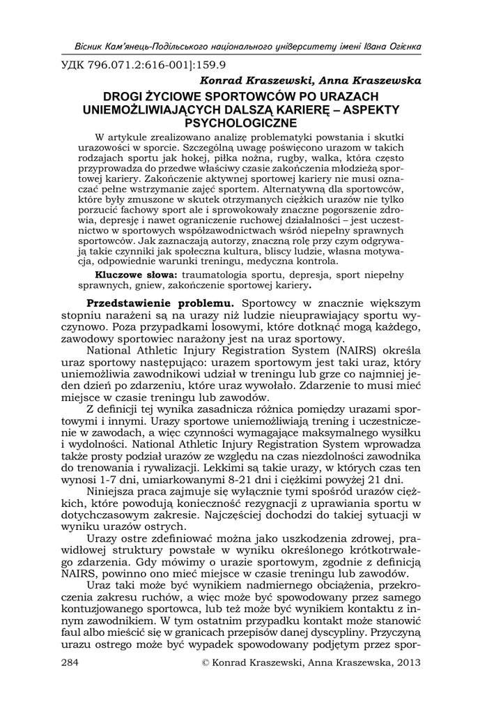 bS“…,* j=м’ …ець-o%дSль“ь*%г% …=цS%…=ль…%г% 3…S"е!“,2е23 Sме…S P"=…= nгSG…*= УДК 796.071.2:616-001]:159.9 Konrad Kraszewski, Anna Kraszewska DROGI ŻYCIOWE SPORTOWCÓW PO URAZACH UNIEMOŻLIWIAJĄCYCH DALSZĄ KARIERĘ – ASPEKTY PSYCHOLOGICZNE W artykule zrealizowano analizę problematyki powstania i skutki urazowości w sporcie. Szczególną uwagę poświęcono urazom w takich rodzajach sportu jak hokej, piłka nożna, rugby, walka, która często przyprowadza do przedwe właściwy czasie zakończenia młodzieżą sportowej kariery. Zakończenie aktywnej sportowej kariery nie musi oznaczać pełne wstrzymanie zajęć sportem. Alternatywną dla sportowców, które były zmuszone w skutek otrzymanych ciężkich urazów nie tylko porzucić fachowy sport ale i sprowokowały znaczne pogorszenie zdrowia, depresję i nawet ograniczenie ruchowej działalności – jest uczestnictwo w sportowych współzawodnictwach wśród niepełny sprawnych sportowców. Jak zaznaczają autorzy, znaczną rolę przy czym odgrywają takie czynniki jak społeczna kultura, bliscy ludzie, własna motywacja, odpowiednie warunki treningu, medyczna kontrola. Kluczowe słowa: traumatologia sportu, depresja, sport niepełny sprawnych, gniew, zakończenie sportowej kariery. Przedstawienie problemu. Sportowcy w znacznie większym stopniu narażeni są na urazy niż ludzie nieuprawiający sportu wyczynowo. Poza przypadkami losowymi, które dotknąć mogą każdego, zawodowy sportowiec narażony jest na uraz sportowy. National Athletic Injury Registration System (NAIRS) określa uraz sportowy następująco: urazem sportowym jest taki uraz, który uniemożliwia zawodnikowi udział w treningu lub grze co najmniej jeden dzień po zdarzeniu, które uraz wywołało. Zdarzenie to musi mieć miejsce w czasie treningu lub zawodów. Z definicji tej wynika zasadnicza różnica pomiędzy urazami sportowymi i innymi. Urazy sportowe uniemożliwiają trening i uczestniczenie w zawodach, a więc czynności wymagające maksymalnego wysiłku i wydolności. National Athletic Injury Registration System wprowadza także prosty podział urazów ze względu na czas niezdolności zawodnika do trenowania i rywalizacji. Lekkimi są takie urazy, w których czas ten wynosi 1-7 dni, umiarkowanymi 8-21 dni i ciężkimi powyżej 21 dni. Niniejsza praca zajmuje się wyłącznie tymi spośród urazów ciężkich, które powodują konieczność rezygnacji z uprawiania sportu w dotychczasowym zakresie. Najczęściej dochodzi do takiej sytuacji w wyniku urazów ostrych. Urazy ostre zdefiniować można jako uszkodzenia zdrowej, prawidłowej struktury powstałe w wyniku określonego krótkotrwałego zdarzenia. Gdy mówimy o urazie sportowym, zgodnie z definicją NAIRS, powinno ono mieć miejsce w czasie treningu lub zawodów. Uraz taki może być wynikiem nadmiernego obciążenia, przekroczenia zakresu ruchów, a więc może być spowodowany przez samego kontuzjowanego sportowca, lub też może być wynikiem kontaktu z innym zawodnikiem. W tym ostatnim przypadku kontakt może stanowić faul albo mieścić się w granicach przepisów danej dyscypliny. Przyczyną urazu ostrego może być wypadek spowodowany podjętym przez spor284 © Konrad Kraszewski, Anna Kraszewska, 2013 tSƒ,ч…е ",.%"=…… , “C%!2 S ƒд%!%"’ люд,…,. $ b,C3“* 6 towca nadmiernym ryzykiem. Takim ryzykiem może być przekraczanie szybkości w sportach samochodowych lub motorowodnych. Na urazy ostre najbardziej narażeni są zawodnicy uprawiający takie dyscypliny jak: • gry zespołowe szczególnie piłkę nożną, koszykówkę, hokej na lodzie lub rugby; • wyścigi samochodowe lub motorowodne; • jeździectwo; • narciarstwo; • sporty walki. Częstość występowania ostrych urazów jest kilkakrotnie większa w czasie zawodów w porównaniu do treningu. Charakterystycznym zjawiskiem jest, iż wzrasta wraz z rangą zawodów. Ostre urazy mogą mieć różny stopień nasilenia. Najcięższymi i mającymi najpoważniejsze rokowania medyczne są urazy głowy i kręgosłupa. Jednakże nawet nie mający poważnych skutków medycznych uraz narządów ruchu, może całkowicie lub częściowo wykluczyć sportowca z dalszego udziału w treningach i zawodach. Należy pamiętać, iż najczęstszymi urazami ostrymi w sporcie są urazy kończyn, a wśród nich urazy stawu kolanowego. Można przyjąć, iż istnieje kilka przyczyn takiego stanu: wszystkie sporty wymagają wysokiej sprawności, a więc i obciążenia kończyn dolnych skomplikowana budowa stawu kolanowego predestynuje go do urazów. Wycofanie się ze sportu na skutek urazu, nawet jeśli nie oznacza zrezygnowania z niego na stałe, wiąże się z doświadczaniem zwykle depresji lub gniewu. Reakcje te typowe są dla przeżywania poczucia straty. Tym bardziej dotyczy to sytuacji, gdy powrót staje sie niemożliwy. W wypadku odejścia od sportu, strata dotyczy własnej kondycji fizycznej, potencjalnej realizacji oczekiwań i celów. Doznawany w tym wypadku gniew łączy się z niezgodą na rzeczywistość, buntem przeciw zastanej sytuacji. Jest naturalną reakcją na doświadczaną szkodę, jednak jeśli utrzymuje się dłużej, utrudnia pogodzenie się z tym, co się stało i poradzenie sobie w nowych warunkach. Stan depresji wiąże się i z gniewem skierowanym na siebie i z bezradnością, wyczerpaniem możliwości działania i wpływania na rzeczywistość. Charakteryzuje się znacznym obniżeniem nastroju oraz niezdolnością do aktywności; depresję nazywa się nieraz „chorobą woli”. Sposób, w jaki osoba zareaguje na trudną sytuację zależny jest od jej charakterystyki osobowościowej, zaplecza społecznego, wsparcia bliskich oraz kontekstu sytuacyjnego. Podobnie złożone są przyczyny uruchomienia określonego stylu radzenia sobie z sytuacją. Badania pokazują tu dalsze zróżnicowanie zależne od np. płci i rodzaju uprawianego sportu. Kobiety, w opozycji do m