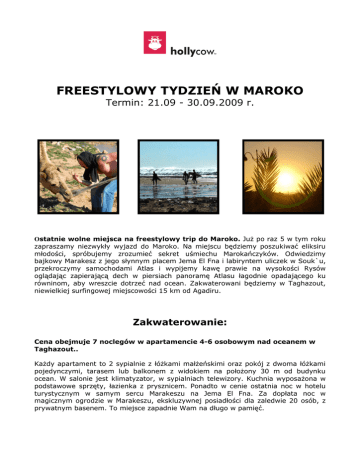 FREESTYLOWY TYDZIEŃ W MAROKO Termin: 21.09 - 30.09.2009 r. Ostatnie wolne miejsca na freestylowy trip do Maroko. Już po raz 5 w tym roku zapraszamy niezwykły wyjazd do Maroko. Na miejscu będziemy poszukiwać eliksiru młodości, spróbujemy zrozumieć sekret uśmiechu Marokańczyków. Odwiedzimy bajkowy Marakesz z jego słynnym placem Jema El Fna i labiryntem uliczek w Souk`u, przekroczymy samochodami Atlas i wypijemy kawę prawie na wysokości Rysów oglądając zapierającą dech w piersiach panoramę Atlasu łagodnie opadającego ku równinom, aby wreszcie dotrzeć nad ocean. Zakwaterowani będziemy w Taghazout, niewielkiej surfingowej miejscowości 15 km od Agadiru. Zakwaterowanie: Cena obejmuje 7 noclegów w apartamencie 4-6 osobowym nad oceanem w Taghazout.. Każdy apartament to 2 sypialnie z łóżkami małżeńskimi oraz pokój z dwoma łóżkami pojedynczymi, tarasem lub balkonem z widokiem na położony 30 m od budynku ocean. W salonie jest klimatyzator, w sypialniach telewizory. Kuchnia wyposażona w podstawowe sprzęty, łazienka z prysznicem. Ponadto w cenie ostatnia noc w hotelu turystycznym w samym sercu Marakeszu na Jema El Fna. Za dopłata noc w magicznym ogrodzie w Marakeszu, ekskluzywnej posiadłości dla zaledwie 20 osób, z prywatnym basenem. To miejsce zapadnie Wam na długo w pamięć. W trakcie eskapad samochodami zwiedzimy wybrzeże od Essaouir`y dawnej portugalskiej kolonii pirackiej, aż po Tifnit z sprawiającym nieziemskie wrażenie miastem wykutym w klifie nad samym oceanem. Plaże w Tifnit ‘grały’ m.in. w Powrocie na planetę małp. W tej małej rybackiej wiosce zjemy rybę prosto z oceanu usmażoną na naszych oczach przez lokalnego rybaka. Odwiedzimy Agadir, miasto niewiele mające wspólnego z wyobrażeniem o arabskich miastach, zobaczymy największą flotę sardynkową na świecie i wieczorną panoramę Agadiru ze szczytu góry leżącej obok miasta. Podczas jednej z wycieczek trafimy do Rajskiej doliny prowadzącej do malowniczego wodospadu z wodą o temperaturze zaledwie kilku stopni, która da trochę chłodu w zapewne upalny dzień. Będzie też okazja do spróbowania swoich sił w sportach wodnych: surfing, skimboard czy jetski. Surfing: Taghazout to słynąca z doskonałych fal i plaż surferska mieścinka. W odległości od 100m do kilku kilometrów od naszego apartamentu zlokalizowanych jest kilkanaście świetnych spotów surferskich o różnym stopni trudności. We współpracy z naszym lokalnym partnerem załogą Surf Berbere zorganizujemy szkolenie surfingowe z wynajmem sprzętu i zajęciami w języku angielskim (program surfingowy za dopłatą 85 Euro za dwudniowe szkolenie, 2 x 4 godziny). W cenie wypożyczenie Wet Suit, deska, instruktor, transport na spoty. Wyżywienie: Śniadania podawane w położonej 50m od apartament owca restauracji. Typowe marokańskie śniadanie obejmuje: Świeżo wyciskany sok z pomarańczy, kawa lub herbata, omlet lub jajecznica, dżemy, miód, pieczywo, masło. Transport: Na lotnisku w Marakeszu czekają na nas wynajęte samochody, którymi będziemy poruszać się przez cały pobyt. Roczne Dacie Logan Sedan, to komfortowy środek transportu dla 4 osób. Samochody prowadzą uczestnicy. W cenie limit 1000 km na auto. Grupa maksymalnie 20 osobowa – 5 samochodów. Pozostało 6 miejsc. Ceny: Do 10.07.2009 – cena w wysokości: 1949 zł Do 15.07.2009 – cena w wysokości: 2199 zł Cena obejmuje: Zakwaterowanie 7 nocy w apartamencie 4-6 osobowym w Taghazout Zakwaterowanie w hotelu turystycznym przy Jema El Fna na ostatnią noc w Marakeszu (bez śniadania) - Wyżywienie: śniadania x 7 dni Wynajem samochodów Dacia Logan (4 osobowych) na 8 dni Paliwo na 1000 km/auto Opiekę koordynatora Przelot Katowice - Marakesz - Katowice, przez jeden z portów europejskich. Bagaż maksymalnie 10 kg, zgodny z wymiarami Ryanair i Wizzair. Program obejmujący: Marakesz, Asni, Atlas Wysoki, Agadir, Taghazout, Tamaragh, Ourir, Tifnit, Inzegane, Taroudant, Essaouira, ale jak zwykle w przypadku naszych wyjazdów spontanicznie możemy zmienić program na Wasze życzenie..w końcu jesteśmy w Maroko, najbardziej freestylowym kraju świata.. Cena nie obejmuje: - Obowiązkowego ubezpieczenia - Zwyczajowych napiwków - Posiłków za wyjątkiem śniadań - Biletów wstępu do obiektów nie wymienionych w programie. - Szkolenia surfingowego - Dopłaty do bagażu odprawianego (limit 15kg) dopłata: 120 zł/szt. - Dopłaty do zakwaterowania w luksusowym Riadzie w Marakeszu na ostatnią noc ze śniadaniem (dopłata: 45 Euro/os.) - Transportu do i z Katowic, istnieje możliwość zapewnienia transferów za dopłatą 120zł/os. w obie strony. Info: [email protected] lub Tel.: +48.696.473.825
