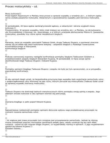 Płońszczak - Gazeta lokalna - Płońsk, Raciąż, Baboszewo, Czerwińsk, Dzierzążnia, Joniec, Naruszewo Proces motocyklisty - cd. Mowy końcowe Przed Sądem Rejonowym w Płońsku trwa proces w sprawie wypadku z września ub.r., w którym ciężko ranna została pasażerka motocykla. Oskarżonym o spowodowanie wypadku jest kierowca motocykla. W poniedziałek, 20 lipca sędzia zamknął przewód sądowy, a oskarżyciel i obrona wygłosili mowy końcowe. Przypomnijmy. W sprawie wypadku, który miał miejsce we wrześniu ub.r. w Płońsku, na skrzyżowaniu ulic Grunwaldzkiej z Klonową i ks. Jaworskiego, a w którym ucierpiała płońszczanka Milena G. (pasażerka motocykla), powstały trzy różne opinie niezależnych biegłych. Pierwszą, zaraz po wypadku sporządził Tadeusz Golat, drugą Tadeusz Diupero, a ponieważ znacznie różniły się od siebie sąd zlecił wykonanie kolejnej - zespołowi biegłych z Polskiego Towarzystwa Kryminalistycznego w Warszawie. Konfrontacja biegłych Podczas czerwcowej rozprawy nastąpiła konfrontacja pomiędzy biegłymi Tadeuszem Golatem a przedstawicielem zespołu biegłych Edwardem Kujawą. W poniedziałek 13 lipca swoje opinie skonfrontowali biegli Tadeusz Diupero i Edward Kujawa. Pomiędzy opiniami biegłego Tadeusza Diupero i zespołu nie było już tylu sprzeczności, co w przypadku poprzedniej konfrontacji. W obu opiniach biegli uznali, że bezpośrednią przyczyną tego wypadku było wyjechanie samochodu volvo z podporządkowanej ulicy Klonowej na pas ruchu, którym poruszał się motocyklista (Tadeusz Golat uznał za sprawcę wypadku kierowcę motocykla). Tadeusz Diupero nie dostrzegł żadnych merytorycznych różnic pomiędzy swoją opinią a zespołu. Jego zdaniem wnioski końcowe w obu opiniach również się pokrywają. Zeznania biegłego w pełni poparł Edward Kujawa. Najważniejsza rozbieżność pomiędzy opiniami dotyczyła wpływu wagi przeładowanej przyczepki na moment ruszenia samochodu volvo. - Im większa jest masa przyczepki tym mniejsze jest przyspieszenie samochodu. Jednak tę różnicę można zniwelować poprzez mocniejsze naciśnięcie pedału gazu, wtedy uzyskuje się ten sam efekt ruszenia - mówił na sali rozpraw biegły Diupero, co wyjaśniałoby różnicę w opiniach. Z jego wyjaśnieniem zgodził się Edward Kujawa. Świadek kobieta... http://www.plonszczak.pl Kreator PDF Utworzono 2 March, 2017, 11:46 Płońszczak - Gazeta lokalna - Płońsk, Raciąż, Baboszewo, Czerwińsk, Dzierzążnia, Joniec, Naruszewo Biegli ustosunkowali się także do zeznań bezpośredniego świadka wypadku, Elżbiety S., która złożyła zeznania w poniedziałek. Kobieta, która wraz z mężem jechała wówczas samochodem za motocyklistą zeznała, że po prawej stronie ulicy Grunwaldzkiej (w kierunku na Mławę) samochody zaparkowane były jedynie przy supermarkecie. Świadek zeznała również, że jadący przed nimi motocyklista nie hamował. Biegły Diupero ustosunkowując się do zeznań dotyczących zaparkowanych samochodów powiedział, że w takiej sytuacji oskarżony motocyklista (Radosław O.) miał większe szanse na zauważenie w porę wyjeżdżającego samochodu. Gdyby natomiast kierowca volvo wysunął przód samochodu z ulicy Klonowej także mógłby zobaczyć nadjeżdżający motocykl. Co do hamowania biegli ocenili, że reakcja motocyklisty świadczyłaby o tym, że nie zachował on należytej ostrożności, mimo to bezpośrednią przyczyną wypadku nadal pozostaje wyjechanie kierowcy samochodu. W związku z zeznaniami świadka Elżbiety S., która w dniu wypadku jechała samochodem z mężem i wraz z nim jako pierwsza wezwała pomoc, sąd postanowił przesłuchać również jej męża Andrzeja S. ... i jej mąż Podczas poniedziałkowej (20 lipca) rozprawy, zeznania przed sądem składał świadek wypadku, Andrzej S. Zeznał on, że oskarżony Radosław O. jechał motocyklem zbyt szybko (ponad 100 km/h), a w momencie uderzenia w przyczepkę nie wykonał żadnego manewru. Świadek nie widział natomiast, czy motocyklista hamował przed uderzeniem. Co do kwestii zaparkowanych przy supermarkecie na ulicy Grunwaldzkiej samochodów, Andrzej S. zeznał, że stały one w obrębie długości sklepu. Mowy końcowe Sędzia Radosław Jarosiński zamknął przewód sądowy i wysłuchał mów końcowych. Prokuratura wnioskowała dla oskarżonego Radosława O. o karę 2 lat pozbawienia wolności w zawieszeniu na 4 lata za spowodowanie wypadku, w którym inna niż oskarżony osoba poniosła ciężki uszczerbek na zdrowiu. Za kierowanie motocyklem bez uprawnień oraz niezadbanie o bezpieczeństwo pasażerki, która jechała bez kasku, prokurator zażądała odebrania motocykliście uprawnień kierowania pojazdami na okres 4 lat i karę grzywny. Zdaniem prokurator, wina leży po stronie motocyklisty dlatego, że poruszał się on z nadmierną prędkością, że miał możliwość uniknięcia zderzenia z przyczepką, ale niewątpliwie jego reakcja na wyjechanie samochodu volvo była niezrozumiała. Odmienne stanowisko wyraził oskarżyciel posiłkowy, czyli ojciec poszkodowanej wskutek wypadku Mileny G. - Ten człowiek wiózł moją córkę - to prawda. Do swojej winy się przyznał. Nie wiem natomiast, czemu na ławie oskarżonych nie siedzi kierowca samochodu volvo, chciałbym, żeby on również odpowiedział za swój czyn - mówił Kazimierz G. Obrońca natomiast przyznał, że oskarżony nie zachował należytej ostrożności, że ponosi winę za kierowanie bez uprawnień i niezapewnienie bezpieczeństwa pasażerce, mimo to, w jego przekonaniu, winę za bezpośrednie spowodowanie wypadku ponosi kierowca volvo Grzegorz R., który podczas pierwszej rozprawy w tej sprawie zeznawał w charakterze świadka. Ponadto obrońca zaznaczył, że zeznania ostatniego świadka, Andrzeja S. nie wniosły do sprawy nic nowego. http://www.plonszczak.pl Kreator PDF Utworzono 2 March, 2017, 11:46 Płońszczak - Gazeta lokalna - Płońsk, Raciąż, B