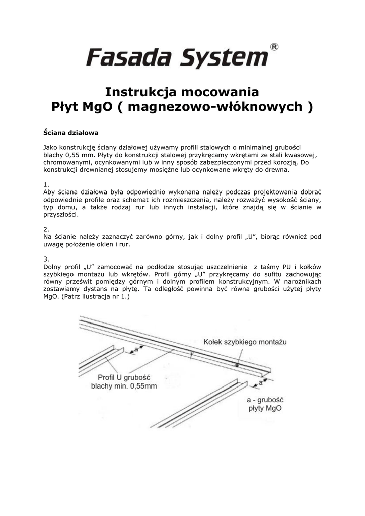 Instrukcja mocowania Płyt MgO ( magnezowo-włóknowych ) Ściana działowa Jako konstrukcję ściany działowej używamy profili stalowych o minimalnej grubości blachy 0,55 mm. Płyty do konstrukcji stalowej przykręcamy wkrętami ze stali kwasowej, chromowanymi, ocynkowanymi lub w inny sposób zabezpieczonymi przed korozją. Do konstrukcji drewnianej stosujemy mosiężne lub ocynkowane wkręty do drewna. 1. Aby ściana działowa była odpowiednio wykonana należy podczas projektowania dobrać odpowiednie profile oraz schemat ich rozmieszczenia, należy rozważyć wysokość ściany, typ domu, a także rodzaj rur lub innych instalacji, które znajdą się w ścianie w przyszłości. 2. Na ścianie należy zaznaczyć zarówno górny, jak i dolny profil „U”, biorąc również pod uwagę położenie okien i rur. 3. Dolny profil „U” zamocować na podłodze stosując uszczelnienie z taśmy PU i kołków szybkiego montażu lub wkrętów. Profil górny „U” przykręcamy do sufitu zachowując równy prześwit pomiędzy górnym i dolnym profilem konstrukcyjnym. W narożnikach zostawiamy dystans na płytę. Ta odległość powinna być równa grubości użytej płyty MgO. (Patrz ilustracja nr 1.) 4. Pionowe profile „C” należy zamocować pomiędzy górnymi i dolnymi profilami „U”; wewnętrzny odstęp pomiędzy pionowymi profilami powinien wynosić 400 lub 600mm. 5. Płyty zamocować na profilach z użyciem blachowkrętów ze stali kwasowej, ocynkowanymi lub innymi zabezpieczonymi trwale przed korozją polecane wkręty WSDSK o długości 32 mm i średnicy 4,8 mm, rozpoczynając przykręcanie płyty od środka ku jej krawędzi. 6. Odległości między wkrętami nie powinny przekraczać 305 mm (najlepiej co 250 mm) . Wkręty mocować 15 mm od krawędzi i nie mniej niż 50 mm od narożnika płyty. Wkręty należy wkręcać w taki sposób, aby ich łby zagłębione były około 0,5 mm pod powierzchnią płyty MgO 7. Pomiędzy płytami należy zachować odstęp 3 - 5 mm, który wypełnić należy klejem poliuretanowym jednoskładnikowym np. Purocol Express. Po wyschnięciu kleju i usunięciu nadmiaru spoinę wyrównać masą szpachlową w zależności od potrzeb wewnętrzną lub zewnętrzną SUFIT PODWIESZANY Przed rozpoczęciem projektowania należy przemyśleć charakterystykę materiałów, a także wziąć pod uwagę otwory, jakie będą wykonywane w celu zamocowania oświetlenia, i tym podobne. 1. Przed rozpoczęciem mocowania oznaczyć profile pomocnicze. 2. Użyć wieszaków lub innych, zbliżonych elementów, by zamocować profile podstawowe do sufitu. Zachować odstępy 122 cm pomiędzy profilami podstawowymi. Wkręt jest wykorzystywany do dokładnej regulacji profili podstawowych i utrzymywania ich w poziomie. 3. Profile pomocnicze należy zamocować pionowo na profilach podstawowych. Pomiędzy profilami pomocniczymi należy zachować odstępy 40 cm. 4. Płyty należy zamocować pionowo na profilach pomocniczych. A. Płyty zamocować na profilach z użyciem blachowkrętów ze stali kwasowej, ocynkowanymi lub innymi zabezpieczonymi trwale przed korozją polecane wkręty WSDSK o długości 32 mm i średnicy 4,8 mm, B. Płyty należy mocować od środka ku krawędzi; zachować odstępy pomiędzy wkrętami wynoszące 10 - 20 cm. C. Wkręty mocować 15 mm od krawędzi i nie mniej niż 50 mm od narożnika płyty. D. Pomiędzy płytami należy zachować odstęp 3 - 5 mm. E. Wkręty należy wkręcać w taki sposób, aby ich łby zagłębione były około 0,5 mm pod powierzchnią płyty MgO. OBRÓBKA MATERIAŁÓW 1. Płytę przygotować używając noża i miarki lub przecinarki. 2. Do obróbki użyć urządzenia tnącego (zastosować ostrze o większej sztywności). 3. Nawiercane otwory: wykonać niewielkie otwory wokół planowanych większych otworów, a wtedy te drugie utworzą się w naturalny sposób. Większe otwory można również wykonać wiertłem. 4. Uwaga: Otwory należy nawiercać z wyczuciem, ponieważ płyty łatwo zniszczyć. SPOSÓB ŁĄCZENIA MATERIAŁÓW A. Połączenia wypełnić rozciągliwą masą szpachlową i wygładzić ją. Następnie, po jej wyschnięciu, użyć papieru ściernego o ziarnistości 150 lub większej do przeszlifowania. B. 1. Użyć standardowej masy szpachlowej do wypełnienia odstępów pomiędzy płytami i wygładzić ją lub wysuszyć. 2. Powyższe działania wykonać jeszcze dwukrotnie, jednocześnie wygładzając masę szpachlową i przyklejając do niej siatkę z włókna szklanego i docinając, przykleić papierową taśmę do spoinowania i wygładzić szpachlą. 3. Po wyschnięciu spojenia, od zewnętrznej strony ponownie nałożyć na nie masę szpachlową, wyrównać brzeg, użyć papieru ściernego o ziarnistości 150 lub większej, by po wyschnięciu przeszlifować (grubość materiałów przyklejonych na spojeniu nie może przekraczać 1,5 mm nad powierzchnią płyty). SPOSOBY POSTĘPOWANIA Z POWIERZCHNIĄ PŁYT 1. Po zakończeniu prac związanych ze spojeniem, usunąć pył i wysuszyć płytę. 2. Gruntować ogólnie stosowanymi gruntami pod farby 3. Malować można każdym rodzajem farb w zależności od miejsca zamontowania wewnętrznymi lub zewnętrznymi