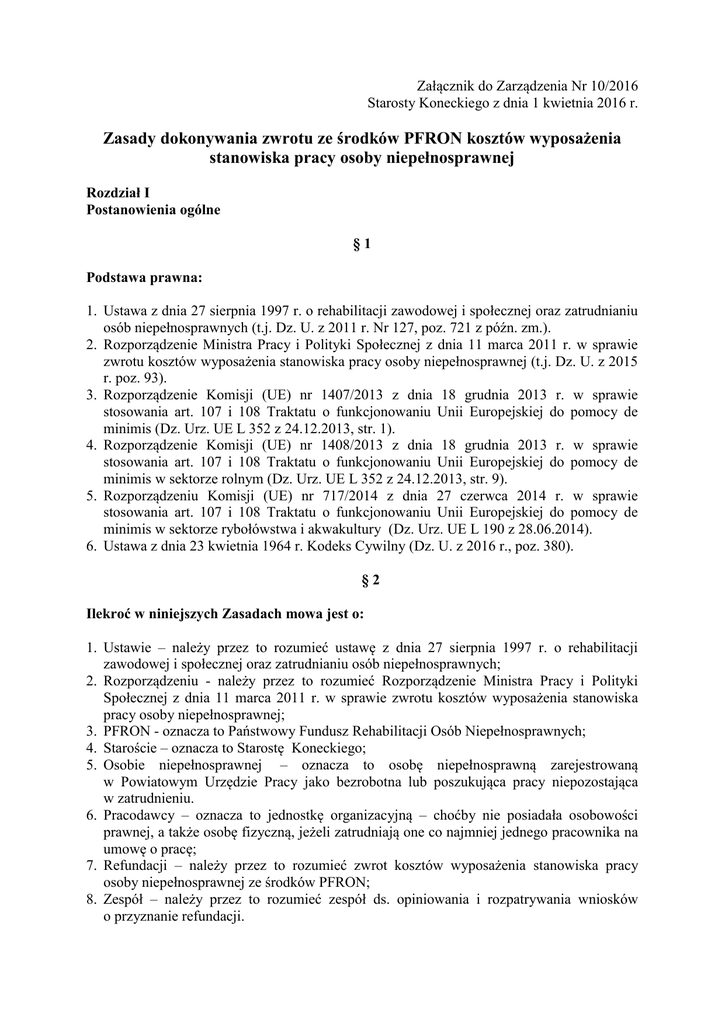 Załącznik do Zarządzenia Nr 10/2016 Starosty Koneckiego z dnia 1 kwietnia 2016 r. Zasady dokonywania zwrotu ze środków PFRON kosztów wyposażenia stanowiska pracy osoby niepełnosprawnej Rozdział I Postanowienia ogólne §1 Podstawa prawna: 1. Ustawa z dnia 27 sierpnia 1997 r. o rehabilitacji zawodowej i społecznej oraz zatrudnianiu osób niepełnosprawnych (t.j. Dz. U. z 2011 r. Nr 127, poz. 721 z późn. zm.). 2. Rozporządzenie Ministra Pracy i Polityki Społecznej z dnia 11 marca 2011 r. w sprawie zwrotu kosztów wyposażenia stanowiska pracy osoby niepełnosprawnej (t.j. Dz. U. z 2015 r. poz. 93). 3. Rozporządzenie Komisji (UE) nr 1407/2013 z dnia 18 grudnia 2013 r. w sprawie stosowania art. 107 i 108 Traktatu o funkcjonowaniu Unii Europejskiej do pomocy de minimis (Dz. Urz. UE L 352 z 24.12.2013, str. 1). 4. Rozporządzenie Komisji (UE) nr 1408/2013 z dnia 18 grudnia 2013 r. w sprawie stosowania art. 107 i 108 Traktatu o funkcjonowaniu Unii Europejskiej do pomocy de minimis w sektorze rolnym (Dz. Urz. UE L 352 z 24.12.2013, str. 9). 5. Rozporządzeniu Komisji (UE) nr 717/2014 z dnia 27 czerwca 2014 r. w sprawie stosowania art. 107 i 108 Traktatu o funkcjonowaniu Unii Europejskiej do pomocy de minimis w sektorze rybołówstwa i akwakultury (Dz. Urz. UE L 190 z 28.06.2014). 6. Ustawa z dnia 23 kwietnia 1964 r. Kodeks Cywilny (Dz. U. z 2016 r., poz. 380). §2 Ilekroć w niniejszych Zasadach mowa jest o: 1. Ustawie – należy przez to rozumieć ustawę z dnia 27 sierpnia 1997 r. o rehabilitacji zawodowej i społecznej oraz zatrudnianiu osób niepełnosprawnych; 2. Rozporządzeniu - należy przez to rozumieć Rozporządzenie Ministra Pracy i Polityki Społecznej z dnia 11 marca 2011 r. w sprawie zwrotu kosztów wyposażenia stanowiska pracy osoby niepełnosprawnej; 3. PFRON - oznacza to Państwowy Fundusz Rehabilitacji Osób Niepełnosprawnych; 4. Staroście – oznacza to Starostę Koneckiego; 5. Osobie niepełnosprawnej – oznacza to osobę niepełnosprawną zarejestrowaną w Powiatowym Urzędzie Pracy jako bezrobotna lub poszukująca pracy niepozostająca w zatrudnieniu. 6. Pracodawcy – oznacza to jednostkę organizacyjną – choćby nie posiadała osobowości prawnej, a także osobę fizyczną, jeżeli zatrudniają one co najmniej jednego pracownika na umowę o pracę; 7. Refundacji – należy przez to rozumieć zwrot kosztów wyposażenia stanowiska pracy osoby niepełnosprawnej ze środków PFRON; 8. Zespół – należy przez to rozumieć zespół ds. opiniowania i rozpatrywania wniosków o przyznanie refundacji. §3 1. Zwrot kosztów wyposażenia stanowiska pracy osoby niepełnosprawnej może zostać przyznany pracodawcy jeżeli: a) zobowiązał się do zatrudnienia przez okres, co najmniej 36 miesięcy osoby niepełnosprawnej zarejestrowanej w PUP Końskie, jako bezrobotna, albo poszukująca pracy niepozostająca w zatrudnieniu; b) złożył wniosek o przyznanie refundacji. 2. Refundacja może być dokonywana w wysokości określonej w umowie, nie wyższej jednak niż piętnastokrotnej wysokości przeciętnego wynagrodzenia. 3. Wysokość przeciętnego wynagrodzenia, o którym mowa w ust. 2. Przyjmowana jest na dzień podpisania umowy. §4 Refundacja nie może być przyznana pracodawcy, jeżeli: 1) prowadził działalność przez okres krótszy niż 12 miesięcy przed dniem złożenia wniosku o refundację; 2) posiada zaległości w zobowiązaniach wobec PFRON, ZUS, US, FP i FGŚP; 3) znajduje się w trudnej sytuacji ekonomicznej według kryteriów określonych w przepisach prawa Unii Europejskiej dotyczących udzielania pomocy publicznej, zgodnie z kryteriami określonymi w pkt. 9 i 10 Wytycznych wspólnotowych dotyczących pomocy państwa w celu ratowania i restrukturyzacji zagrożonych przedsiębiorstw (Dz. Urz. UE C 224 z 01.10.2004, str. 2.); 4) toczy się w stosunku do składającego postępowanie upadłościowe i nie został zgłoszony wniosek o likwidację; 5) był karany w okresie 2 lat przed dniem złożenia wniosku za przestępstwa przeciwko obrotowi gospodarczemu w rozumieniu ustawy z dnia 06 czerwca 1997 r. – Kodeks karny (Dz. U. 1997, Nr 88, poz. 553, z późn. zm); 6) w rejestrze bezrobotnych lub poszukujących pracy PUP Końskie nie figurują osoby niepełnosprawne o kwalifikacjach wymaganych do pracy na stanowisku, którego dotyczy wniosek. §5 Refundacja obejmuje: 1) udokumentowane koszty zakupu lub wytworzenia wyposażenia stanowiska pracy, na którym będzie wykonywać pracę osoba niepełnosprawna; 2) Kwotę niepodlegającego odliczeniu podatku od towarów i usług oraz podatku akcyzowego, związanych z przedmiotami opodatkowania określonymi w pkt 1. §6 1. Refundacji podlegają koszty poniesione w związku z wyposażeniem stanowiska pracy osoby niepełnosprawnej w szczególności przeznaczone na zakup środków trwałych, urządzeń, maszyn, narzędzi, oprogramowania związanych bezpośrednio i jednoznacznie z tworzonym stanowiskiem pracy z uwzględnieniem jego specyfiki. 2. Refundacji nie będą podlegać koszty wyposażenia stanowiska pracy poniesione w szczególności na: a) b) c) d) e) f) g) h) i) j) k) l) nabycie udziałów w spółkach; wydatki inwestycyjne obejmujące koszty budowy, remontów lokali oraz budynków; zakup nieruchomości, straganów, garaży blaszanych, namiotów; zakup towaru, surowców i materiałów oraz zapasowych materiałów eksploatacyjnych; koszty rat leasingowych; remont, modernizację maszyn i urządzeń; opłaty administracyjno – skarbowe, sądowe, podatki, koncesje, bieżące koszty utrzymania lokalu; koszty wynagrodzeń i składki na ubezpieczenia społeczne; finansowanie szkoleń; koszty reklamy i promocji firmy; pokrycie kosztów przesyłki, transportu zakupionych rzeczy; utworzenia stanowiska pracy w salonach gier hazardowych. 3. Niedopuszczalne jest zlecanie wykonywania usług oraz nabycie jakiegokolwiek asortymentu w ramach przyznanych środków od krewnych w linii prostej lub bocznej, powinowatyc