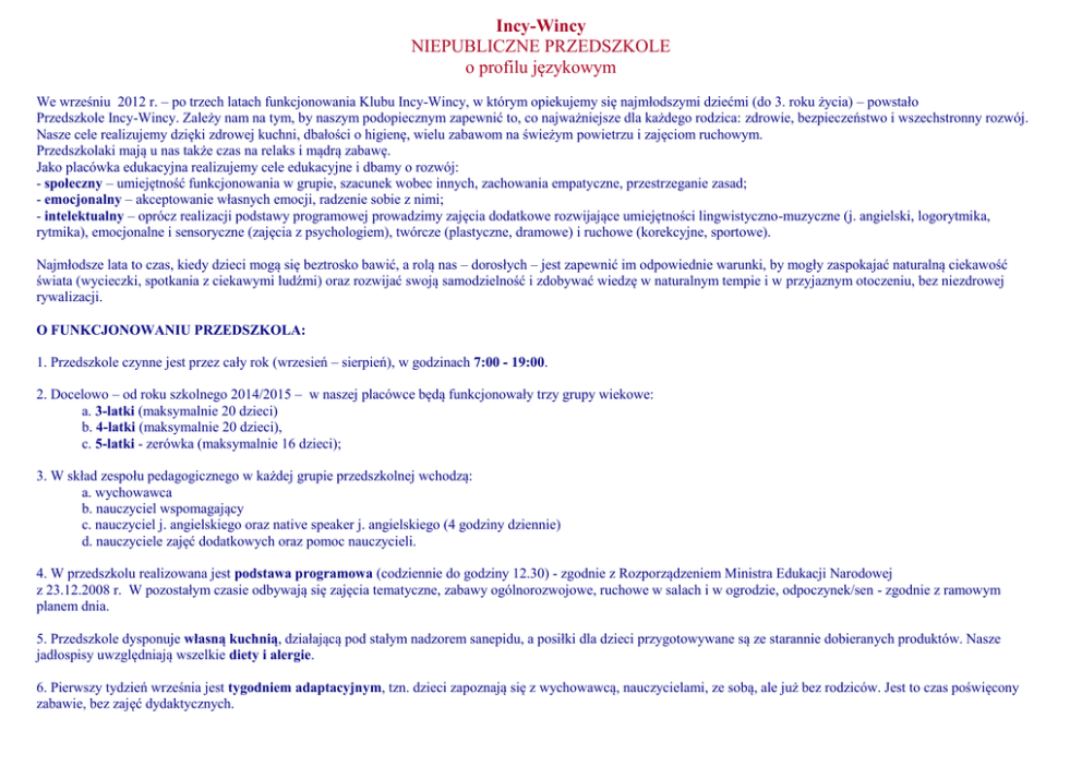 Incy-Wincy NIEPUBLICZNE PRZEDSZKOLE o profilu językowym We wrześniu 2012 r. – po trzech latach funkcjonowania Klubu Incy-Wincy, w którym opiekujemy się najmłodszymi dziećmi (do 3. roku życia) – powstało Przedszkole Incy-Wincy. Zależy nam na tym, by naszym podopiecznym zapewnić to, co najważniejsze dla każdego rodzica: zdrowie, bezpieczeństwo i wszechstronny rozwój. Nasze cele realizujemy dzięki zdrowej kuchni, dbałości o higienę, wielu zabawom na świeżym powietrzu i zajęciom ruchowym. Przedszkolaki mają u nas także czas na relaks i mądrą zabawę. Jako placówka edukacyjna realizujemy cele edukacyjne i dbamy o rozwój: - społeczny – umiejętność funkcjonowania w grupie, szacunek wobec innych, zachowania empatyczne, przestrzeganie zasad; - emocjonalny – akceptowanie własnych emocji, radzenie sobie z nimi; - intelektualny – oprócz realizacji podstawy programowej prowadzimy zajęcia dodatkowe rozwijające umiejętności lingwistyczno-muzyczne (j. angielski, logorytmika, rytmika), emocjonalne i sensoryczne (zajęcia z psychologiem), twórcze (plastyczne, dramowe) i ruchowe (korekcyjne, sportowe). Najmłodsze lata to czas, kiedy dzieci mogą się beztrosko bawić, a rolą nas – dorosłych – jest zapewnić im odpowiednie warunki, by mogły zaspokajać naturalną ciekawość świata (wycieczki, spotkania z ciekawymi ludźmi) oraz rozwijać swoją samodzielność i zdobywać wiedzę w naturalnym tempie i w przyjaznym otoczeniu, bez niezdrowej rywalizacji. O FUNKCJONOWANIU PRZEDSZKOLA: 1. Przedszkole czynne jest przez cały rok (wrzesień – sierpień), w godzinach 7:00 - 19:00. 2. Docelowo – od roku szkolnego 2014/2015 – w naszej placówce będą funkcjonowały trzy grupy wiekowe: a. 3-latki (maksymalnie 20 dzieci) b. 4-latki (maksymalnie 20 dzieci), c. 5-latki - zerówka (maksymalnie 16 dzieci); 3. W skład zespołu pedagogicznego w każdej grupie przedszkolnej wchodzą: a. wychowawca b. nauczyciel wspomagający c. nauczyciel j. angielskiego oraz native speaker j. angielskiego (4 godziny dziennie) d. nauczyciele zajęć dodatkowych oraz pomoc nauczycieli. 4. W przedszkolu realizowana jest podstawa programowa (codziennie do godziny 12.30) - zgodnie z Rozporządzeniem Ministra Edukacji Narodowej z 23.12.2008 r. W pozostałym czasie odbywają się zajęcia tematyczne, zabawy ogólnorozwojowe, ruchowe w salach i w ogrodzie, odpoczynek/sen - zgodnie z ramowym planem dnia. 5. Przedszkole dysponuje własną kuchnią, działającą pod stałym nadzorem sanepidu, a posiłki dla dzieci przygotowywane są ze starannie dobieranych produktów. Nasze jadłospisy uwzględniają wszelkie diety i alergie. 6. Pierwszy tydzień września jest tygodniem adaptacyjnym, tzn. dzieci zapoznają się z wychowawcą, nauczycielami, ze sobą, ale już bez rodziców. Jest to czas poświęcony zabawie, bez zajęć dydaktycznych. W roku szkolnym 2013/2014 prowadzimy nabór do grupy 3-latków i 4-latków. OPŁATY Opcja pobytu Pełny pobyt Comiesięczne czesne 1200 zł Jednorazowe wpisowe 900 zł Opłata posiłki za 7 zł w godzinach: x liczba dni 7.00 – 19.00 w miesiącu (odliczenia za nieobecności) Co obejmuje czesne Niepełny pobyt 1000 zł 700 zł 7 zł w godzinach: x liczba dni 7.00 – 15.00 w miesiącu (odliczenia za nieobecności) Niepełny pobyt 800 zł 500 zł 3 zł w godzinach: x liczba dni 7.00 – 13.00 w miesiącu (odliczenia za nieobecności) opieka, zajęcia, odpoczynek/sen, wyjście do ogrodu - w godzinach 7.00 – 19.00 6 posiłków dziennie – w tym zupa i drugie danie oddzielnie (wszystkie posiłki przygotowujemy we własnej kuchni ze starannie wybieranych, zdrowych produktów – uwzględniamy indywidualne diety) realizacja podstawy programowej – zajęcia dydaktyczne, w tym rytmika i gimnastyka korekcyjna imprezy okolicznościowe - teatrzyki, koncerty, warsztaty oraz wycieczki (przynajmniej raz w miesiącu) opieka logopedyczna – badania przesiewowe, konsultacje i diagnostyka opieka psychologiczna – obserwacje, konsultacje i diagnostyka codziennie zajęcia z lektorem języka angielskiego - program z podręcznikiem codziennie zajęcia ogólnorozwojowe z nauczycielem języka angielskiego – gry i zabawy ruchowomuzyczne codziennie zajęcia z native speakerem języka angielskiego codziennie zajęcia dodatkowe (taniec, zajęcia sportowe, warsztaty kulinarne, zajęcia twórcze i doświadczalne, logorytmika) opieka, zajęcia, odpoczynek/sen, wyjście do ogrodu - w godzinach 7.00 – 15.00 4 posiłki dziennie – w tym zupa i drugie danie oddzielnie (wszystkie posiłki przygotowujemy we własnej kuchni ze starannie wybieranych, zdrowych produktów – uwzględniamy indywidualne diety) realizacja podstawy programowej – zajęcia dydaktyczne, w tym rytmika i gimnastyka korekcyjna imprezy okolicznościowe - teatrzyki, koncerty, warsztaty oraz wycieczki (przynajmniej raz w miesiącu) opieka logopedyczna – badania przesiewowe, konsultacje i diagnostyka opieka psychologiczna – obserwacje, konsultacje i diagnostyka codziennie zajęcia z lektorem języka angielskiego - program z podręcznikiem codziennie zajęcia ogólnorozwojowe z nauczycielem języka angielskiego – gry i zabawy ruchowomuzyczne codziennie zajęcia z native speakerem języka angielskiego opieka, zajęcia, wyjście do ogrodu - w godzinach 7.00 – 13.00 3 posiłki dziennie – w tym zupa i drugie danie oddzielnie (wszystkie posiłki przygotowujemy we własnej kuchni ze starannie wybieranych, zdrowych produktów – uwzględniamy indywidualne diety) realizacja podstawy programowej – zajęcia dydaktyczne, w tym rytmika i gimnastyka korekcyjna imprezy okolicznościowe - teatrzyki, koncerty, warsztaty oraz wycieczki (przynajmniej raz w miesiącu) opieka logopedyczna – badania przesiewowe, konsultacje i diagnostyka opieka psychologiczna – obserwacje, konsultacje i diagnostyka codziennie zajęcia z lektorem języka angielskiego - program z podręcznikiem codziennie zajęcia ogólnorozwojowe z 