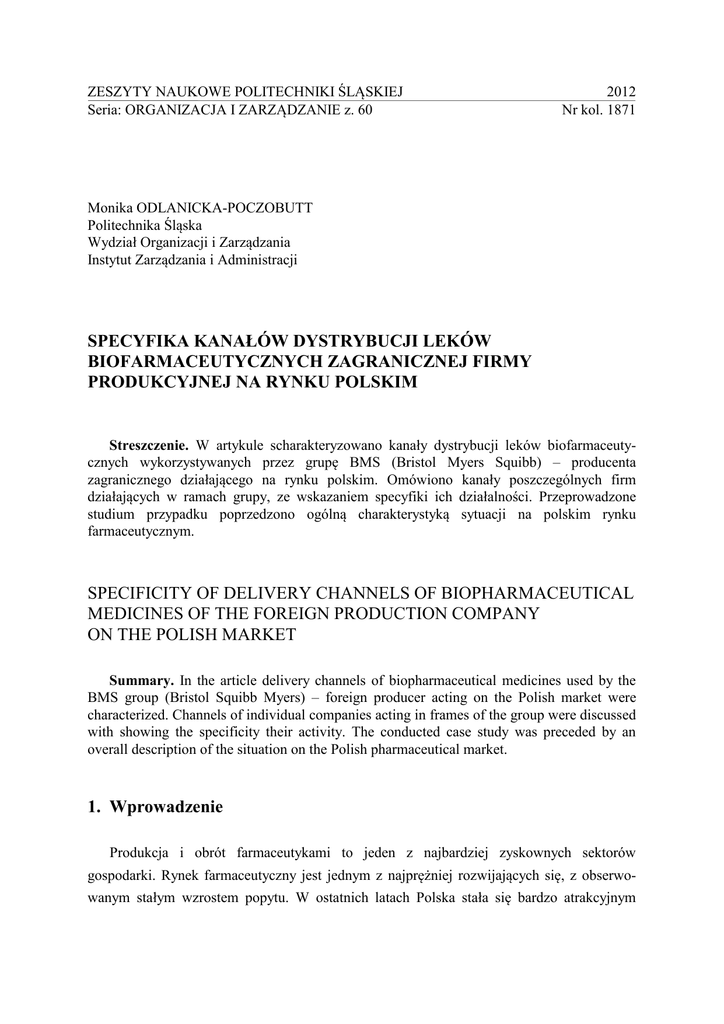 ZESZYTY NAUKOWE POLITECHNIKI ŚLĄSKIEJ Seria: ORGANIZACJA I ZARZĄDZANIE z. 60 2012 Nr kol. 1871 Monika ODLANICKA-POCZOBUTT Politechnika Śląska Wydział Organizacji i Zarządzania Instytut Zarządzania i Administracji SPECYFIKA KANAŁÓW DYSTRYBUCJI LEKÓW BIOFARMACEUTYCZNYCH ZAGRANICZNEJ FIRMY PRODUKCYJNEJ NA RYNKU POLSKIM Streszczenie. W artykule scharakteryzowano kanały dystrybucji leków biofarmaceutycznych wykorzystywanych przez grupę BMS (Bristol Myers Squibb) – producenta zagranicznego działającego na rynku polskim. Omówiono kanały poszczególnych firm działających w ramach grupy, ze wskazaniem specyfiki ich działalności. Przeprowadzone studium przypadku poprzedzono ogólną charakterystyką sytuacji na polskim rynku farmaceutycznym. SPECIFICITY OF DELIVERY CHANNELS OF BIOPHARMACEUTICAL MEDICINES OF THE FOREIGN PRODUCTION COMPANY ON THE POLISH MARKET Summary. In the article delivery channels of biopharmaceutical medicines used by the BMS group (Bristol Squibb Myers) – foreign producer acting on the Polish market were characterized. Channels of individual companies acting in frames of the group were discussed with showing the specificity their activity. The conducted case study was preceded by an overall description of the situation on the Polish pharmaceutical market. 1. Wprowadzenie Produkcja i obrót farmaceutykami to jeden z najbardziej zyskownych sektorów gospodarki. Rynek farmaceutyczny jest jednym z najprężniej rozwijających się, z obserwowanym stałym wzrostem popytu. W ostatnich latach Polska stała się bardzo atrakcyjnym 248 M. Odlanicka-Poczobutt rynkiem zbytu dla międzynarodowych koncernów farmaceutycznych, które prowadzą działalność gospodarczą przez zarejestrowane spółki prawa handlowego. Modelowanie kanałów dystrybucji oraz innych procesów logistycznych w przedsiębiorstwie ma duży wpływ na postrzeganie oferowanych produktów, a także uzyskiwanie dobrej pozycji na rynku. Coraz więcej firm dostrzega, że sprawny proces dystrybucji wyrobów przekłada się na sukces rynkowy firmy. Bez prawidłowo zorganizowanych kanałów dystrybucji sprzedaż oraz promocja niektórych wyrobów byłyby nieefektywne. Przedsiębiorstwo musi dbać o to, aby wszystkie procesy logistyczne były przeprowadzane sprawnie i szybko. Firmy dystrybuujące produkty dużą uwagę przykładają do tego, aby wszystkie wyroby zaspakajały oczekiwania i wymagania klientów. Realizacja szybkiej i efektywnej dystrybucji możliwa jest do osiągnięcia tylko i wyłącznie przy wykorzystaniu odpowiednich strategii i odpowiednich pośredników biorących udział w dostarczeniu klientowi wyrobu. Także wiele czynności logistycznych związanych z działalnością firmy ma znaczenie dla uzyskania dobrej pozycji przedsiębiorstwa na wymagającym rynku. Celem artykułu jest wskazanie specyfiki kanałów dystrybucji leków wykorzystywanych przez producenta zagranicznego działającego na rynku polskim. 2. Sytuacja na polskim rynku farmaceutycznym Rynek leków w Polsce ma potencjalnie duże możliwości rozwoju. Określając cechy charakterystyczne dla polskiego rynku produkcji leków, należy zauważyć, iż krajowi producenci produkują i sprzedają głównie leki generyczne (ok. 88% produkcji krajowej), zaś producenci zagraniczni sprzedają większość leków markowych (ok. 60% importu). Wynika to z faktu, iż produkcja leków markowych (głównie innowacyjnych) wymaga bardzo wysokich nakładów na badania nad nowym lekiem i na wprowadzenie go do sprzedaży. Koncerny międzynarodowe, takie jak GSK, Novartis czy Janssen, są w stanie ponosić takie koszty, w przeciwieństwie do wielu lokalnych (krajowych) producentów. Dodatkowe znaczenie ma system ochrony patentowej w Polsce (od momentu wejścia do UE jeszcze bardziej restrykcyjny), który ogranicza możliwości produkcji wielu leków przez innych producentów nieposiadających licencji na dany lek. W tym aspekcie można zatem zidentyfikować podstawowe bariery wejścia na omawiany rynek, to znaczy: bariery kosztowe, patentowe i prawne (stosowne zezwolenia). Efektem tych ograniczeń są monopole poszczególnych producentów w segmentach produkcji wybranych leków. Wartościowy udział leków importowanych w rynku polskim wynosi ok. 68%, podczas gdy u progu transformacji wahał się w granicach 10%. W ujęciu ilościowym udział leków Specyfika kanałów dystrybucji leków… 249 importowanych wynosi 33%. Oznacza to, że leki krajowe są znacznie tańsze od zagranicznych. Rynek farmaceutyczny składa się z dwóch sektorów działających według różnych reguł. Pierwszy to leki przepisane przez lekarza, nazywane zamiennie: Rx, Rp lub tzw. lekami etycznymi. Drugi to leki dostępne bez recepty, tzw. OTC (ang. over the counter). Zarówno leki na receptę (Rx), jak i OTC mogą występować jako leki innowacyjne (posiadające wieloletnią ochronę patentową) oraz leki generyczne (leki o tej samej substancji chemicznej co lek innowacyjny, jednak wyprodukowane po wygaśnięciu ochrony patentowej).1 Sprzedaż leków OTC nie różni się właściwie od sprzedaży innych powszechnie dostępnych produktów. Aby odnieść sukces na rynku leków bez recepty, należy poszukiwać sposobów obniżania kosztów produkcji, a następnie skierować odpowiedni przekaz reklamowy do odbiorcy, czyli pacjenta. Doradcą w wyborze leku bez recepty może być również farmaceuta i w mniejszym stopniu lekarz. Mechanizm rządzący rynkiem leków na receptę różni się od tego, który obowiązuje w innych branżach gospodarki. O wyborze produktu decyduje sam klient, a w tym przypadku o wyborze leku na receptę decyduje pośrednik, czyli lekarz. Kluczem do sukcesu dla firmy farmaceutycznej jest wynalezienie skutecznego, oryginalnego leku na receptę, stosowanego na często występującą chorobę. Dobrze byłoby mieć preparat best in class – najlepszy spośród dostępnych w danej grupie lub jeszcze lepiej first in class – jedyny leczący d