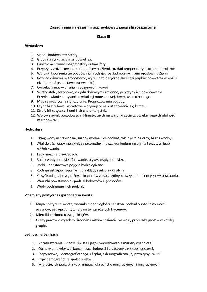 Zagadnienia na egzamin poprawkowy z geografii rozszerzonej Klasa III Atmosfera 1. 2. 3. 4. 5. 6. 7. 8. 9. 10. 11. 12. Skład i budowa atmosfery. Globalna cyrkulacja mas powietrza. Funkcje ochronne magnetosfery i atmosfery. Przyczyny zróżnicowania temperatury na Ziemi, rozkład temperatury, extrema termiczne. Warunki tworzenia się opadów i ich rodzaje, rozkład rocznych sum opadów na Ziemi. Rozkład ciśnienia w troposferze, wyże i niże baryczne. Kierunki prądów powietrza w wyżu i niżu ( umieć przedstawić na rysunku) Cyrkulacja mas w strefie międzyzwrotnikowej. Wiatry stałe, sezonowe, o cyklu dobowym i zmienne, przyczyny ich powstawania. Przedstawianie na rysunku cyrkulacji monsunowej, bryzy, wiatru halnego. Mapa synoptyczna i jej czytanie. Prognozowanie pogody. Czynniki strefowe i astrefowe wpływające na kształtowanie się klimatu. Strefy klimatyczne Ziemi i ich charakterystyka. Wpływ zjawisk pogodowych i klimatycznych na warunki życia człowieka i jego działalność w środowisku. Hydrosfera 1. Obieg wody w przyrodzie, zasoby wodne i ich podział, cykl hydrologiczny, bilans wodny. 2. Właściwości wody morskiej, ze szczególnym uwzględnieniem zasolenia i przyczyn jego zróżnicowania. 3. Typy mórz na przykładach. 4. Ruchy wody morskiej (falowanie, pływy, prądy morskie). 5. Rzeki – podstawowe pojęcia hydrologiczne. 6. Rodzaje ustrojów rzecznych, przykłady rzek przy każdym. 7. Klasyfikacja jezior wg różnych kryteriów ze szczególnym uwzględnieniem genezy powstania. 8. Warunki powstawania i podział lodowców i lądolodów. 9. Wody podziemne i ich podział. Przemiany polityczne i gospodarcze świata 1. Mapa polityczna świata, warunki niepodległości państwa, podział terytorialny mórz i oceanów, ustroje polityczne państw wg różnych kryteriów. 2. Mierniki poziomu rozwoju krajów. 3. Cechy państw o wysokim, średnim i niskim poziomie rozwoju, przykłady państw w każdej grupie. Ludność i urbanizacja 1. 2. 3. 4. 5. Rozmieszczenie ludności świata i jego uwarunkowania (bariery osadnicze) Obszary o największej koncentracji ludności i przyczyny tak dużej gęstości. Etapy rozwoju demograficznego, eksplozja demograficzna, jej przyczyny i skutki. Typy demograficzne społeczeństw. Migracje, ich podział, skutki migracji dla państw emigracyjnych i imigracyjnych 6. 7. 8. 9. Zróżnicowanie religijne i kulturowe ludności świata. Osadnictwo wiejskie, typy wsi. Miasta, ich funkcje i typy. Fazy urbanizacji, zróżnicowanie wskaźnika urbanizacji na świecie, typy zespołów miejskich. Znajomość mapy fizycznej obu Ameryk, Afryki i Australii oraz mapy politycznej świata w podanym zakresie. PAŃSTWA ŚWIATA AMERYKA PÓŁNOCNA wszystkie ze stolicami AMERYKA POŁUDNIOWA wszystkie należy pokazać, znać stolicę Brazylii i Argentyny, Kolumbii i Wenezueli. AFRYKA: bez stolic Maroko, Algieria, Libia, Tunezja, Egipt ( ze stolicą) Czad, Sudan, Niger, Nigeria, Etiopia, Demokratyczna Republika Kongo, Kenia, Tanzania, Angola, Namibia, Republika Południowej Afryki ( ze stolicą), Madagaskar, Somalia, Republika Środkowo - Afrykańska AZJA wszystkie pokazać, znać stolicę Indii, Chin, Pakistanu, Japonii, Iraku, Iranu, Indonezji, Malezji, Tajlandii. Europa wszystkie ze stolicami AUSTRALIA Nowa Zelandia Najludniejsze zespoły miejskie: Tokio, Czungking, Delhi, Nowy York, Szanghaj, Sao Paulo, Mumbaj, Pekin, Kalkuta, Karaczi, Buenos Aires, Los Angeles