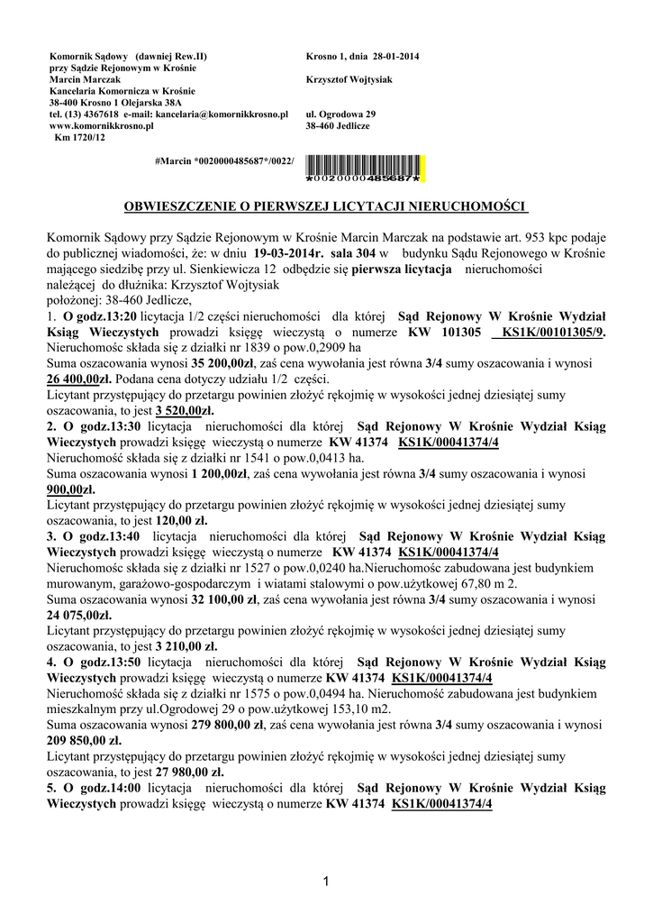 1 OBWIESZCZENIE O PIERWSZEJ LICYTACJI NIERUCHOMOŚCI