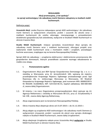 REGULAMIN Akcji promocyjnej „5 lat spokoju” na sprzęt wolnostojący i do zabudowy marki Siemens zakupiony w studiach mebli kuchennych. Definicje pojęć: Uczestnik Akcji: osoba fizyczna nabywająca sprzęt AGD wolnostojący i do zabudowy marki Siemens (z wyłączeniem zmywarek, pralek i suszarek do ubrań) wraz z meblami kuchennymi do użytku własnego, niezwiązanego z prowadzeniem działalności gospodarczej lub zawodowej, wyłącznie w Studiach Mebli Kuchennych w okresie trwania Akcji. Studio Mebli Kuchennych: miejsce sprzedaży Uczestnikowi Akcji sprzętu do zabudowy marki Siemens wraz z meblami kuchennymi, oferujące projekt oraz wykonanie mebli kuchennych wraz z montażem mebli i urządzeń, posiadające kuchnie wzorcowe, znajdujące się na terenie Rzeczpospolitej Polskiej. Sprzęt AGD do zabudowy – urządzenia elektryczne i elektroniczne przeznaczone dla gospodarstw domowych, których prawidłowe używanie wymaga wbudowania w meble oraz okapy. I. Postanowienia ogólne 1.1. Organizatorem Akcji jest BSH Sprzęt Gospodarstwa Domowego Sp. z o. o. z siedzibą w Warszawie, przy Al. Jerozolimskich 183, wpisaną do rejestru przedsiębiorców Krajowego Rejestru Sądowego prowadzonego przez Sąd Rejonowy dla m. stołecznego Warszawy w Warszawie, XII Wydział Gospodarczy Krajowego Rejestru Sądowego, pod numerem KRS: 0000023973 Nr REGON: 012604823, NIP: 524-010-46-41, kapitał zakładowy 300 000 000 zł, zwana dalej Organizatorem. 1.2. W imieniu i na rzecz Organizatora przeprowadzeniem Akcji zajmuje się A1 Agencja Reklamowa z siedzibą w Warszawie 00-131, przy ul. Grzybowskiej 4 lok 138 , zwana dalej Agencją Reklamową. 1.3. Akcja organizowana jest na terytorium Rzeczpospolitej Polskiej. 1.4. Okres trwania Akcji obejmuje okres od 15.07.2015 r. do 31.12.2015 r. 1.5. Akcją objęte są urządzenia AGD wolnostojące i do zabudowy marki Siemens (z wyłączeniem zmywarek, pralek i suszarek do ubrań oraz sprzętu drobnego) nabyte w Studiach Mebli Kuchennych, zwane dalej Urządzeniem. 1.6. Akcja obejmuje Urządzenia nabyte przez Uczestnika Akcji wyłącznie w Studiu Mebli Kuchennych w okresie trwania Akcji. 1.7. Dodatkowa, 3-letnia gwarancja na zakupione Urządzenie, zwana dalej Gwarancją, obejmuje wyłącznie terytorium Rzeczypospolitej Polskiej. Ta dodatkowa 3-letnia gwarancja stanowi gwarancję dodatkową w stosunku do standardowej 2-letniej gwarancji Organizatora (tj. 2-letnia standardowa gwarancja + 3-letnia dodatkowa gwarancja = 5-letnia gwarancja). II. 2.1. Warunki uczestnictwa w Akcji Akcja jest przeznaczona wyłącznie dla Uczestników Akcji, którzy w momencie wzięcia udziału w Akcji spełniają następujące warunki: a. ukończyli 18 rok życia, b. posiadają miejsce stałego zamieszkania na terytorium Rzeczypospolitej Polskiej, c. posiadają pełną zdolność do czynności prawnych, d. zapoznali się z treścią niniejszego Regulaminu i zaakceptowali jego postanowienia, e. dokonali zakupu Urządzenia oraz zakupu mebli kuchennych w okresie trwania Akcji wyłącznie w Studiu Mebli Kuchennych. Urządzenie jak i meble kuchenne muszą zostać zakupione w tym samym Studiu Mebli Kuchennych, f. dokonali zgłoszenia udziału w Akcji zgodnie z procedurą opisaną w pkt. 3.2 i 3.3 niniejszego Regulaminu. III. 3.1. 3.2. Zasady Akcji Uczestnik Akcji, który zakupi w terminie 15.07.2015 r. do 31.12.2015 r. w Studiu Mebli Kuchennych Urządzenie wraz z meblami kuchennymi i zgłosi swój udział w Akcji zgodnie z procedurą opisaną w pkt. 3.2 i 3.3 niniejszego Regulaminu otrzyma dodatkową, 3-letnią gwarancję na zakupione Urządzenie. Zgłoszenie udziału w Akcji, zwane dalej Zgłoszeniem, następuje poprzez (1) jednorazowe przesłanie listem poleconym na adres Agencji Reklamowej wskazany w pkt. 1.2. niniejszego Regulaminu z dopiskiem: „Gwarancje Siemens” następujących dokumentów: (i) poprawnie wypełnionego, (tj. zgodnie ze wskazaniami w pkt. 3.5 niniejszego Regulaminu) kuponu udziału w Akcji dostępnego na ulotce promocyjnej otrzymanej w Studiu Mebli Kuchennych oraz (ii) kopii dowodu zakupu Urządzenia i mebli kuchennych (np. faktury lub paragonu fiskalnego lub innego dowodu zakupu, na którym widnieje marka i model Urządzenia) albo poprzez (2) poprawne zarejestrowanie się (tj. zgodnie ze wskazaniami w pkt. 3.5. niniejszego Regulaminu), za pomocą formularza WWW znajdującego się na stronie www.gwarancje2plus3.pl wraz z załączeniem elektronicznej kopii dokumentów potwierdzających zakup Urządzenia i mebli kuchennych (np. faktury lub paragonu fiskalnego lub innego dowodu zakupu, na którym widnieje marka, model Urządzenia). Dowód zakupu Urządzenia Uczestnik Akcji jest zobowiązany przechowywać przez cały okres 5-letniej gwarancji. 3.3. Zgłoszenie musi zostać dokonane nie później niż jeden miesiąc od daty zakupu Urządzenia (decyduje data stempla pocztowego lub data rejestracji formularza na stronie WWW). 3.4. Ostateczny termin dla dokonania Zgłoszenia to 31 styczeń 2016 r. (decyduje data stempla pocztowego lub data rejestracji formularza na stronie WWW). 3.5. Prawidłowo wypełniony kupon/formularz rejestracyjny na stronie WWW powinien zawierać: a. dane osobowe Uczestnika Akcji w postaci imienia i nazwiska, daty urodzenia, adresu zamieszkania wraz z kodem pocztowym, numeru telefonu kontaktowego, adresu e-mail, własnoręcznego podpisu w przypadku kuponów rejestracyjnych, b. dane Studia Mebli Kuchennych, w którym został dokonany zakup Urządzenia i mebli kuchennych w postaci nazwy, adresu oraz nr NIP, c. symbole zakupionych Urządzeń. 3.6. Tylko Uczestnicy Akcji, którzy spełnią łącznie warunki określone w niniejszym Regulaminie nabywają prawo do skorzystania z 5-letniej gwarancji na Urządzenia. 3.7. Uczestnik Akcji, po spełnieniu wymogów określonych w niniejszym Regulaminie, w ciągu 4 miesięcy od daty doręczenia Zgłoszenia Agencji Reklamowej lub dokonania Zgłoszenia przez stronę WWW , otrzyma drogą pocztową Kartę Stałego Klienta, kt