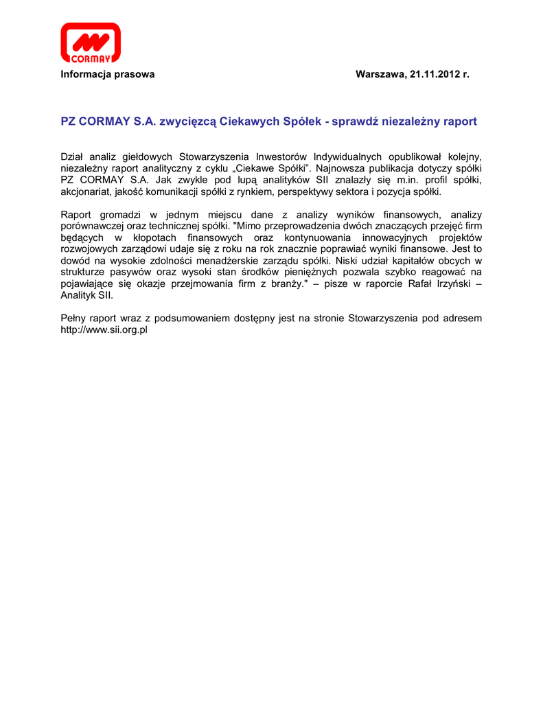 Informacja prasowa Warszawa, 21.11.2012 r. PZ CORMAY S.A. zwycięzcą Ciekawych Spółek - sprawdź niezależny raport Dział analiz giełdowych Stowarzyszenia Inwestorów Indywidualnych opublikował kolejny, niezależny raport analityczny z cyklu „Ciekawe Spółki”. Najnowsza publikacja dotyczy spółki PZ CORMAY S.A. Jak zwykle pod lupą analityków SII znalazły się m.in. profil spółki, akcjonariat, jakość komunikacji spółki z rynkiem, perspektywy sektora i pozycja spółki. Raport gromadzi w jednym miejscu dane z analizy wyników finansowych, analizy porównawczej oraz technicznej spółki. "Mimo przeprowadzenia dwóch znaczących przejęć firm będących w kłopotach finansowych oraz kontynuowania innowacyjnych projektów rozwojowych zarządowi udaje się z roku na rok znacznie poprawiać wyniki finansowe. Jest to dowód na wysokie zdolności menadżerskie zarządu spółki. Niski udział kapitałów obcych w strukturze pasywów oraz wysoki stan środków pieniężnych pozwala szybko reagować na pojawiające się okazje przejmowania firm z branży." – pisze w raporcie Rafał Irzyński – Analityk SII. Pełny raport wraz z podsumowaniem dostępny jest na stronie Stowarzyszenia pod adresem http://www.sii.org.pl