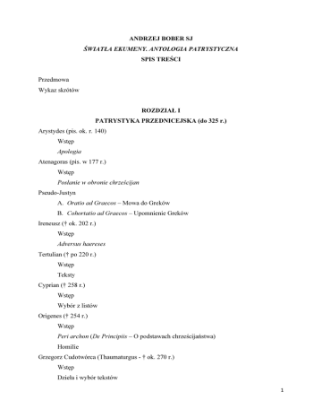 ANDRZEJ BOBER SJ ŚWIATŁA EKUMENY. ANTOLOGIA PATRYSTYCZNA SPIS TREŚCI Przedmowa Wykaz skrótów ROZDZIAŁ I PATRYSTYKA PRZEDNICEJSKA (do 325 r.) Arystydes (pis. ok. r. 140) Wstęp Apologia Atenagoras (pis. w 177 r.) Wstęp Posłanie w obronie chrześcijan Pseudo-Justyn A. Oratio ad Graecos – Mowa do Greków B. Cohortatio ad Graecos – Upomnienie Greków Ireneusz († ok. 202 r.) Wstęp Adversus haereses Tertulian († po 220 r.) Wstęp Teksty Cyprian († 258 r.) Wstęp Wybór z listów Origenes († 254 r.) Wstęp Peri archon (De Principiis – O podstawach chrześcijaństwa) Homilie Grzegorz Cudotwórca (Thaumaturgus - † ok. 270 r.) Wstęp Dzieła i wybór tekstów 1 Arnobiusz (pocz. IV w.) Wstęp Adversus nationes Acta Martyrum Sobór Nicejski (325 r.) Wstęp Symbol nicejski Kanony nicejskie List synodalny Ojców nicejskich Sobór nicejski w opinii potomnych ROZDZIAŁ II ZŁOTY WIEK PATRYSTYKI GRECKIEJ (325-451) Euzebiusz z Cezarei († ok. 339 r.) Wstęp Vita Constantini Atanazy († 373 r.) Wstęp Wybór z listów Apologia do cesarza Konstancjusza De virginitate Cyryl Jerozolimski († 386 r.) Wstęp Katechezy mistagogiczne Grzegorz z Nyssy († 394 r.) Wstęp Homilie o ośmiu błogosławieństwach Życie św. Makryny Palladiusz z Hellenopolis († przed 431 r.) Wstęp Historia Lusiaca Cyryl Aleksandryjski († 444 r.) Wstęp 2 Homilia IV: Ku chwale Maryi Bogarodzicy List 24 do Aleksandryjczyków Kontynuatorzy greccy Euzebiusza z Cezarei Wstęp Sokrates († ok. 450) Wstęp Historia Ecclesiastica Sozomenos († ok. 450 ) Wstęp Historia Ecclesiastica Teodoret z Kyrrhos († 458 r.) Wstęp Historia Ecclesiastica Pachomiusz († 348 r.) Wstęp Wybrane fragmenty Reguły św. Pachomiusza ROZDZIAŁ III ZŁOTY WIEK PATRYSTYKI ŁACIŃSKIEJ (325-451) Faustinus († po 384 r.) Wstęp De Trinitate Paulin z Mediolanu († po 422 r.) Wstęp Życie św. Ambrożego Ambroży († 397 r.) Wstęp De virginibus De virginitate De institutione virginis Wybór z innych dzieł Listy 3 Peregrinatio Aetheriae ad loca sancta (pis. 393-394) Wstęp Wybór tekstów Anastazy (papież 399-402 r.) Wstęp List o obrońcach wiary nicejskiej Rufin z Akwilei († 410 r.) Wstęp Exposition Symboli De benedictionibus patriarcharum Apologia contra Hieronymum Prolog do ksiąg Historii Euzebiusza Historia Kościelna Euzebiusza w rozszerzonym przekładzie Rufina Historia Ecclesiastica Wstępy Rufina do swych przekładów Ojców greckich Historia Monachorum Hieronim († 420 r.) Wstęp Wybór z dzieł różnych De viris inlustribus Maksym z Turynu († 408/23) Wstęp Wybór mów Mariusz Merkator († po 431 r.) Wstęp Pamiętnik o imieniu Celestiusza Augustyn († 430 r.) Wstęp Teksty z dzieł różnych Listy Celestyn (papież 422-432) Wstęp Wybór z listów 4 Piotr Chryzolog († 450 r.) Wstęp Wybór mów Fragment listu Tiro Prosper z Akwitanii († po 455) Wstęp Zarys kroniki Leon Wielki (papież 440 – 61) Wstęp ROZDZIAŁ IV SCHYŁEK PATRYSTYKI GRECKIEJ I POCZĄTEK LITERATURY TEOLOGICZNEJ W BIZANCJUM (w. VI-VIII) Kaznodziejstwo wczesnobizantyjskie Wstęp Grzegorz, Patriarcha Antiochii Piśmiennictwo ascetyczne w Palestynie VI w. – Barsanufiusz i Jan Wstęp Liber utilissimus Jan Moschos († 619 r.) Wstęp Łąka duchowna Grzegorz II (papież 715 – 31) Fragmenty listów Jan z Damaszku († ok. 750 r.) Wstęp De fide orthodoxa Adversus eos qui sacras imagines abiciunt ROZDZIAŁ V PATRYSTYKA ITALSKA (w. VI-VIII) Hormisdas (papież 514 – 23 r.) Wstęp Wyznanie wiary papieża Hormisdasa 5 Fragment listu: Powaga św. Augustyna Dionizy Mały († 545/50 r.) List do Eugipiusza kapłana. Wstęp do własnego przekładu dzieła Grzegorza z Nyssy pt.: De conditione seu opificio hominis (O stworzeniu człowieka) Jordanes, dziejopis Gotów (pisał w 551 r.) Wstęp Getica Kasjodor († ok. 583) Institutiones divinarum et humanarum lectionem Grzegorz Wielki (papież 590-604 r.) Wstęp Wybór pism Jonasz z Bobbio († ok. 660 r.) Wstęp Vita S. Columbani Paweł Diakon († 799 r.) Wstęp Historia Romana Historia Langobardorum Gesta episcoporum Mettensium Carmina ROZDZIAŁ VI OJCOWIE HISZPAŃSCY (w. V-VI) Bachiariusz († z pocz. V w.) Wstęp Libellus de fide Orozjusz (1 poł. V w.) Wstęp Historia adversus paganos Marcin z Bragi († 580 r.) Wstęp De correctione rusticorum 6 Licinianus z Kartageny († przed 602) Wstęp List trzeci: Przeciw tym co uwierzyli, że na ołtarz św. Piotra w bazylice w Rzymie spadł list z nieba Izydor z Sewilli († 636 r.) Wstęp De Ecclesiasticis Officiis Sententiarum Synonyma De viris inlustribus Fruktuozus († 665 r.) Wstęp Reguła monachorum Reguła communis Pactum Ildefons z Toledo († 667 r.) Wstęp De viris inlustribus ROZDZIAŁ VII PATRYSTYKA GALIJSKA (w. V-VIII) Sulpicjusz Sewerus († ok. 420 r.) Wstęp Kronika Życie św. Marcina Gennandiusz († przed 505 r.) Wstęp De viris inlustribus Cezary z Arles († 542 r.) Wstęp Sermones Grzegorz z Tours († 594 r.) Wstęp Historia Francorum 7 Miraculorum libri VIII Patrystyka Galijska VII w. Wstęp Dezydery z Cahors († 655 r.) Defenzor z Ligugé ROZDZIAŁ VIII AFRYKAŃCZYCY (w. VI) Ferrandus († 546 r.) Wstęp Vita S. Fulgentii Fulgencjusz z Ruspe († 533 r.) Wstęp De fide ad Petrum Kazania Poncjan (pisał 544/45 r.) Wstęp List do cesarza Justyniana o Trzech Rozdziałach ROZDZIAŁ IX PATRYSTYKA ANGLOSASKA (w. VI-VIII) Wstęp Adomnanus z Hy († 704 r.) Wstęp De locis sanctis (O miejscach świętych) Eddius Stephanus (VIII w.) Wstęp Vita S. Wilfridi Eboracensis (ok. 710 r.) Beda Wielebny († 735 r.) Wstęp Historia Ecclesiastica gentis Anglorum Historia Abbatum 8 ROZDZIAŁ X PIŚMIENNICTWO CHRZEŚCIJAŃSKIE W ETIOPII (w. IV-VII) Zarys ogólny patrystyki etiopskiej ROZDZIAŁ XI MUZA CHRZEŚCIJAŃSKA ANTOLOGIA POEZJI STAROCHRZEŚCIJAŃSKIEJ Wstęp ogólny Poezja grecka Wstęp Hymn wieczorny: Phos hilaron Klemens Aleksandryjski († przed 215 r.) Wstęp Pedagog Abercjusz Makary Egipcjanin († ok. 390 r.) Wstęp Modlitwa wi