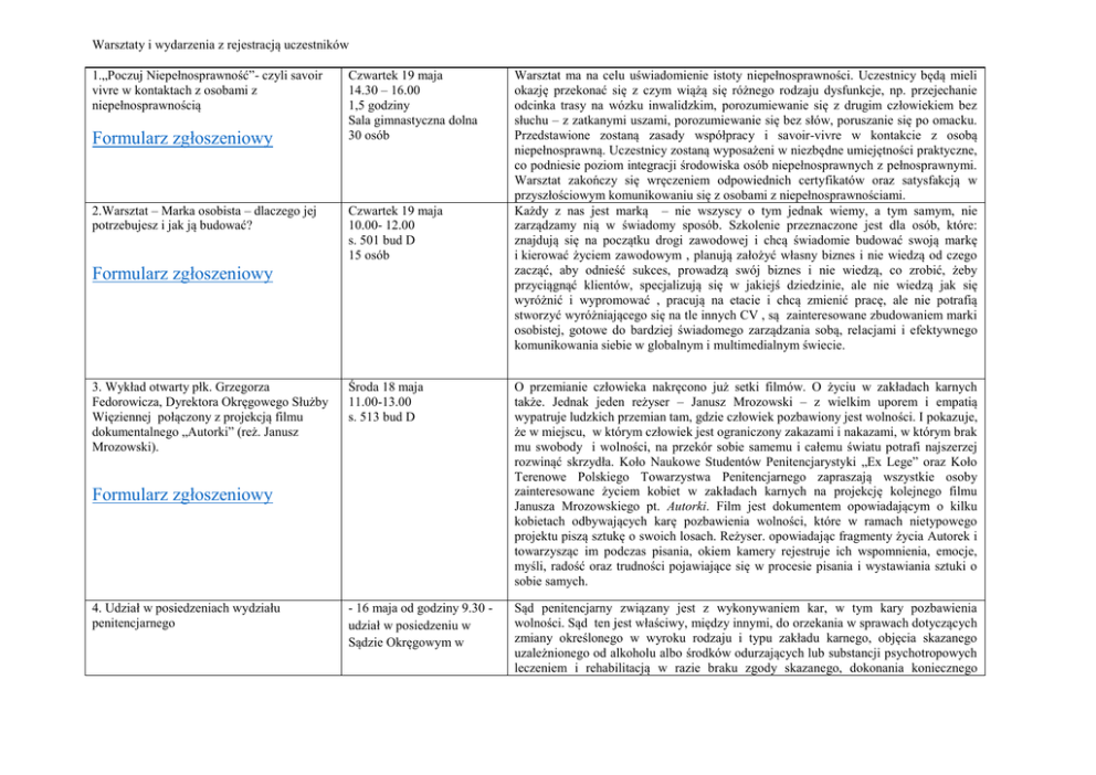 Warsztaty i wydarzenia z rejestracją uczestników 1.„Poczuj Niepełnosprawność”- czyli savoir vivre w kontaktach z osobami z niepełnosprawnością Formularz zgłoszeniowy 2.Warsztat – Marka osobista – dlaczego jej potrzebujesz i jak ją budować? Czwartek 19 maja 14.30 – 16.00 1,5 godziny Sala gimnastyczna dolna 30 osób Czwartek 19 maja 10.00- 12.00 s. 501 bud D 15 osób Formularz zgłoszeniowy 3. Wykład otwarty płk. Grzegorza Fedorowicza, Dyrektora Okręgowego Służby Więziennej połączony z projekcją filmu dokumentalnego „Autorki” (reż. Janusz Mrozowski). Środa 18 maja 11.00-13.00 s. 513 bud D O przemianie człowieka nakręcono już setki filmów. O życiu w zakładach karnych także. Jednak jeden reżyser – Janusz Mrozowski – z wielkim uporem i empatią wypatruje ludzkich przemian tam, gdzie człowiek pozbawiony jest wolności. I pokazuje, że w miejscu, w którym człowiek jest ograniczony zakazami i nakazami, w którym brak mu swobody i wolności, na przekór sobie samemu i całemu światu potrafi najszerzej rozwinąć skrzydła. Koło Naukowe Studentów Penitencjarystyki „Ex Lege” oraz Koło Terenowe Polskiego Towarzystwa Penitencjarnego zapraszają wszystkie osoby zainteresowane życiem kobiet w zakładach karnych na projekcję kolejnego filmu Janusza Mrozowskiego pt. Autorki. Film jest dokumentem opowiadającym o kilku kobietach odbywających karę pozbawienia wolności, które w ramach nietypowego projektu piszą sztukę o swoich losach. Reżyser. opowiadając fragmenty życia Autorek i towarzysząc im podczas pisania, okiem kamery rejestruje ich wspomnienia, emocje, myśli, radość oraz trudności pojawiające się w procesie pisania i wystawiania sztuki o sobie samych. - 16 maja od godziny 9.30 udział w posiedzeniu w Sądzie Okręgowym w Sąd penitencjarny związany jest z wykonywaniem kar, w tym kary pozbawienia wolności. Sąd ten jest właściwy, między innymi, do orzekania w sprawach dotyczących zmiany określonego w wyroku rodzaju i typu zakładu karnego, objęcia skazanego uzależnionego od alkoholu albo środków odurzających lub substancji psychotropowych leczeniem i rehabilitacją w razie braku zgody skazanego, dokonania koniecznego Formularz zgłoszeniowy 4. Udział w posiedzeniach wydziału penitencjarnego Warsztat ma na celu uświadomienie istoty niepełnosprawności. Uczestnicy będą mieli okazję przekonać się z czym wiążą się różnego rodzaju dysfunkcje, np. przejechanie odcinka trasy na wózku inwalidzkim, porozumiewanie się z drugim człowiekiem bez słuchu – z zatkanymi uszami, porozumiewanie się bez słów, poruszanie się po omacku. Przedstawione zostaną zasady współpracy i savoir-vivre w kontakcie z osobą niepełnosprawną. Uczestnicy zostaną wyposażeni w niezbędne umiejętności praktyczne, co podniesie poziom integracji środowiska osób niepełnosprawnych z pełnosprawnymi. Warsztat zakończy się wręczeniem odpowiednich certyfikatów oraz satysfakcją w przyszłościowym komunikowaniu się z osobami z niepełnosprawnościami. Każdy z nas jest marką – nie wszyscy o tym jednak wiemy, a tym samym, nie zarządzamy nią w świadomy sposób. Szkolenie przeznaczone jest dla osób, które: znajdują się na początku drogi zawodowej i chcą świadomie budować swoją markę i kierować życiem zawodowym , planują założyć własny biznes i nie wiedzą od czego zacząć, aby odnieść sukces, prowadzą swój biznes i nie wiedzą, co zrobić, żeby przyciągnąć klientów, specjalizują się w jakiejś dziedzinie, ale nie wiedzą jak się wyróżnić i wypromować , pracują na etacie i chcą zmienić pracę, ale nie potrafią stworzyć wyróżniającego się na tle innych CV , są zainteresowane zbudowaniem marki osobistej, gotowe do bardziej świadomego zarządzania sobą, relacjami i efektywnego komunikowania siebie w globalnym i multimedialnym świecie. Formularz zgłoszeniowy Poznaniu (20 osób) - 20 maja od godziny 8.30 udział w posiedzeniu w Sądzie Okręgowym w Poznaniu (20 osób) 5.„Virtual Quest - wirtualna rzeczywistość 3D” - 25 maja od godziny 9.30 udział w posiedzeniu w Sądzie Okręgowym w Poznaniu (20 osób). Czwartek 19 maja 12.00-14.00 s.308 bud D 24 osoby Formularz zgłoszeniowy 6.„Przestrze(I)nność” Formularz zgłoszeniowy 7.,,Spotkanie z Żywą Książką” Formularz zgłoszeniowy zabiegu lekarskiego w przypadku sprzeciwu skazanego, warunkowego przedterminowego zwolnienia, odwołania warunkowego zwolnienia. Każdy student uczestnicząc w posiedzeniach V Wydziału Penitencjarnego i Nadzoru nad Wykonywaniem Orzeczeń Karnych będzie mógł zapoznać się z działalnością sądu w praktyce. Udział w posiedzeniu sądu wiąże się również z wizytą w Sądzie Okręgowym w Poznaniu lub Oddziale Zewnętrznym Aresztu Śledczego w Poznaniu, a więc jest możliwością poznania specyfiki miejsc takich jak sąd i areszt śledczy. Virtual Quest, pierwsza w Europie galeria rzeczywistości wirtualnej zaprezentuje 2 własne produkcje 3D, przeznaczone do odtwarzania na zestawach VR Gear (firmy Samsung). Każdy trwa około 20 minut. Pierwszy to SeaQuest - podwodna podróż po świecie, który wciąż pozostaje mniej znany człowiekowi niż Układ Słoneczny i skrywa wiele tajemnic czekających na odkrycie. Widzowie poznają 6 morskich stworzeń: humbaka, błazenka, żółwia wodnego, rozdymkę, rekina, płaszczkę i ośmiornicę. Drugi seans, DinoQuest, to spotkanie z dinozaurami, które królowały na Ziemi przez 165 milionów lat. Na nowo, z “bliska” poznajemy Tyranozaura, Diplodoka, Triceratopsa, Ankylozaura, Pteranodona, Spinozaura i Parazuralofa. Na końcu każdego questa Widzowie maja do wykonania zadanie ruchowe, związane tematycznie z oglądanym seansem. Czwartek 19 maja 9.30 – 12.30 s.010 bud D 20 osób Warsztaty teatralne realizowane pod kątem percepcji przestrzeni oraz percepcji sztuki przez dwa główne zmysły: WZROK i SŁUCH. Całość zostanie podzielo