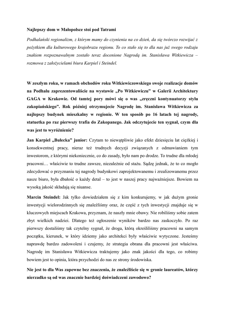Najlepszy dom w Małopolsce stoi pod Tatrami Podhalański regionalizm, z którym mamy do czynienia na co dzień, da się twórczo rozwijać z pożytkiem dla kulturowego krajobrazu regionu. To co stało się to dla nas już swego rodzaju znakiem rozpoznawalnym zostało teraz docenione Nagrodą im. Stanisława Witkiewicza – rozmowa z założycielami biura Karpiel i Steindel. W zeszłym roku, w ramach obchodów roku Witkiewiczowskiego swoje realizacje domów na Podhalu zaprezentowaliście na wystawie „Po Witkiewiczu” w Galerii Architektury GAGA w Krakowie. Od tamtej pory mówi się o was „zręczni kontynuatorzy stylu zakopiańskiego”. Rok później otrzymujecie Nagrodę im. Stanisława Witkiewicza za najlepszy budynek mieszkalny w regionie. W ten sposób po 16 latach tej nagrody, statuetka po raz pierwszy trafia do Zakopanego. Jak odczytujecie ten sygnał, czym dla was jest to wyróżnienie? Jan Karpiel „Bułecka” junior: Czytam to niewątpliwie jako efekt dziesięciu lat ciężkiej i konsekwentnej pracy, nieraz też trudnych decyzji związanych z odmawianiem tym inwestorom, z którymi niekoniecznie, co do zasady, było nam po drodze. To trudne dla młodej pracowni… właściwie to trudne zawsze, niezależnie od stażu. Sądzę jednak, że to co mogło zdecydować o przyznaniu tej nagrody budynkowi zaprojektowanemu i zrealizowanemu przez nasze biuro, była dbałość o każdy detal – to jest w naszej pracy najważniejsze. Bowiem na wysoką jakość składają się niuanse. Marcin Steindel: Jak tylko dowiedziałem się z kim konkurujemy, w jak dużym gronie inwestycji wielorodzinnych się znaleźliśmy oraz, że część z tych inwestycji znajduje się w kluczowych miejscach Krakowa, przyznam, że naszły mnie obawy. Nie robiliśmy sobie zatem zbyt wielkich nadziei. Dlatego też ogłoszenie wyników bardzo nas zaskoczyło. Po raz pierwszy dostaliśmy tak czytelny sygnał, że droga, którą określiliśmy pracowni na samym początku, kierunek, w który idziemy jako architekci były właściwie wytyczone. Jesteśmy naprawdę bardzo zadowoleni i czujemy, że strategia obrana dla pracowni jest właściwa. Nagrodę im Stanisława Witkiewicza traktujemy jako znak jakości dla tego, co robimy bowiem jest to opinia, która przychodzi do nas ze strony środowiska. Nie jest to dla Was zapewne bez znaczenia, że znaleźliście się w gronie laureatów, którzy nierzadko są od was znacznie bardziej doświadczeni zawodowo? JKB: Przede wszystkim w większości są to o wiele bardziej prestiżowe biura. Zastanawiałem się nad tym i dochodzę do wniosku, że ta nagroda porządkuje trochę myśli, które od dawna kłębiły się w mojej głowie. Wiesz, taki moment, zastanawiasz się dokąd to wszystko prowadzi, starasz się weryfikować wszystko na chłodno, ale tak naprawdę to niemożliwe, jesteś przecież w samym środku tego wszystkiego, pełen rozmaitych emocji. Aż tu nagle wszystko zaczyna wracać na właściwe tory. Nie chodzi – żebyś mnie źle nie zrozumiał – o arogancję, czy pychę, ale o swego rodzaju akceptację dla tego co robisz. Szczególnie jeśli słyszysz krytykę ze strony ludzi, którzy nie dopuszczają do siebie myśli, że architektura podlega ciągłym przemianom. Dziś widzę, że regionalizm, z którym mamy do czynienia na co dzień da się twórczo rozwijać z pożytkiem dla kulturowego krajobrazu regionu. Stało się to już w naszym biurze, swego rodzaju ewidentnym, rozpoznawalnym w poszczególnych realizacjach stylem, niezależnie do tego czy mówimy o projekcie domu jednorodzinnego, budynku handlowo-usługowego, hotelu czy biurowca. Mam świadomość tego, że my cały czas się uczymy, rozwijamy biuro w Zakopanem i Krakowie jednak, jeśli udaje ci się zrealizować taką inwestycję jak „Dom w Tatrach” i jeszcze doceniają cię za to profesjonaliści, a w głowie masz sto kolejnych pomysłów, które chciałeś zrealizować, to taka nagroda dodaje skrzydeł i jedyne, czego chciałbyś mieć więcej to czas na projektowanie. Sadząc po waszych dotychczasowych realizacjach, ale też po projektach, które pozostają nadal w trakcie budowy wyłania się obraz pracowni, która roztropnie podejmuje decyzje – a przecież na rynku polskim jesteście nadal względnie pracownią młodą. Skąd to opanowanie? MS: Już tłumaczę. Dobrych kilka lat temu rozszerzyliśmy zakres działań naszej pracowni o zakres prac budowlanych, realizując odtąd projekty w formie „projektuj i buduj”. Ten okres bardzo wiele nas nauczył zmieniając nasze podejście do projektowania. Architekt na etapie koncepcji i projektu nie operuje bowiem na materiałach. Już po pierwszych wizytach na budowie zdaliśmy sobie sprawę z szeregu ograniczeń czy problemów, które tam występują, mogąc istotnie wydłużyć proces realizacji prac. Dziś opracowując w biurze wizję nowego projektu potrafimy – już na tak wczesnym etapie - urealnić sobie te wyobrażenia w kontekście budowlanym. Wydaje mi się, że to doświadczenie sprawiło, że nagrodzony projekt „Domu w Tatrach” został zrealizowany w 99 proc. zgodnie z naszą dokumentacją projektową. Tak rozbudowany model projektowo-realizacyjny daje nam większą swobodę działań, inwestorowi z kolei gwarancję efektu, który ostatecznie uzyska. Podejmujemy się jednak wyłącznie budowy własnych projektów. I rzeczywiście, widzimy, że to zdaje egzamin. Pozostając w tej tematyce budowlanej, opowiedzcie w paru słowach czym właściwie wyróżnia się „Dom w Tatrach”. Poza walorami estetycznymi, które widać na pierwszy rzut oka jest w nim wiele elementów konstrukcyjnych, wpływających na charakter tego obiektu, które zapewne nie pozostały bez wpływu na decyzję sądu konkursowego w Krakowie? JKB: Obiekt oceniali profesjonaliści więc im zapewne łatwiej było zauważyć rozwiązania, które wpływają na wrażenie i odbiór bryły domu. Stanowi ona jeden spójny element konstrukcyjny. To nietypowe rozwi