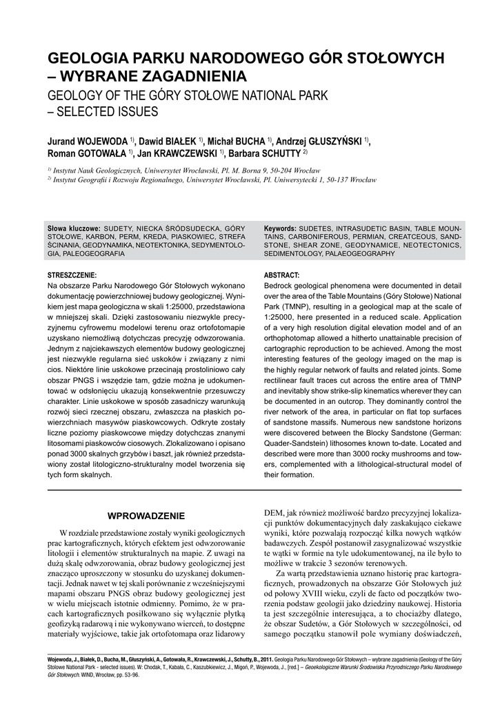 J. Wojewoda et al. 53 Geologia Parku Narodowego Gór Stołowych – wybrane zagadnienia Geology of the Góry Stołowe National Park – selected issues Jurand WOJEWODA 1), Dawid BIAŁEK 1), Michał BUCHA 1), Andrzej GŁUSZYŃSKI 1), Roman GOTOWAŁA 1), Jan KRAWCZEWSKI 1), Barbara SCHUTTY 2) 1) 2) Instytut Nauk Geologicznych, Uniwersytet Wrocławski, Pl. M. Borna 9, 50-204 Wrocław Instytut Geografii i Rozwoju Regionalnego, Uniwersytet Wrocławski, Pl. Uniwersytecki 1, 50-137 Wrocław Słowa kluczowe: Sudety, niecka śródsudecka, Góry Stołowe, karbon, perm, kreda, piaskowiec, strefa ścinania, geodynamika, neotektonika, sedymentologia, paleogeografia tains, Carboniferous, Permian, Creatceous, sandstone, shear zone, geodynamice, neotectonics, sedimentology, palaeogeography Streszczenie: Na obszarze Parku Narodowego Gór Stołowych wykonano dokumentację powierzchniowej budowy geologicznej. Wynikiem jest mapa geologiczna w skali 1:25000, przedstawiona w mniejszej skali. Dzięki zastosowaniu niezwykle precyzyjnemu cyfrowemu modelowi terenu oraz ortofotomapie uzyskano niemożliwą dotychczas precyzję odwzorowania. Jednym z najciekawszych elementów budowy geologicznej jest niezwykle regularna sieć uskoków i związany z nimi cios. Niektóre linie uskokowe przecinają prostoliniowo cały obszar PNGS i wszędzie tam, gdzie można je udokumentować w odsłonięciu ukazują konsekwentnie przesuwczy charakter. Linie uskokowe w sposób zasadniczy warunkują rozwój sieci rzecznej obszaru, zwłaszcza na płaskich powierzchniach masywów piaskowcowych. Odkryte zostały liczne poziomy piaskowcowe między dotychczas znanymi litosomami piaskowców ciosowych. Zlokalizowano i opisano ponad 3000 skalnych grzybów i baszt, jak również przedstawiony został litologiczno-strukturalny model tworzenia się tych form skalnych. Abstract: Bedrock geological phenomena were documented in detail over the area of the Table Mountains (Góry Stołowe) National Park (TMNP), resulting in a geological map at the scale of 1:25000, here presented in a reduced scale. Application of a very high resolution digital elevation model and of an orthophotomap allowed a hitherto unattainable precision of cartographic reproduction to be achieved. Among the most interesting features of the geology imaged on the map is the highly regular network of faults and related joints. Some rectilinear fault traces cut across the entire area of TMNP and inevitably show strike-slip kinematics wherever they can be documented in an outcrop. They dominantly control the river network of the area, in particular on flat top surfaces of sandstone massifs. Numerous new sandstone horizons were discovered between the Blocky Sandstone (German: Quader-Sandstein) lithosomes known to-date. Located and described were more than 3000 rocky mushrooms and towers, complemented with a lithological-structural model of their formation. WPROWADZENIE DEM, jak również możliwość bardzo precyzyjnej lokalizacji punktów dokumentacyjnych dały zaskakująco ciekawe wyniki, które pozwalają rozpocząć kilka nowych wątków badawczych. Zespół postanowił zasygnalizować wszystkie te wątki w formie na tyle udokumentowanej, na ile było to możliwe w trakcie 3 sezonów terenowych. Za wartą przedstawienia uznano historię prac kartograficznych, prowadzonych na obszarze Gór Stołowych już od połowy XVIII wieku, czyli de facto od początków tworzenia podstaw geologii jako dziedziny naukowej. Historia ta jest szczególnie interesująca, a to chociażby dlatego, że obszar Sudetów, a Gór Stołowych w szczególności, od samego początku stanowił pole wymiany doświadczeń, W rozdziale przedstawione zostały wyniki geologicznych prac kartograficznych, których efektem jest odwzorowanie litologii i elementów strukturalnych na mapie. Z uwagi na dużą skalę odwzorowania, obraz budowy geologicznej jest znacząco uproszczony w stosunku do uzyskanej dokumentacji. Jednak nawet w tej skali porównanie z wcześniejszymi mapami obszaru PNGS obraz budowy geologicznej jest w wielu miejscach istotnie odmienny. Pomimo, że w pracach kartograficznych posiłkowano się wyłącznie płytką geofizyką radarową i nie wykonywano wierceń, to dostępne materiały wyjściowe, takie jak ortofotomapa oraz lidarowy Keywords: Sudetes, Intrasudetic Basin, Table Moun- Wojewoda, J., Białek, D., Bucha, M., Głuszyński, A., Gotowała, R., Krawczewski, J., Schutty, B., 2011. Geologia Parku Narodowego Gór Stołowych – wybrane zagadnienia (Geology of the Góry Stolowe National Park - selected issues). W: Chodak, T., Kabała, C., Kaszubkiewicz, J., Migoń, P., Wojewoda, J., [red.] – Geoekologiczne Warunki Środowiska Przyrodniczego Parku Narodowego Gór Stołowych. WIND, Wrocław, pp. 53-96. 54 WYBRANE ELEMENTY BUDOWY GEOLOGICZNEJ GÓR STOŁOWYCH I OBSZARÓW PRZYLEGŁYCH... ale i konkurencji między geologami różnych narodowości, wywodzących się z różnych szkół i dysponujących różnymi metodami. Większość geologów-kartografów pracujących na tym obszarze była związana z uczelniami Wrocławia, Berlina, Pragi i Wiednia. Wielu z nich to wybitne postacie w geologii światowej. Za podstawowe i konieczne dla przedstawienia uznano opisy litologiczne skał podłoża paleozoicznego, w tym opisy skał metamorficznych i magmowych tzw. masywu Kudowy. Następnie, przedstawiono litologię oraz cechy sedymentologiczne osadów paleozoicznych i mezozoicznych, w szczególności utworów górnego karbonu, permu oraz kredy. Utwory te stanowiły podstawę dla wydzieleń kartograficznych na przeważającym obszarze PNGS, zwłaszcza na obszarze synklinorium śródsudeckiego. Omówione zostały przyczyny i uwarunkowania płytowej budowy Gór Stołowych oraz szczególnie charakterystyczne dla ich krajobrazu wybrane formy skalne: grzyby, baszty, bastiony, kawerny oraz labirynty. Omówiono również przesłanki geodynamiki obszaru od etapu sedymentacji w kredzie, poprzez inwersję po współczesn