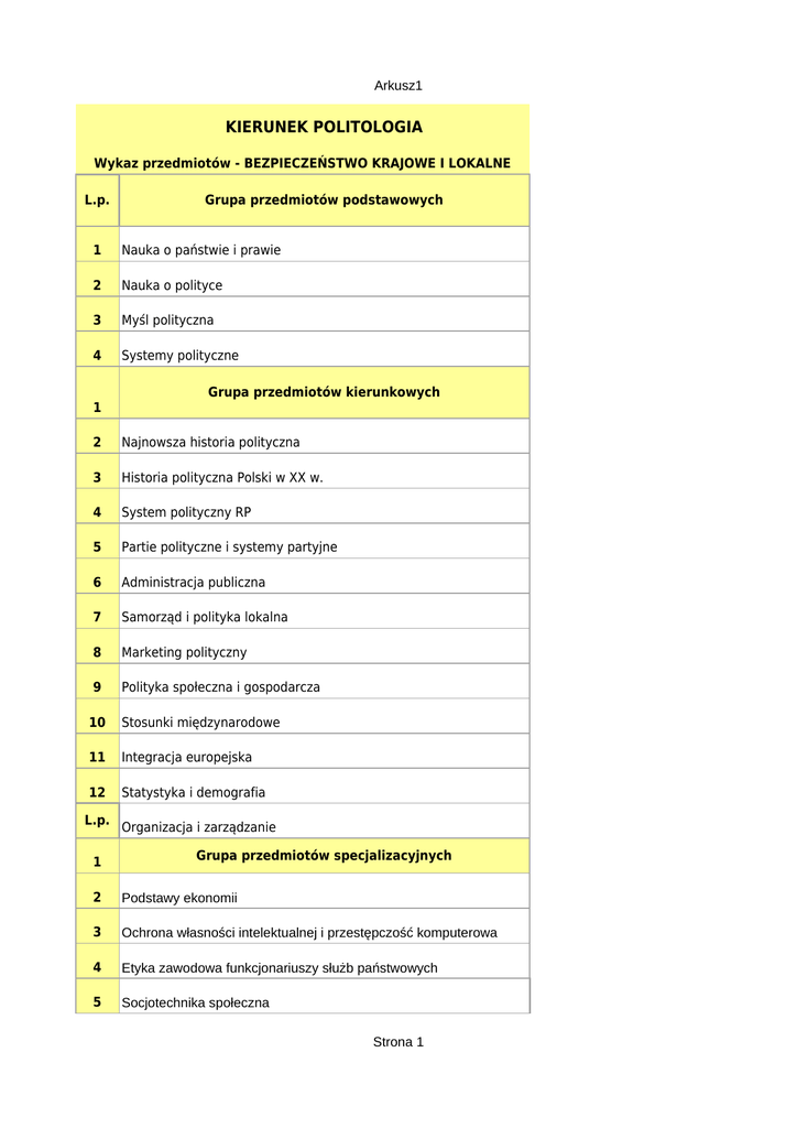 Arkusz1 KIERUNEK POLITOLOGIA Wykaz przedmiotów - BEZPIECZEŃSTWO KRAJOWE I LOKALNE L.p. Grupa przedmiotów podstawowych 1 Nauka o państwie i prawie 2 Nauka o polityce 3 Myśl polityczna 4 Systemy polityczne 1 Grupa przedmiotów kierunkowych 2 Najnowsza historia polityczna 3 Historia polityczna Polski w XX w. 4 System polityczny RP 5 Partie polityczne i systemy partyjne 6 Administracja publiczna 7 Samorząd i polityka lokalna 8 Marketing polityczny 9 Polityka społeczna i gospodarcza 10 Stosunki międzynarodowe 11 Integracja europejska 12 Statystyka i demografia L.p. 1 Organizacja i zarządzanie Grupa przedmiotów specjalizacyjnych 2 Podstawy ekonomii 3 Ochrona własności intelektualnej i przestępczość komputerowa 4 Etyka zawodowa funkcjonariuszy służb państwowych 5 Socjotechnika społeczna Strona 1 Arkusz1 6 Psychologia konfliktu i negocjacje 7 Język obcy 8 Technologia informatyczna 9 Wykład monograficzny 10 Obrona cywilna i współpraca cywilno-wojskowa 11 Seminarium licencjackie 12 Podstawy prawne ochrony osób i mienia 13 Ustrój organów ochrony prawnej 14 Współczesny terroryzm i jego zwalczanie 15 Kryminalistyka i kryminologia 16 Instytucjonalny system ochrony 17 Europejska integracja polityczna 18 System działań antykryzysowych 19 Bezpieczeństwo narodowe i międzynarodowe 20 Międzynarodowe prawo publiczne 21 Bezpieczeństwo ekologiczne 22 Polityka zagraniczna RP 23 Ochrona praw człowieka 24 Prawo karne materialne i procesowe 25 Bezpieczeństwo imprez masowych 26 Taktyka i techniki interwencji 27 Ratownictwo medyczne 28 Służby specjalne i działania antyterrorystyczne 29 Wyszkolenie strzeleckie 30 Praktyki zawodowe 31 wychowanie fizyczne Strona 2