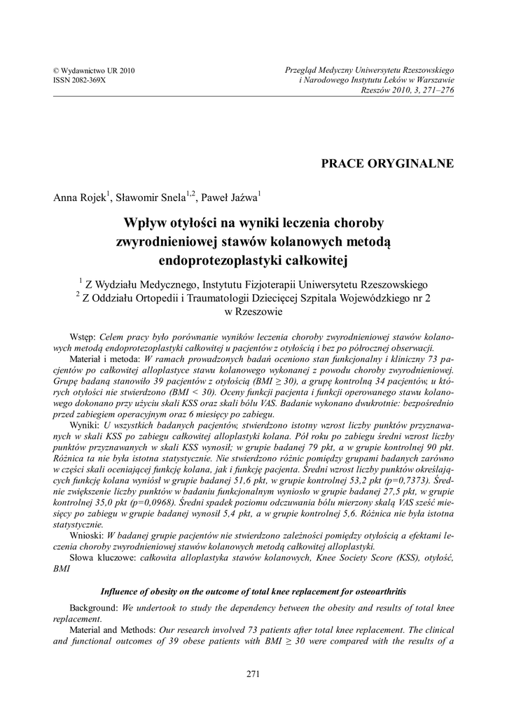 Przegląd Medyczny Uniwersytetu Rzeszowskiego i Narodowego Instytutu Leków w Warszawie Rzeszów 2010, 3, 271–276 © Wydawnictwo UR 2010 ISSN 2082-369X PRACE ORYGINALNE Anna Rojek1, Sławomir Snela1,2, Paweł Jaźwa1 Wpływ otyłości na wyniki leczenia choroby zwyrodnieniowej stawów kolanowych metodą endoprotezoplastyki całkowitej 1 2 Z Wydziału Medycznego, Instytutu Fizjoterapii Uniwersytetu Rzeszowskiego Z Oddziału Ortopedii i Traumatologii Dziecięcej Szpitala Wojewódzkiego nr 2 w Rzeszowie Wstęp: Celem pracy było porównanie wyników leczenia choroby zwyrodnieniowej stawów kolanowych metodą endoprotezoplastyki całkowitej u pacjentów z otyłością i bez po półrocznej obserwacji. Materiał i metoda: W ramach prowadzonych badań oceniono stan funkcjonalny i kliniczny 73 pacjentów po całkowitej alloplastyce stawu kolanowego wykonanej z powodu choroby zwyrodnieniowej. Grupę badaną stanowiło 39 pacjentów z otyłością (BMI ≥ 30), a grupę kontrolną 34 pacjentów, u których otyłości nie stwierdzono (BMI < 30). Oceny funkcji pacjenta i funkcji operowanego stawu kolanowego dokonano przy użyciu skali KSS oraz skali bólu VAS. Badanie wykonano dwukrotnie: bezpośrednio przed zabiegiem operacyjnym oraz 6 miesięcy po zabiegu. Wyniki: U wszystkich badanych pacjentów, stwierdzono istotny wzrost liczby punktów przyznawanych w skali KSS po zabiegu całkowitej alloplastyki kolana. Pół roku po zabiegu średni wzrost liczby punktów przyznawanych w skali KSS wynosił; w grupie badanej 79 pkt, a w grupie kontrolnej 90 pkt. Różnica ta nie była istotna statystycznie. Nie stwierdzono różnic pomiędzy grupami badanych zarówno w części skali oceniającej funkcję kolana, jak i funkcję pacjenta. Średni wzrost liczby punktów określających funkcję kolana wyniósł w grupie badanej 51,6 pkt, w grupie kontrolnej 53,2 pkt (p=0,7373). Średnie zwiększenie liczby punktów w badaniu funkcjonalnym wyniosło w grupie badanej 27,5 pkt, w grupie kontrolnej 35,0 pkt (p=0,0968). Średni spadek poziomu odczuwania bólu mierzony skalą VAS sześć miesięcy po zabiegu w grupie badanej wynosił 5,4 pkt, a w grupie kontrolnej 5,6. Różnica nie była istotna statystycznie. Wnioski: W badanej grupie pacjentów nie stwierdzono zależności pomiędzy otyłością a efektami leczenia choroby zwyrodnieniowej stawów kolanowych metodą całkowitej alloplastyki. Słowa kluczowe: całkowita alloplastyka stawów kolanowych, Knee Society Score (KSS), otyłość, BMI Influence of obesity on the outcome of total knee replacement for osteoarthritis Background: We undertook to study the dependency between the obesity and results of total knee replacement. Material and Methods: Our research involved 73 patients after total knee replacement. The clinical and functional outcomes of 39 obese patients with BMI ≥ 30 were compared with the results of a 271 matched group of 34 patients with BMI < 30. The Knee Society Score and pain scale (VAS) were used to assess function of patient and function of operated knee. The patients were examined twice: at baseline before the surgery and 6 months after surgery, as follow-up. Results: There was a statistically significant increase of KSS scores after surgery in all patients. Average increase was 79 scores in obese patients and 90 scores in nonobese patients. There wasn’t a statistically significant difference between obese and nonobese patients in postoperative KSS score. There was significant increase of Knee Score and Functional Score in both groups of patients. Average increase of Knee Score was 51,6 points in obese and 53,2 points in nonobese patients. The Functional Score rose 27,5 points in obese and 35,0 points in nonobese. There was no statistical difference in obese and nonobese between the improvement in scores. Average improvement in pain feeling (VAS) was similar in both groups. Conclusions: There wasn’t statistically significant correlation between obesity and results of total knee replacement. Key words: total knee replacement, Knee Society Score (KSS), obesity, BMI nego stawu i sprawności pacjenta pomiędzy osobami z otyłością i bez niej. Głównym celem pracy było porównanie efektów leczenia choroby zwyrodnieniowej stawów kolanowych metodą endoprotezoplastyki całkowitej u pacjentów z otyłością i bez. WSTĘP Choroba zwyrodnieniowa stawów jest najczęstszą chorobą stawów we współczesnym świecie [1, 2, 3]. Największe znaczenie kliniczne mają zmiany zwyrodnieniowe zlokalizowane w stawach kolanowych, biodrowych i stawach kręgosłupa, gdyż postępująca ich degeneracja prowadzi do niepełnosprawności pacjenta. Staw kolanowy, po kręgosłupie i stawie biodrowym, jest trzecim miejscem co do częstości występowania zmian zwyrodnieniowych [4]. W Polsce u ponad 8 milionów ludzi stwierdza się chorobę zwyrodnieniową stawów, z czego 25% dotyczy stawu kolanowego [5]. Postępująca gonartroza z ograniczeniem ruchomości, deformacjami i nasilającym się bólem stawu jest główną przyczyną alloplastyki całkowitej kolana. Silna korelacja pomiędzy otyłością a ryzykiem rozwoju [3, 6, 7, 8, 9, 10, 11] i szybkością postępu artrozy kolana [3, 9, 10, 12] sprawia, że u wielu chorych kwalifikowanych do zabiegu endoprotezoplastyki, wskaźnik masy ciała (BMI) przekracza normę. Według prognoz WHO w 2015 roku około 2,3 biliona dorosłych ludzi na świecie będzie miało nadwagę, a u ponad 700 milionów rozwinie się otyłość. Przy wzrastającej liczbie osób z nadwagą i otyłością oraz starzejącym się społeczeństwie należy spodziewać się wzrostu liczby osób ze zwiększoną masą ciała, kwalifikowanych do operacyjnego leczenia choroby zwyrodnieniowej stawów kolanowych. W piśmiennictwie nie ma jednoznacznej odpowiedzi na pytanie: czy otyłość wpływa na wyniki leczenia choroby zwyrodnieniowej stawu kolanowego metodą endoprotezoplastyki całkowitej? Niektórzy autorzy [13, 14, 15] uważają, że zwi