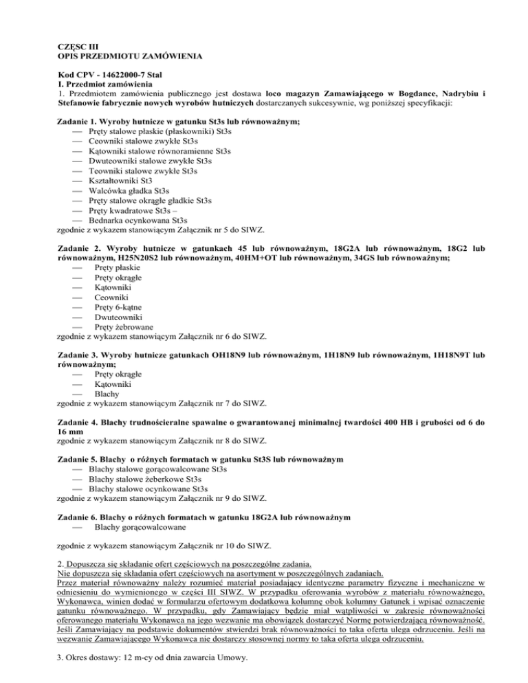 CZĘSC III OPIS PRZEDMIOTU ZAMÓWIENIA Kod CPV - 14622000-7 Stal I. Przedmiot zamówienia 1. Przedmiotem zamówienia publicznego jest dostawa loco magazyn Zamawiającego w Bogdance, Nadrybiu i Stefanowie fabrycznie nowych wyrobów hutniczych dostarczanych sukcesywnie, wg poniższej specyfikacji: Zadanie 1. Wyroby hutnicze w gatunku St3s lub równoważnym; Pręty stalowe płaskie (płaskowniki) St3s Ceowniki stalowe zwykłe St3s Kątowniki stalowe równoramienne St3s Dwuteowniki stalowe zwykłe St3s Teowniki stalowe zwykłe St3s Kształtowniki St3 Walcówka gładka St3s Pręty stalowe okrągłe gładkie St3s Pręty kwadratowe St3s – Bednarka ocynkowana St3s zgodnie z wykazem stanowiącym Załącznik nr 5 do SIWZ. Zadanie 2. Wyroby hutnicze w gatunkach 45 lub równoważnym, 18G2A lub równoważnym, 18G2 lub równoważnym, H25N20S2 lub równoważnym, 40HM+OT lub równoważnym, 34GS lub równoważnym; Pręty płaskie Pręty okrągłe Kątowniki Ceowniki Pręty 6-kątne Dwuteowniki Pręty żebrowane zgodnie z wykazem stanowiącym Załącznik nr 6 do SIWZ. Zadanie 3. Wyroby hutnicze gatunkach OH18N9 lub równoważnym, 1H18N9 lub równoważnym, 1H18N9T lub równoważnym; Pręty okrągłe Kątowniki Blachy zgodnie z wykazem stanowiącym Załącznik nr 7 do SIWZ. Zadanie 4. Blachy trudnościeralne spawalne o gwarantowanej minimalnej twardości 400 HB i grubości od 6 do 16 mm zgodnie z wykazem stanowiącym Załącznik nr 8 do SIWZ. Zadanie 5. Blachy o różnych formatach w gatunku St3S lub równoważnym Blachy stalowe gorącowalcowane St3s Blachy stalowe żeberkowe St3s Blachy stalowe ocynkowane St3s zgodnie z wykazem stanowiącym Załącznik nr 9 do SIWZ. Zadanie 6. Blachy o różnych formatach w gatunku 18G2A lub równoważnym Blachy gorącowalcowane zgodnie z wykazem stanowiącym Załącznik nr 10 do SIWZ. 2. Dopuszcza się składanie ofert częściowych na poszczególne zadania. Nie dopuszcza się składania ofert częściowych na asortyment w poszczególnych zadaniach. Przez materiał równoważny należy rozumieć materiał posiadający identyczne parametry fizyczne i mechaniczne w odniesieniu do wymienionego w części III SIWZ. W przypadku oferowania wyrobów z materiału równoważnego, Wykonawca, winien dodać w formularzu ofertowym dodatkowa kolumnę obok kolumny Gatunek i wpisać oznaczenie gatunku równoważnego. W przypadku, gdy Zamawiający będzie miał wątpliwości w zakresie równoważności oferowanego materiału Wykonawca na jego wezwanie ma obowiązek dostarczyć Normę potwierdzającą równoważność. Jeśli Zamawiający na podstawie dokumentów stwierdzi brak równoważności to taka oferta ulega odrzuceniu. Jeśli na wezwanie Zamawiającego Wykonawca nie dostarczy stosownej normy to taka oferta ulega odrzuceniu. 3. Okres dostawy: 12 m-cy od dnia zawarcia Umowy. 4. Realizacja dostaw odbywać się będzie na podstawie zamówień okresowych wysyłanych pocztą, faksem lub emailem, w terminach określonych w ofercie przetargowej. 5. Zamawiający zastrzega sobie prawo do niepełnego wykorzystania ilości wyrobów hutniczych w okresie obowiązywania umowy i do swobodnego wyboru poszczególnych wyrobów hutniczych zamówionych w ramach umowy, przy czym minimalna ilość wyrobów hutniczych zamówionych w ramach umowy nie może być niższa niż 30% maksymalnej wartości umowy. II Wymagania: 1. Oferowane wyroby hutnicze muszą: a) być fabrycznie nowe, b) spełniać wymagania aktualnie obowiązujących norm. c) posiadać gwarancje: min 12 m-cy od daty dostawy. d) posiadać atest hutniczy. 2. Termin realizacji każdorazowego zamówienia okresowego: maksymalnie do 30 dni 3. Oferta powinna zawierać między innymi: a) Cennik podstawowy w PLN wyrobów hutniczych wymienionych w Załącznikach 5-10 do SIWZ sporządzony zgodnie z układem tabelarycznym przekazanym przez Zamawiającego w wersji papierowej i elektronicznej (w arkuszu MS EXCEL). b) Cennik uzupełniający w PLN wyrobów hutniczych niewymienionych w Załącznikach 5-10 do SIWZ, a oferowanych przez Dostawcę, zgodnie z układem tabelarycznym przekazanym przez Zamawiającego (załącznik nr 11 do SIWZ) w wersji papierowej i elektronicznej (w arkuszu kalkulacyjnym MS EXCEL). c) Warunki gwarancji. d) Termin realizacji zamówień okresowych (w dniach od otrzymania zamówienia). e) Wzory dokumentów dostarczanych z dostawą: świadectwo jakości, atest hutniczy. Informacji udziela Bajda Jolanta (81) 462 5298